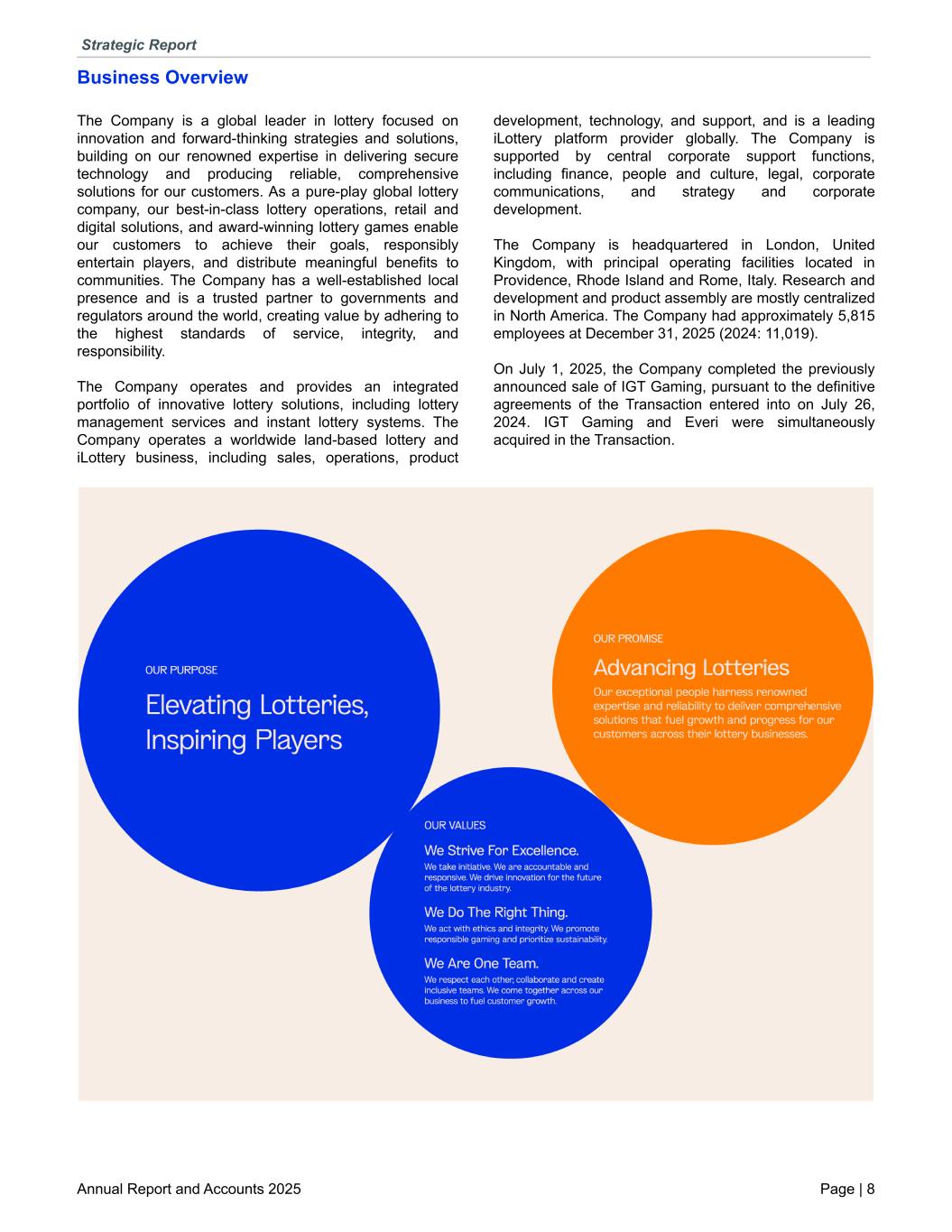 Business Overview The Company is a global leader in lottery focused on innovation and forward-thinking strategies and solutions, building on our renowned expertise in delivering secure technology and producing reliable, comprehensive solutions for our customers. As a pure-play global lottery company, our best-in-class lottery operations, retail and digital solutions, and award-winning lottery games enable our customers to achieve their goals, responsibly entertain players, and distribute meaningful benefits to communities. The Company has a well-established local presence and is a trusted partner to governments and regulators around the world, creating value by adhering to the highest standards of service, integrity, and responsibility. The Company operates and provides an integrated portfolio of innovative lottery solutions, including lottery management services and instant lottery systems. The Company operates a worldwide land-based lottery and iLottery business, including sales, operations, product development, technology, and support, and is a leading iLottery platform provider globally. The Company is supported by central corporate support functions, including finance, people and culture, legal, corporate communications, and strategy and corporate development. The Company is headquartered in London, United Kingdom, with principal operating facilities located in Providence, Rhode Island and Rome, Italy. Research and development and product assembly are mostly centralized in North America. The Company had approximately 5,815 employees at December 31, 2025 (2024: 11,019). On July 1, 2025, the Company completed the previously announced sale of IGT Gaming, pursuant to the definitive agreements of the Transaction entered into on July 26, 2024. IGT Gaming and Everi were simultaneously acquired in the Transaction. Strategic Report Annual Report and Accounts 2025 Page | 8