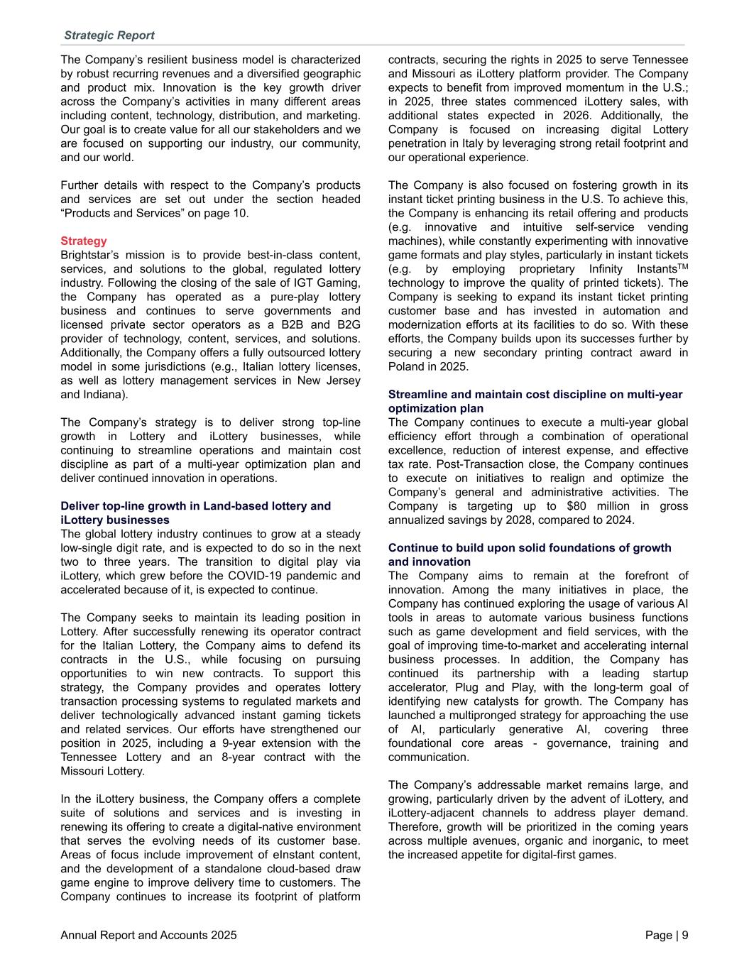 The Company’s resilient business model is characterized by robust recurring revenues and a diversified geographic and product mix. Innovation is the key growth driver across the Company’s activities in many different areas including content, technology, distribution, and marketing. Our goal is to create value for all our stakeholders and we are focused on supporting our industry, our community, and our world. Further details with respect to the Company’s products and services are set out under the section headed “Products and Services” on page 10. Strategy Brightstar’s mission is to provide best-in-class content, services, and solutions to the global, regulated lottery industry. Following the closing of the sale of IGT Gaming, the Company has operated as a pure-play lottery business and continues to serve governments and licensed private sector operators as a B2B and B2G provider of technology, content, services, and solutions. Additionally, the Company offers a fully outsourced lottery model in some jurisdictions (e.g., Italian lottery licenses, as well as lottery management services in New Jersey and Indiana). The Company’s strategy is to deliver strong top-line growth in Lottery and iLottery businesses, while continuing to streamline operations and maintain cost discipline as part of a multi-year optimization plan and deliver continued innovation in operations. Deliver top-line growth in Land-based lottery and iLottery businesses The global lottery industry continues to grow at a steady low-single digit rate, and is expected to do so in the next two to three years. The transition to digital play via iLottery, which grew before the COVID-19 pandemic and accelerated because of it, is expected to continue. The Company seeks to maintain its leading position in Lottery. After successfully renewing its operator contract for the Italian Lottery, the Company aims to defend its contracts in the U.S., while focusing on pursuing opportunities to win new contracts. To support this strategy, the Company provides and operates lottery transaction processing systems to regulated markets and deliver technologically advanced instant gaming tickets and related services. Our efforts have strengthened our position in 2025, including a 9-year extension with the Tennessee Lottery and an 8-year contract with the Missouri Lottery. In the iLottery business, the Company offers a complete suite of solutions and services and is investing in renewing its offering to create a digital-native environment that serves the evolving needs of its customer base. Areas of focus include improvement of eInstant content, and the development of a standalone cloud-based draw game engine to improve delivery time to customers. The Company continues to increase its footprint of platform contracts, securing the rights in 2025 to serve Tennessee and Missouri as iLottery platform provider. The Company expects to benefit from improved momentum in the U.S.; in 2025, three states commenced iLottery sales, with additional states expected in 2026. Additionally, the Company is focused on increasing digital Lottery penetration in Italy by leveraging strong retail footprint and our operational experience. The Company is also focused on fostering growth in its instant ticket printing business in the U.S. To achieve this, the Company is enhancing its retail offering and products (e.g. innovative and intuitive self-service vending machines), while constantly experimenting with innovative game formats and play styles, particularly in instant tickets (e.g. by employing proprietary Infinity InstantsTM technology to improve the quality of printed tickets). The Company is seeking to expand its instant ticket printing customer base and has invested in automation and modernization efforts at its facilities to do so. With these efforts, the Company builds upon its successes further by securing a new secondary printing contract award in Poland in 2025. Streamline and maintain cost discipline on multi-year optimization plan The Company continues to execute a multi-year global efficiency effort through a combination of operational excellence, reduction of interest expense, and effective tax rate. Post-Transaction close, the Company continues to execute on initiatives to realign and optimize the Company’s general and administrative activities. The Company is targeting up to $80 million in gross annualized savings by 2028, compared to 2024. Continue to build upon solid foundations of growth and innovation The Company aims to remain at the forefront of innovation. Among the many initiatives in place, the Company has continued exploring the usage of various AI tools in areas to automate various business functions such as game development and field services, with the goal of improving time-to-market and accelerating internal business processes. In addition, the Company has continued its partnership with a leading startup accelerator, Plug and Play, with the long-term goal of identifying new catalysts for growth. The Company has launched a multipronged strategy for approaching the use of AI, particularly generative AI, covering three foundational core areas - governance, training and communication. The Company’s addressable market remains large, and growing, particularly driven by the advent of iLottery, and iLottery-adjacent channels to address player demand. Therefore, growth will be prioritized in the coming years across multiple avenues, organic and inorganic, to meet the increased appetite for digital-first games. Strategic Report Annual Report and Accounts 2025 Page | 9