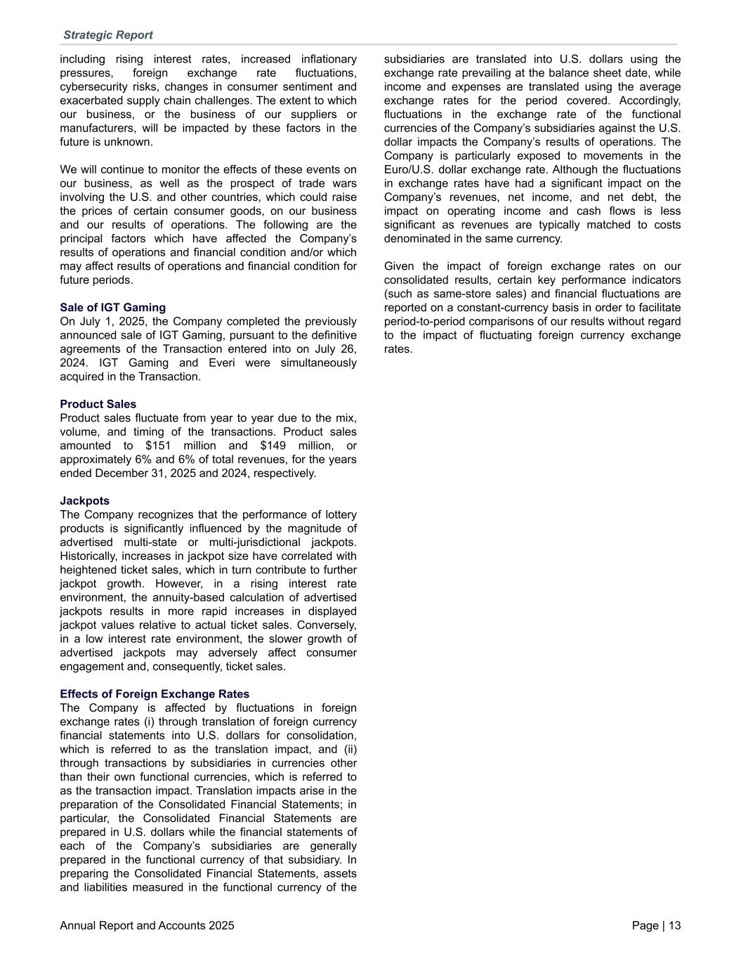 including rising interest rates, increased inflationary pressures, foreign exchange rate fluctuations, cybersecurity risks, changes in consumer sentiment and exacerbated supply chain challenges. The extent to which our business, or the business of our suppliers or manufacturers, will be impacted by these factors in the future is unknown. We will continue to monitor the effects of these events on our business, as well as the prospect of trade wars involving the U.S. and other countries, which could raise the prices of certain consumer goods, on our business and our results of operations. The following are the principal factors which have affected the Company’s results of operations and financial condition and/or which may affect results of operations and financial condition for future periods. Sale of IGT Gaming On July 1, 2025, the Company completed the previously announced sale of IGT Gaming, pursuant to the definitive agreements of the Transaction entered into on July 26, 2024. IGT Gaming and Everi were simultaneously acquired in the Transaction. Product Sales Product sales fluctuate from year to year due to the mix, volume, and timing of the transactions. Product sales amounted to $151 million and $149 million, or approximately 6% and 6% of total revenues, for the years ended December 31, 2025 and 2024, respectively. Jackpots The Company recognizes that the performance of lottery products is significantly influenced by the magnitude of advertised multi-state or multi-jurisdictional jackpots. Historically, increases in jackpot size have correlated with heightened ticket sales, which in turn contribute to further jackpot growth. However, in a rising interest rate environment, the annuity-based calculation of advertised jackpots results in more rapid increases in displayed jackpot values relative to actual ticket sales. Conversely, in a low interest rate environment, the slower growth of advertised jackpots may adversely affect consumer engagement and, consequently, ticket sales. Effects of Foreign Exchange Rates The Company is affected by fluctuations in foreign exchange rates (i) through translation of foreign currency financial statements into U.S. dollars for consolidation, which is referred to as the translation impact, and (ii) through transactions by subsidiaries in currencies other than their own functional currencies, which is referred to as the transaction impact. Translation impacts arise in the preparation of the Consolidated Financial Statements; in particular, the Consolidated Financial Statements are prepared in U.S. dollars while the financial statements of each of the Company’s subsidiaries are generally prepared in the functional currency of that subsidiary. In preparing the Consolidated Financial Statements, assets and liabilities measured in the functional currency of the subsidiaries are translated into U.S. dollars using the exchange rate prevailing at the balance sheet date, while income and expenses are translated using the average exchange rates for the period covered. Accordingly, fluctuations in the exchange rate of the functional currencies of the Company’s subsidiaries against the U.S. dollar impacts the Company’s results of operations. The Company is particularly exposed to movements in the Euro/U.S. dollar exchange rate. Although the fluctuations in exchange rates have had a significant impact on the Company’s revenues, net income, and net debt, the impact on operating income and cash flows is less significant as revenues are typically matched to costs denominated in the same currency. Given the impact of foreign exchange rates on our consolidated results, certain key performance indicators (such as same-store sales) and financial fluctuations are reported on a constant-currency basis in order to facilitate period-to-period comparisons of our results without regard to the impact of fluctuating foreign currency exchange rates. Strategic Report Annual Report and Accounts 2025 Page | 13