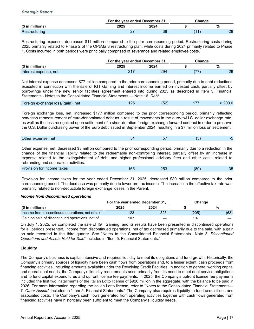 For the year ended December 31, Change ($ in millions) 2025 2024 $ % Restructuring 27 38 (11) -28 Restructuring expenses decreased $11 million compared to the prior corresponding period. Restructuring costs during 2025 primarily related to Phase 2 of the OPtiMa 3 restructuring plan, while costs during 2024 primarily related to Phase 1. Costs incurred in both periods were principally comprised of severance and related employee costs. For the year ended December 31, Change ($ in millions) 2025 2024 $ % Interest expense, net 217 294 (77) -26 Net interest expense decreased $77 million compared to the prior corresponding period, primarily due to debt reductions executed in connection with the sale of IGT Gaming and interest income earned on invested cash, partially offset by borrowings under the new senior facilities agreement entered into during 2025 as described in Item 5. Financial Statements - Notes to the Consolidated Financial Statements — Note 16. Debt Foreign exchange loss/(gain), net 125 (52) 177 > 200.0 Foreign exchange loss, net, increased $177 million compared to the prior corresponding period, primarily reflecting non-cash remeasurement of euro-denominated debt as a result of movements in the euro-to-U.S. dollar exchange rate, as well as the loss recognized upon settlement of a short-duration foreign exchange forward contract in order to preserve the U.S. Dollar purchasing power of the Euro debt issued in September 2024, resulting in a $7 million loss on settlement. Other expense, net 54 57 (3) -5 Other expense, net, decreased $3 million compared to the prior corresponding period, primarily due to a reduction in the change of the financial liability related to the redeemable non-controlling interest, partially offset by an increase in expense related to the extinguishment of debt and higher professional advisory fees and other costs related to rebranding and separation activities. Provision for income taxes 165 253 (89) -35 Provision for income taxes for the year ended December 31, 2025, decreased $89 million compared to the prior corresponding period. The decrease was primarily due to lower pre-tax income. The increase in the effective tax rate was primarily related to non-deductible foreign exchange losses in the Parent. Income from discontinued operations For the year ended December 31, Change ($ in millions) 2025 2024 $ % Income from discontinued operations, net of tax 123 328 (205) (63) Gain on sale of discontinued operations, net of 107 — 107 — On July 1, 2025, we completed the sale of IGT Gaming, and its results have been presented in discontinued operations for all periods presented, Income from discontinued operations, net of tax decreased primarily due to the sale, with a gain on sale recorded in the third quarter. See “Notes to the Consolidated Financial Statements—Note 3. Discontinued Operations and Assets Held for Sale” included in “Item 5. Financial Statements.” Liquidity The Company’s business is capital intensive and requires liquidity to meet its obligations and fund growth. Historically, the Company’s primary sources of liquidity have been cash flows from operations and, to a lesser extent, cash proceeds from financing activities, including amounts available under the Revolving Credit Facilities. In addition to general working capital and operational needs, the Company’s liquidity requirements arise primarily from its need to meet debt service obligations and to fund capital expenditures and upfront license fee payments. In 2025, the Company’s upfront license fee payments included the first two installments of the Italian Lotto license of $926 million in the aggregate, with the balance to be paid in 2026. For more information regarding the Italian Lotto license, refer to “Notes to the Consolidated Financial Statements— 7. Other Assets” included in “Item 5. Financial Statements.” The Company also requires liquidity to fund acquisitions and associated costs. The Company’s cash flows generated from operating activities together with cash flows generated from financing activities have historically been sufficient to meet the Company's liquidity needs. Strategic Report Annual Report and Accounts 2025 Page | 17