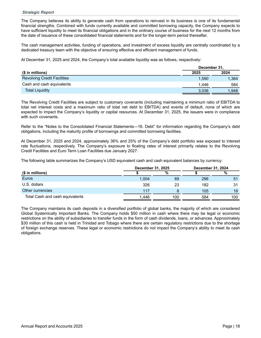 The Company believes its ability to generate cash from operations to reinvest in its business is one of its fundamental financial strengths. Combined with funds currently available and committed borrowing capacity, the Company expects to have sufficient liquidity to meet its financial obligations and in the ordinary course of business for the next 12 months from the date of issuance of these consolidated financial statements and for the longer-term period thereafter. The cash management activities, funding of operations, and investment of excess liquidity are centrally coordinated by a dedicated treasury team with the objective of ensuring effective and efficient management of funds. At December 31, 2025 and 2024, the Company’s total available liquidity was as follows, respectively: December 31, ($ in millions) 2025 2024 Revolving Credit Facilities 1,590 1,364 Cash and cash equivalents 1,446 584 Total Liquidity 3,036 1,948 The Revolving Credit Facilities are subject to customary covenants (including maintaining a minimum ratio of EBITDA to total net interest costs and a maximum ratio of total net debt to EBITDA) and events of default, none of which are expected to impact the Company’s liquidity or capital resources. At December 31, 2025, the issuers were in compliance with such covenants. Refer to the “Notes to the Consolidated Financial Statements—16. Debt” for information regarding the Company’s debt obligations, including the maturity profile of borrowings and committed borrowing facilities. At December 31, 2025 and 2024, approximately 36% and 25% of the Company’s debt portfolio was exposed to interest rate fluctuations, respectively. The Company’s exposure to floating rates of interest primarily relates to the Revolving Credit Facilities and Euro Term Loan Facilities due January 2027. The following table summarizes the Company’s USD equivalent cash and cash equivalent balances by currency: December 31, 2025 December 31, 2024 ($ in millions) $ % $ % Euros 1,004 69 296 51 U.S. dollars 326 23 182 31 Other currencies 117 8 105 18 Total Cash and cash equivalents 1,446 100 584 100 The Company maintains its cash deposits in a diversified portfolio of global banks, the majority of which are considered Global Systemically Important Banks. The Company holds $50 million in cash where there may be legal or economic restrictions on the ability of subsidiaries to transfer funds in the form of cash dividends, loans, or advances. Approximately $30 million of this cash is held in Trinidad and Tobago where there are certain regulatory restrictions due to the shortage of foreign exchange reserves. These legal or economic restrictions do not impact the Company’s ability to meet its cash obligations. Strategic Report Annual Report and Accounts 2025 Page | 18