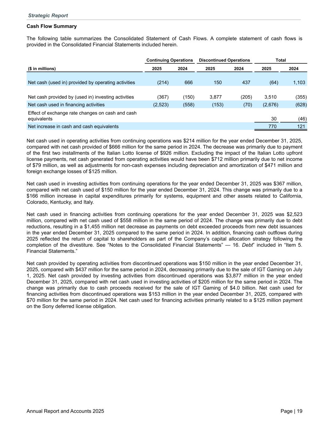 Cash Flow Summary The following table summarizes the Consolidated Statement of Cash Flows. A complete statement of cash flows is provided in the Consolidated Financial Statements included herein. Continuing Operations Discontinued Operations Total ($ in millions) 2025 2024 2025 2024 2025 2024 Net cash (used in) provided by operating activities (214) 666 150 437 (64) 1,103 Net cash provided by (used in) investing activities (367) (150) 3,877 (205) 3,510 (355) Net cash used in financing activities (2,523) (558) (153) (70) (2,676) (628) Effect of exchange rate changes on cash and cash equivalents 30 (46) Net increase in cash and cash equivalents 770 121 Net cash used in operating activities from continuing operations was $214 million for the year ended December 31, 2025, compared with net cash provided of $666 million for the same period in 2024. The decrease was primarily due to payment of the first two installments of the Italian Lotto license of $926 million. Excluding the impact of the Italian Lotto upfront license payments, net cash generated from operating activities would have been $712 million primarily due to net income of $79 million, as well as adjustments for non-cash expenses including depreciation and amortization of $471 million and foreign exchange losses of $125 million. Net cash used in investing activities from continuing operations for the year ended December 31, 2025 was $367 million, compared with net cash used of $150 million for the year ended December 31, 2024. This change was primarily due to a $166 million increase in capital expenditures primarily for systems, equipment and other assets related to California, Colorado, Kentucky, and Italy. Net cash used in financing activities from continuing operations for the year ended December 31, 2025 was $2,523 million, compared with net cash used of $558 million in the same period of 2024. The change was primarily due to debt reductions, resulting in a $1,455 million net decrease as payments on debt exceeded proceeds from new debt issuances in the year ended December 31, 2025 compared to the same period in 2024. In addition, financing cash outflows during 2025 reflected the return of capital to shareholders as part of the Company’s capital allocation strategy following the completion of the divestiture. See “Notes to the Consolidated Financial Statements” — 16. Debt” included in “Item 5. Financial Statements.” Net cash provided by operating activities from discontinued operations was $150 million in the year ended December 31, 2025, compared with $437 million for the same period in 2024, decreasing primarily due to the sale of IGT Gaming on July 1, 2025. Net cash provided by investing activities from discontinued operations was $3,877 million in the year ended December 31, 2025, compared with net cash used in investing activities of $205 million for the same period in 2024. The change was primarily due to cash proceeds received for the sale of IGT Gaming of $4.0 billion. Net cash used for financing activities from discontinued operations was $153 million in the year ended December 31, 2025, compared with $70 million for the same period in 2024. Net cash used for financing activities primarily related to a $125 million payment on the Sony deferred license obligation. Strategic Report Annual Report and Accounts 2025 Page | 19