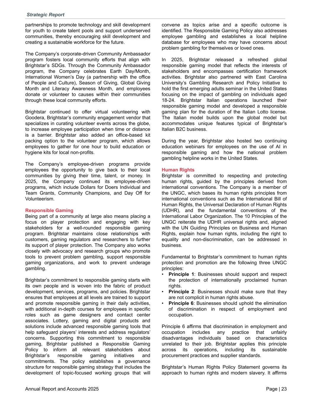 partnerships to promote technology and skill development for youth to create talent pools and support underserved communities, thereby encouraging skill development and creating a sustainable workforce for the future. The Company’s corporate-driven Community Ambassador program fosters local community efforts that align with Brightstar’s SDGs. Through the Community Ambassador program, the Company celebrates Earth Day/Month, International Women’s Day (a partnership with the office of People and Culture), Season of Giving, Global Giving Month and Literacy Awareness Month, and employees donate or volunteer to causes within their communities through these local community efforts. Brightstar continued to offer virtual volunteering with Goodera, Brightstar’s community engagement vendor that specializes in curating volunteer events across the globe, to increase employee participation when time or distance is a barrier. Brightstar also added an office-based kit packing option to the volunteer program, which allows employees to gather for one hour to build education or hygiene kits for local non-profits. The Company’s employee-driven programs provide employees the opportunity to give back to their local communities by giving their time, talent, or money. In 2025, the Company continued its employee-driven programs, which include Dollars for Doers Individual and Team Grants, Community Champions, and Day Off for Volunteerism. Responsible Gaming Being part of a community at large also means placing a focus on player protection and engaging with key stakeholders for a well-rounded responsible gaming program. Brightstar maintains close relationships with customers, gaming regulators and researchers to further its support of player protection. The Company also works closely with advocacy and research groups who promote tools to prevent problem gambling, support responsible gaming organizations, and work to prevent underage gambling. Brightstar’s commitment to responsible gaming starts with its own people and is woven into the fabric of product development, services, programs, and policies. Brightstar ensures that employees at all levels are trained to support and promote responsible gaming in their daily activities, with additional in-depth courses for employees in specific roles such as game designers and contact center associates. Lottery, gaming and digital products and solutions include advanced responsible gaming tools that help safeguard players’ interests and address regulators’ concerns. Supporting this commitment to responsible gaming, Brightstar published a Responsible Gaming Policy to inform all relevant stakeholders about Brightstar’s responsible gaming initiatives and commitments. The policy establishes a governance structure for responsible gaming strategy that includes the development of topic-focused working groups that will convene as topics arise and a specific outcome is identified. The Responsible Gaming Policy also addresses employee gambling and establishes a local helpline database for employees who may have concerns about problem gambling for themselves or loved ones. In 2025, Brightstar released a refreshed global responsible gaming model that reflects the interests of stakeholders and encompasses certification framework activities. Brightstar also partnered with East Carolina University’s Gambling Research and Policy Initiative to hold the first emerging adults seminar in the United States focusing on the impact of gambling on individuals aged 18-24. Brightstar Italian operations launched their responsible gaming model and developed a responsible gaming plan for the duration of the Italian Lotto license. The Italian model builds upon the global model but accommodates unique features typical of Brightstar’s Italian B2C business. During the year, Brightstar also hosted two continuing education webinars for employees on the use of AI in responsible gaming and how the national problem gambling helpline works in the United States. Human Rights Brightstar is committed to respecting and protecting human rights, guided by the principles derived from international conventions. The Company is a member of the UNGC, which bases its human rights principles from international conventions such as the International Bill of Human Rights, the Universal Declaration of Human Rights (UDHR), and the fundamental conventions of the International Labor Organization. The 10 Principles of the UNGC reiterate the UDHR universal rights and, aligned with the UN Guiding Principles on Business and Human Rights, explain how human rights, including the right to equality and non-discrimination, can be addressed in business. Fundamental to Brightstar’s commitment to human rights protection and promotion are the following three UNGC principles: • Principle 1: Businesses should support and respect the protection of internationally proclaimed human rights. • Principle 2: Businesses should make sure that they are not complicit in human rights abuse. • Principle 6: Businesses should uphold the elimination of discrimination in respect of employment and occupation. Principle 6 affirms that discrimination in employment and occupation includes any practice that unfairly disadvantages individuals based on characteristics unrelated to their job. Brightstar applies this principle across its operations, including its sustainable procurement practices and supplier standards. Brightstar’s Human Rights Policy Statement governs its approach to human rights and modern slavery. It affirms Strategic Report Annual Report and Accounts 2025 Page | 23