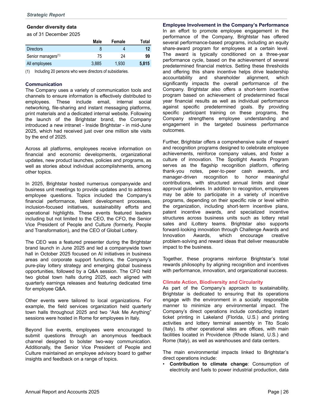 Gender diversity data as of 31 December 2025 Male Female Total Directors 8 4 12 Senior managers(1) 75 24 99 All employees 3,885 1,930 5,815 (1) Including 20 persons who were directors of subsidiaries. Communication The Company uses a variety of communication tools and channels to ensure information is effectively distributed to employees. These include email, internal social networking, file-sharing and instant messaging platforms, print materials and a dedicated internal website. Following the launch of the Brightstar brand, the Company introduced a new intranet - Inside Brightstar - in mid-June 2025, which had received just over one million site visits by the end of 2025. Across all platforms, employees receive information on financial and economic developments, organizational updates, new product launches, policies and programs, as well as stories about individual accomplishments, among other topics. In 2025, Brightstar hosted numerous companywide and business unit meetings to provide updates and to address employee questions. Topics included the Company’s financial performance, talent development processes, inclusion-focused initiatives, sustainability efforts and operational highlights. These events featured leaders including but not limited to the CEO, the CFO, the Senior Vice President of People and Culture (formerly, People and Transformation), and the CEO of Global Lottery. The CEO was a featured presenter during the Brightstar brand launch in June 2025 and led a companywide town hall in October 2025 focused on AI initiatives in business areas and corporate support functions, the Company’s pure-play lottery strategy and emerging global business opportunities, followed by a Q&A session. The CFO held two global town halls during 2025, each aligned with quarterly earnings releases and featuring dedicated time for employee Q&A. Other events were tailored to local organizations. For example, the field services organization held quarterly town halls throughout 2025 and two “Ask Me Anything” sessions were hosted in Rome for employees in Italy. Beyond live events, employees were encouraged to submit questions through an anonymous feedback channel designed to bolster two-way communication. Additionally, the Senior Vice President of People and Culture maintained an employee advisory board to gather insights and feedback on a range of topics. Employee Involvement in the Company’s Performance In an effort to promote employee engagement in the performance of the Company, Brightstar has offered several performance-based programs, including an equity share-award program for employees at a certain level. The award is typically conditioned on a three-year performance cycle, based on the achievement of several predetermined financial metrics. Setting these thresholds and offering this share incentive helps drive leadership accountability and shareholder alignment, which significantly impacts the overall performance of the Company. Brightstar also offers a short-term incentive program based on achievement of predetermined fiscal year financial results as well as individual performance against specific predetermined goals. By providing specific participant training on these programs, the Company strengthens employee understanding and engagement in the targeted business performance outcomes. Further, Brightstar offers a comprehensive suite of reward and recognition programs designed to celebrate employee achievements, reinforce company values, and foster a culture of innovation. The Spotlight Awards Program serves as the flagship recognition platform, offering thank-you notes, peer-to-peer cash awards, and manager-driven recognition to honor meaningful contributions, with structured annual limits and clear approval guidelines. In addition to recognition, employees may be able to participate in a variety of incentive programs, depending on their specific role or level within the organization, including short-term incentive plans, patent incentive awards, and specialized incentive structures across business units such as lottery retail sales and iLottery teams. Brightstar also supports forward-looking innovation through Challenge Awards and Innovation Awards, which encourage creative problem-solving and reward ideas that deliver measurable impact to the business. Together, these programs reinforce Brightstar’s total rewards philosophy by aligning recognition and incentives with performance, innovation, and organizational success. Climate Action, Biodiversity and Circularity As part of the Company’s approach to sustainability, Brightstar is dedicated to ensuring that its operations engage with the environment in a socially responsible manner to minimize any environmental impact. The Company’s direct operations include conducting instant ticket printing in Lakeland (Florida, U.S.) and printing activities and lottery terminal assembly in Tito Scalo (Italy). Its other operational sites are offices, with main facilities located in Providence (Rhode Island, U.S.) and Rome (Italy), as well as warehouses and data centers. The main environmental impacts linked to Brightstar’s direct operations include: • Contribution to climate change: Consumption of electricity and fuels to power industrial production, data Strategic Report Annual Report and Accounts 2025 Page | 26