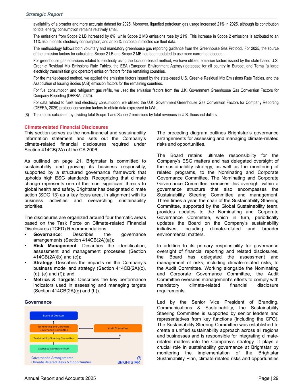 availability of a broader and more accurate dataset for 2025. Moreover, liquefied petroleum gas usage increased 21% in 2025, although its contribution to total energy consumption remains relatively small. The emissions from Scope 2 LB increased by 8%, while Scope 2 MB emissions rose by 21%. This increase in Scope 2 emissions is attributed to an 11% rise in onsite electricity consumption, and an 82% increase in electric car fleet data. The methodology follows both voluntary and mandatory greenhouse gas reporting guidance from the Greenhouse Gas Protocol. For 2025, the source of the emission factors for calculating Scope 2 LB and Scope 2 MB has been updated to use more current databases. For greenhouse gas emissions related to electricity using the location-based method, we have utilized emission factors issued by the state-based U.S. Green-e Residual Mix Emissions Rate Tables, the EEA (European Environment Agency) database for all country in Europe, and Terna (a large electricity transmission grid operator) emission factors for the remaining countries. For the market-based method, we applied the emission factors issued by the state-based U.S. Green-e Residual Mix Emissions Rate Tables, and the Association of Issuing Bodies (AIB) emission factors for the remaining countries. For fuel consumption and refrigerant gas refills, we used the emission factors from the U.K. Government Greenhouse Gas Conversion Factors for Company Reporting (DEFRA, 2025). For data related to fuels and electricity consumption, we utilized the U.K. Government Greenhouse Gas Conversion Factors for Company Reporting (DEFRA, 2025) protocol conversion factors to obtain data expressed in kWh. (8) The ratio is calculated by dividing total Scope 1 and Scope 2 emissions by total revenues in U.S. thousand dollars. Climate-related Financial Disclosures This section serves as the non-financial and sustainability information statement and sets out the Company’s climate-related financial disclosures required under Section 414CB(2A) of the CA 2006. As outlined on page 21, Brightstar is committed to sustainability and growing its business responsibly, supported by a structured governance framework that upholds high ESG standards. Recognizing that climate change represents one of the most significant threats to global health and safety, Brightstar has designated climate action (SDG 13) as a key focus area, in alignment with its business activities and overarching sustainability priorities. The disclosures are organized around four thematic areas based on the Task Force on Climate-related Financial Disclosures (TCFD) Recommendations: • Governance: Describes the governance arrangements (Section 414CB(2A)(a)); • Risk Management: Describes the identification, assessment and management processes (Section 414CB(2A)(b) and (c)); • Strategy: Describes the impacts on the Company’s business model and strategy (Section 414CB(2A)(c), (d), (e) and (f)); and • Metrics & Targets: Describes the key performance indicators used in assessing and managing targets (Section 414CB(2A)(g) and (h)). Governance The preceding diagram outlines Brightstar’s governance arrangements for assessing and managing climate-related risks and opportunities. The Board retains ultimate responsibility for the Company’s ESG matters and has delegated oversight of the sustainability strategy, as well as the monitoring of related programs, to the Nominating and Corporate Governance Committee. The Nominating and Corporate Governance Committee exercises this oversight within a governance structure that also encompasses the Sustainability Steering Committee and management. Three times a year, the chair of the Sustainability Steering Committee, supported by the Global Sustainability team, provides updates to the Nominating and Corporate Governance Committee, which in turn, periodically updates the Board on the Company’s sustainability initiatives, including climate-related and broader environmental matters. In addition to its primary responsibility for governance oversight of financial reporting and related disclosures, the Board has delegated the assessment and management of risks, including climate-related risks, to the Audit Committee. Working alongside the Nominating and Corporate Governance Committee, the Audit Committee oversees management’s efforts to comply with mandatory climate-related financial disclosure requirements. Led by the Senior Vice President of Branding, Communications & Sustainability, the Sustainability Steering Committee is supported by senior leaders and representatives from key functions (including the CFO). The Sustainability Steering Committee was established to create a unified sustainability approach across all regions and businesses and is responsible for integrating climate- related matters into the Company’s strategy. It plays a crucial role in sustainability governance at Brightstar by monitoring the implementation of the Brightstar Sustainability Plan, climate-related risks and opportunities Strategic Report Annual Report and Accounts 2025 Page | 29