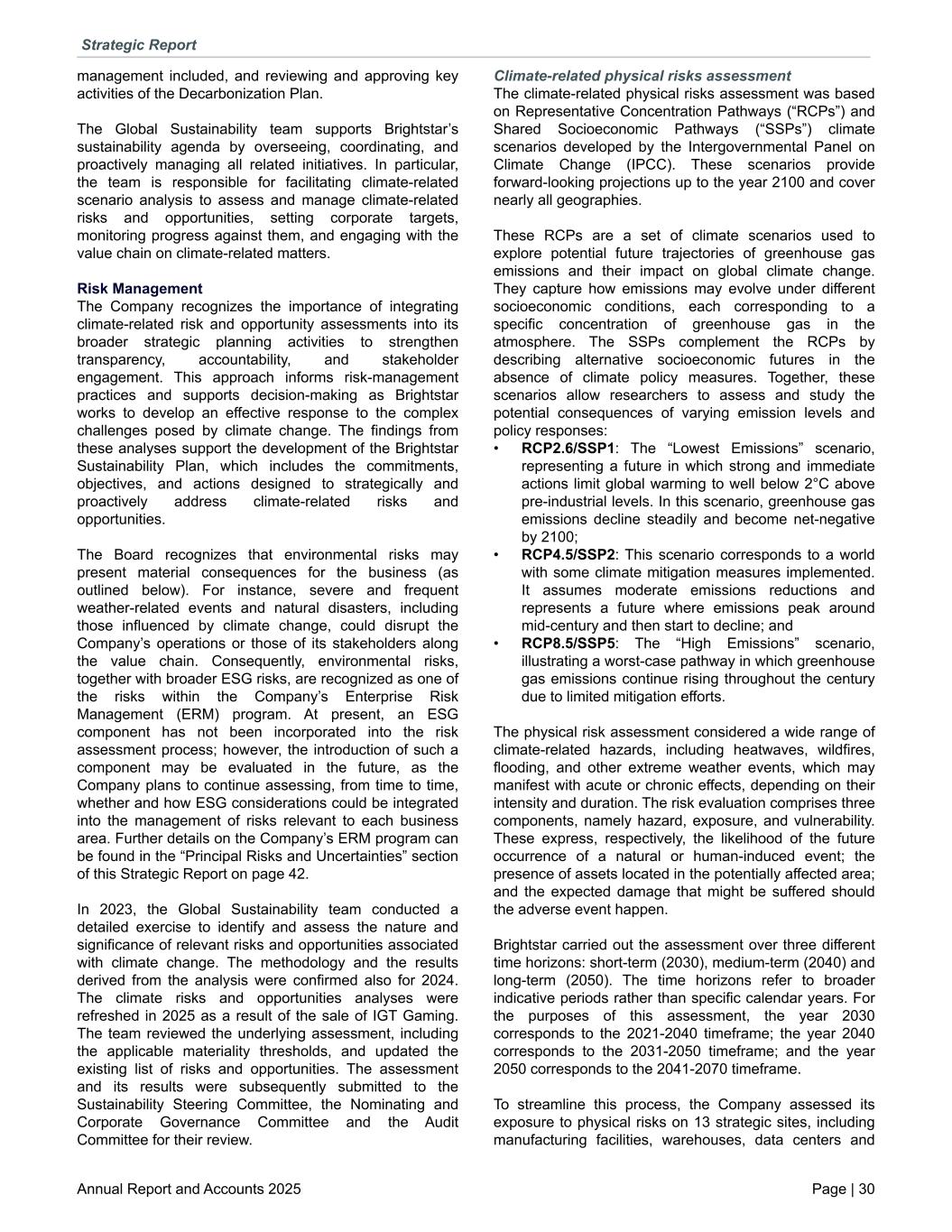 management included, and reviewing and approving key activities of the Decarbonization Plan. The Global Sustainability team supports Brightstar’s sustainability agenda by overseeing, coordinating, and proactively managing all related initiatives. In particular, the team is responsible for facilitating climate-related scenario analysis to assess and manage climate-related risks and opportunities, setting corporate targets, monitoring progress against them, and engaging with the value chain on climate-related matters. Risk Management The Company recognizes the importance of integrating climate-related risk and opportunity assessments into its broader strategic planning activities to strengthen transparency, accountability, and stakeholder engagement. This approach informs risk-management practices and supports decision-making as Brightstar works to develop an effective response to the complex challenges posed by climate change. The findings from these analyses support the development of the Brightstar Sustainability Plan, which includes the commitments, objectives, and actions designed to strategically and proactively address climate-related risks and opportunities. The Board recognizes that environmental risks may present material consequences for the business (as outlined below). For instance, severe and frequent weather-related events and natural disasters, including those influenced by climate change, could disrupt the Company’s operations or those of its stakeholders along the value chain. Consequently, environmental risks, together with broader ESG risks, are recognized as one of the risks within the Company’s Enterprise Risk Management (ERM) program. At present, an ESG component has not been incorporated into the risk assessment process; however, the introduction of such a component may be evaluated in the future, as the Company plans to continue assessing, from time to time, whether and how ESG considerations could be integrated into the management of risks relevant to each business area. Further details on the Company’s ERM program can be found in the “Principal Risks and Uncertainties” section of this Strategic Report on page 42. In 2023, the Global Sustainability team conducted a detailed exercise to identify and assess the nature and significance of relevant risks and opportunities associated with climate change. The methodology and the results derived from the analysis were confirmed also for 2024. The climate risks and opportunities analyses were refreshed in 2025 as a result of the sale of IGT Gaming. The team reviewed the underlying assessment, including the applicable materiality thresholds, and updated the existing list of risks and opportunities. The assessment and its results were subsequently submitted to the Sustainability Steering Committee, the Nominating and Corporate Governance Committee and the Audit Committee for their review. Climate-related physical risks assessment The climate-related physical risks assessment was based on Representative Concentration Pathways (“RCPs”) and Shared Socioeconomic Pathways (“SSPs”) climate scenarios developed by the Intergovernmental Panel on Climate Change (IPCC). These scenarios provide forward-looking projections up to the year 2100 and cover nearly all geographies. These RCPs are a set of climate scenarios used to explore potential future trajectories of greenhouse gas emissions and their impact on global climate change. They capture how emissions may evolve under different socioeconomic conditions, each corresponding to a specific concentration of greenhouse gas in the atmosphere. The SSPs complement the RCPs by describing alternative socioeconomic futures in the absence of climate policy measures. Together, these scenarios allow researchers to assess and study the potential consequences of varying emission levels and policy responses: • RCP2.6/SSP1: The “Lowest Emissions” scenario, representing a future in which strong and immediate actions limit global warming to well below 2°C above pre-industrial levels. In this scenario, greenhouse gas emissions decline steadily and become net-negative by 2100; • RCP4.5/SSP2: This scenario corresponds to a world with some climate mitigation measures implemented. It assumes moderate emissions reductions and represents a future where emissions peak around mid-century and then start to decline; and • RCP8.5/SSP5: The “High Emissions” scenario, illustrating a worst-case pathway in which greenhouse gas emissions continue rising throughout the century due to limited mitigation efforts. The physical risk assessment considered a wide range of climate-related hazards, including heatwaves, wildfires, flooding, and other extreme weather events, which may manifest with acute or chronic effects, depending on their intensity and duration. The risk evaluation comprises three components, namely hazard, exposure, and vulnerability. These express, respectively, the likelihood of the future occurrence of a natural or human-induced event; the presence of assets located in the potentially affected area; and the expected damage that might be suffered should the adverse event happen. Brightstar carried out the assessment over three different time horizons: short-term (2030), medium-term (2040) and long-term (2050). The time horizons refer to broader indicative periods rather than specific calendar years. For the purposes of this assessment, the year 2030 corresponds to the 2021-2040 timeframe; the year 2040 corresponds to the 2031-2050 timeframe; and the year 2050 corresponds to the 2041-2070 timeframe. To streamline this process, the Company assessed its exposure to physical risks on 13 strategic sites, including manufacturing facilities, warehouses, data centers and Strategic Report Annual Report and Accounts 2025 Page | 30
