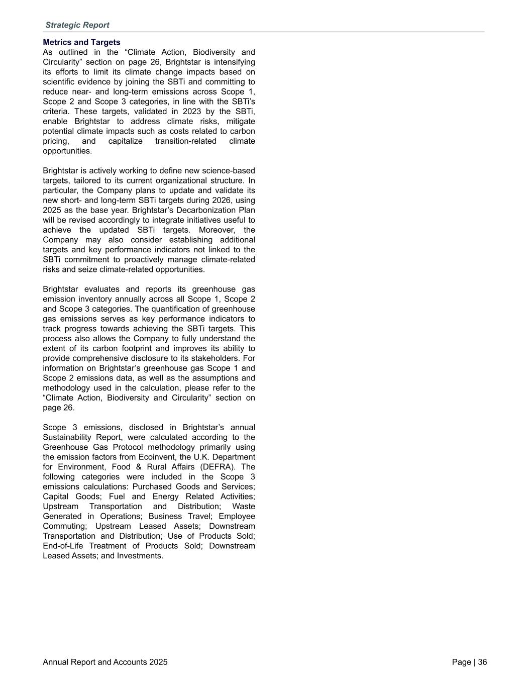 Metrics and Targets As outlined in the “Climate Action, Biodiversity and Circularity” section on page 26, Brightstar is intensifying its efforts to limit its climate change impacts based on scientific evidence by joining the SBTi and committing to reduce near- and long-term emissions across Scope 1, Scope 2 and Scope 3 categories, in line with the SBTi’s criteria. These targets, validated in 2023 by the SBTi, enable Brightstar to address climate risks, mitigate potential climate impacts such as costs related to carbon pricing, and capitalize transition-related climate opportunities. Brightstar is actively working to define new science-based targets, tailored to its current organizational structure. In particular, the Company plans to update and validate its new short- and long-term SBTi targets during 2026, using 2025 as the base year. Brightstar’s Decarbonization Plan will be revised accordingly to integrate initiatives useful to achieve the updated SBTi targets. Moreover, the Company may also consider establishing additional targets and key performance indicators not linked to the SBTi commitment to proactively manage climate-related risks and seize climate-related opportunities. Brightstar evaluates and reports its greenhouse gas emission inventory annually across all Scope 1, Scope 2 and Scope 3 categories. The quantification of greenhouse gas emissions serves as key performance indicators to track progress towards achieving the SBTi targets. This process also allows the Company to fully understand the extent of its carbon footprint and improves its ability to provide comprehensive disclosure to its stakeholders. For information on Brightstar’s greenhouse gas Scope 1 and Scope 2 emissions data, as well as the assumptions and methodology used in the calculation, please refer to the “Climate Action, Biodiversity and Circularity” section on page 26. Scope 3 emissions, disclosed in Brightstar’s annual Sustainability Report, were calculated according to the Greenhouse Gas Protocol methodology primarily using the emission factors from Ecoinvent, the U.K. Department for Environment, Food & Rural Affairs (DEFRA). The following categories were included in the Scope 3 emissions calculations: Purchased Goods and Services; Capital Goods; Fuel and Energy Related Activities; Upstream Transportation and Distribution; Waste Generated in Operations; Business Travel; Employee Commuting; Upstream Leased Assets; Downstream Transportation and Distribution; Use of Products Sold; End-of-Life Treatment of Products Sold; Downstream Leased Assets; and Investments. Strategic Report Annual Report and Accounts 2025 Page | 36