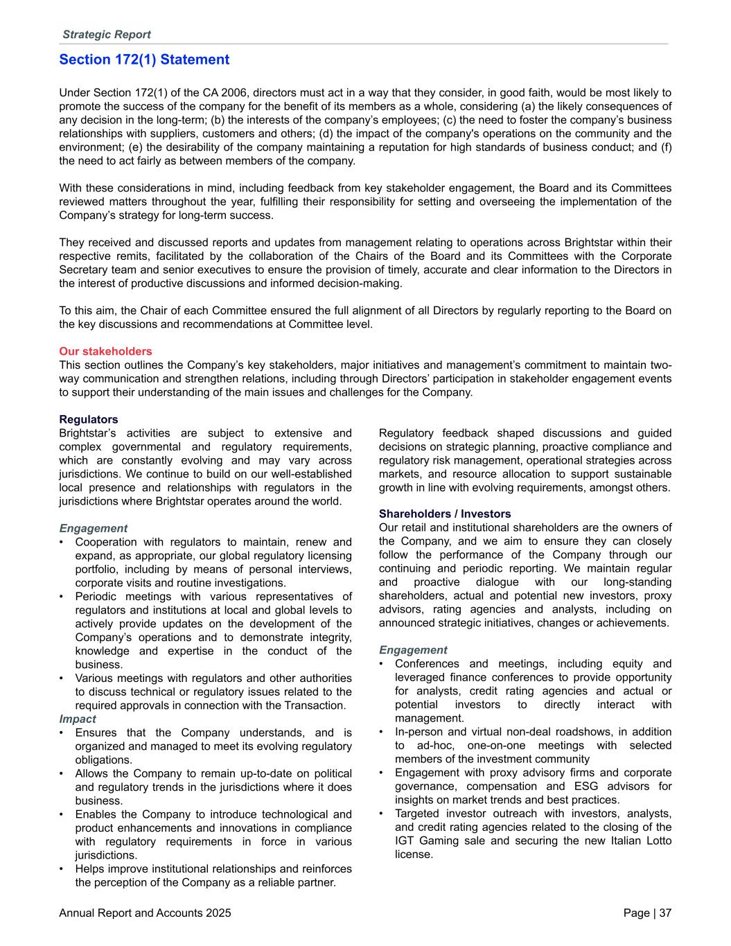 Section 172(1) Statement Under Section 172(1) of the CA 2006, directors must act in a way that they consider, in good faith, would be most likely to promote the success of the company for the benefit of its members as a whole, considering (a) the likely consequences of any decision in the long-term; (b) the interests of the company’s employees; (c) the need to foster the company’s business relationships with suppliers, customers and others; (d) the impact of the company's operations on the community and the environment; (e) the desirability of the company maintaining a reputation for high standards of business conduct; and (f) the need to act fairly as between members of the company. With these considerations in mind, including feedback from key stakeholder engagement, the Board and its Committees reviewed matters throughout the year, fulfilling their responsibility for setting and overseeing the implementation of the Company’s strategy for long-term success. They received and discussed reports and updates from management relating to operations across Brightstar within their respective remits, facilitated by the collaboration of the Chairs of the Board and its Committees with the Corporate Secretary team and senior executives to ensure the provision of timely, accurate and clear information to the Directors in the interest of productive discussions and informed decision-making. To this aim, the Chair of each Committee ensured the full alignment of all Directors by regularly reporting to the Board on the key discussions and recommendations at Committee level. Our stakeholders This section outlines the Company’s key stakeholders, major initiatives and management’s commitment to maintain two- way communication and strengthen relations, including through Directors’ participation in stakeholder engagement events to support their understanding of the main issues and challenges for the Company. Regulators Brightstar’s activities are subject to extensive and complex governmental and regulatory requirements, which are constantly evolving and may vary across jurisdictions. We continue to build on our well-established local presence and relationships with regulators in the jurisdictions where Brightstar operates around the world. Engagement • Cooperation with regulators to maintain, renew and expand, as appropriate, our global regulatory licensing portfolio, including by means of personal interviews, corporate visits and routine investigations. • Periodic meetings with various representatives of regulators and institutions at local and global levels to actively provide updates on the development of the Company’s operations and to demonstrate integrity, knowledge and expertise in the conduct of the business. • Various meetings with regulators and other authorities to discuss technical or regulatory issues related to the required approvals in connection with the Transaction. Impact • Ensures that the Company understands, and is organized and managed to meet its evolving regulatory obligations. • Allows the Company to remain up-to-date on political and regulatory trends in the jurisdictions where it does business. • Enables the Company to introduce technological and product enhancements and innovations in compliance with regulatory requirements in force in various jurisdictions. • Helps improve institutional relationships and reinforces the perception of the Company as a reliable partner. Regulatory feedback shaped discussions and guided decisions on strategic planning, proactive compliance and regulatory risk management, operational strategies across markets, and resource allocation to support sustainable growth in line with evolving requirements, amongst others. Shareholders / Investors Our retail and institutional shareholders are the owners of the Company, and we aim to ensure they can closely follow the performance of the Company through our continuing and periodic reporting. We maintain regular and proactive dialogue with our long-standing shareholders, actual and potential new investors, proxy advisors, rating agencies and analysts, including on announced strategic initiatives, changes or achievements. Engagement • Conferences and meetings, including equity and leveraged finance conferences to provide opportunity for analysts, credit rating agencies and actual or potential investors to directly interact with management. • In-person and virtual non-deal roadshows, in addition to ad-hoc, one-on-one meetings with selected members of the investment community • Engagement with proxy advisory firms and corporate governance, compensation and ESG advisors for insights on market trends and best practices. • Targeted investor outreach with investors, analysts, and credit rating agencies related to the closing of the IGT Gaming sale and securing the new Italian Lotto license. Strategic Report Annual Report and Accounts 2025 Page | 37