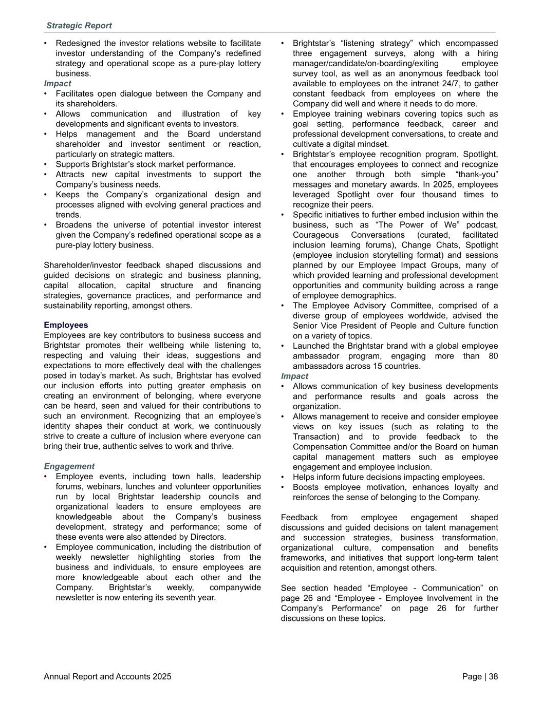 • Redesigned the investor relations website to facilitate investor understanding of the Company’s redefined strategy and operational scope as a pure-play lottery business. Impact • Facilitates open dialogue between the Company and its shareholders. • Allows communication and illustration of key developments and significant events to investors. • Helps management and the Board understand shareholder and investor sentiment or reaction, particularly on strategic matters. • Supports Brightstar’s stock market performance. • Attracts new capital investments to support the Company’s business needs. • Keeps the Company’s organizational design and processes aligned with evolving general practices and trends. • Broadens the universe of potential investor interest given the Company’s redefined operational scope as a pure-play lottery business. Shareholder/investor feedback shaped discussions and guided decisions on strategic and business planning, capital allocation, capital structure and financing strategies, governance practices, and performance and sustainability reporting, amongst others. Employees Employees are key contributors to business success and Brightstar promotes their wellbeing while listening to, respecting and valuing their ideas, suggestions and expectations to more effectively deal with the challenges posed in today’s market. As such, Brightstar has evolved our inclusion efforts into putting greater emphasis on creating an environment of belonging, where everyone can be heard, seen and valued for their contributions to such an environment. Recognizing that an employee’s identity shapes their conduct at work, we continuously strive to create a culture of inclusion where everyone can bring their true, authentic selves to work and thrive. Engagement • Employee events, including town halls, leadership forums, webinars, lunches and volunteer opportunities run by local Brightstar leadership councils and organizational leaders to ensure employees are knowledgeable about the Company’s business development, strategy and performance; some of these events were also attended by Directors. • Employee communication, including the distribution of weekly newsletter highlighting stories from the business and individuals, to ensure employees are more knowledgeable about each other and the Company. Brightstar’s weekly, companywide newsletter is now entering its seventh year. • Brightstar’s “listening strategy” which encompassed three engagement surveys, along with a hiring manager/candidate/on-boarding/exiting employee survey tool, as well as an anonymous feedback tool available to employees on the intranet 24/7, to gather constant feedback from employees on where the Company did well and where it needs to do more. • Employee training webinars covering topics such as goal setting, performance feedback, career and professional development conversations, to create and cultivate a digital mindset. • Brightstar’s employee recognition program, Spotlight, that encourages employees to connect and recognize one another through both simple “thank-you” messages and monetary awards. In 2025, employees leveraged Spotlight over four thousand times to recognize their peers. • Specific initiatives to further embed inclusion within the business, such as “The Power of We” podcast, Courageous Conversations (curated, facilitated inclusion learning forums), Change Chats, Spotlight (employee inclusion storytelling format) and sessions planned by our Employee Impact Groups, many of which provided learning and professional development opportunities and community building across a range of employee demographics. • The Employee Advisory Committee, comprised of a diverse group of employees worldwide, advised the Senior Vice President of People and Culture function on a variety of topics. • Launched the Brightstar brand with a global employee ambassador program, engaging more than 80 ambassadors across 15 countries. Impact • Allows communication of key business developments and performance results and goals across the organization. • Allows management to receive and consider employee views on key issues (such as relating to the Transaction) and to provide feedback to the Compensation Committee and/or the Board on human capital management matters such as employee engagement and employee inclusion. • Helps inform future decisions impacting employees. • Boosts employee motivation, enhances loyalty and reinforces the sense of belonging to the Company. Feedback from employee engagement shaped discussions and guided decisions on talent management and succession strategies, business transformation, organizational culture, compensation and benefits frameworks, and initiatives that support long-term talent acquisition and retention, amongst others. See section headed “Employee - Communication” on page 26 and “Employee - Employee Involvement in the Company’s Performance” on page 26 for further discussions on these topics. Strategic Report Annual Report and Accounts 2025 Page | 38