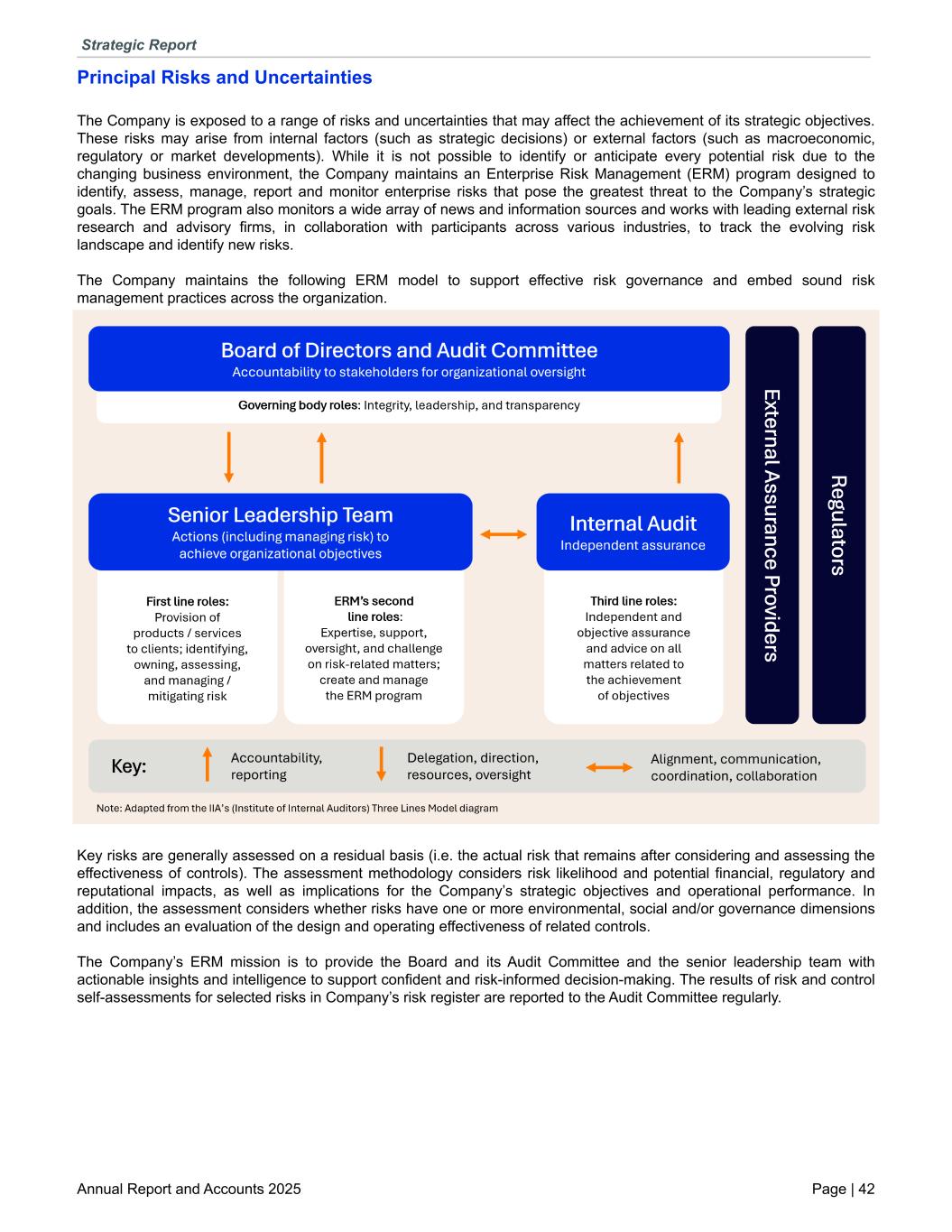 Principal Risks and Uncertainties The Company is exposed to a range of risks and uncertainties that may affect the achievement of its strategic objectives. These risks may arise from internal factors (such as strategic decisions) or external factors (such as macroeconomic, regulatory or market developments). While it is not possible to identify or anticipate every potential risk due to the changing business environment, the Company maintains an Enterprise Risk Management (ERM) program designed to identify, assess, manage, report and monitor enterprise risks that pose the greatest threat to the Company’s strategic goals. The ERM program also monitors a wide array of news and information sources and works with leading external risk research and advisory firms, in collaboration with participants across various industries, to track the evolving risk landscape and identify new risks. The Company maintains the following ERM model to support effective risk governance and embed sound risk management practices across the organization. Key risks are generally assessed on a residual basis (i.e. the actual risk that remains after considering and assessing the effectiveness of controls). The assessment methodology considers risk likelihood and potential financial, regulatory and reputational impacts, as well as implications for the Company’s strategic objectives and operational performance. In addition, the assessment considers whether risks have one or more environmental, social and/or governance dimensions and includes an evaluation of the design and operating effectiveness of related controls. The Company’s ERM mission is to provide the Board and its Audit Committee and the senior leadership team with actionable insights and intelligence to support confident and risk-informed decision-making. The results of risk and control self-assessments for selected risks in Company’s risk register are reported to the Audit Committee regularly. Strategic Report Annual Report and Accounts 2025 Page | 42
