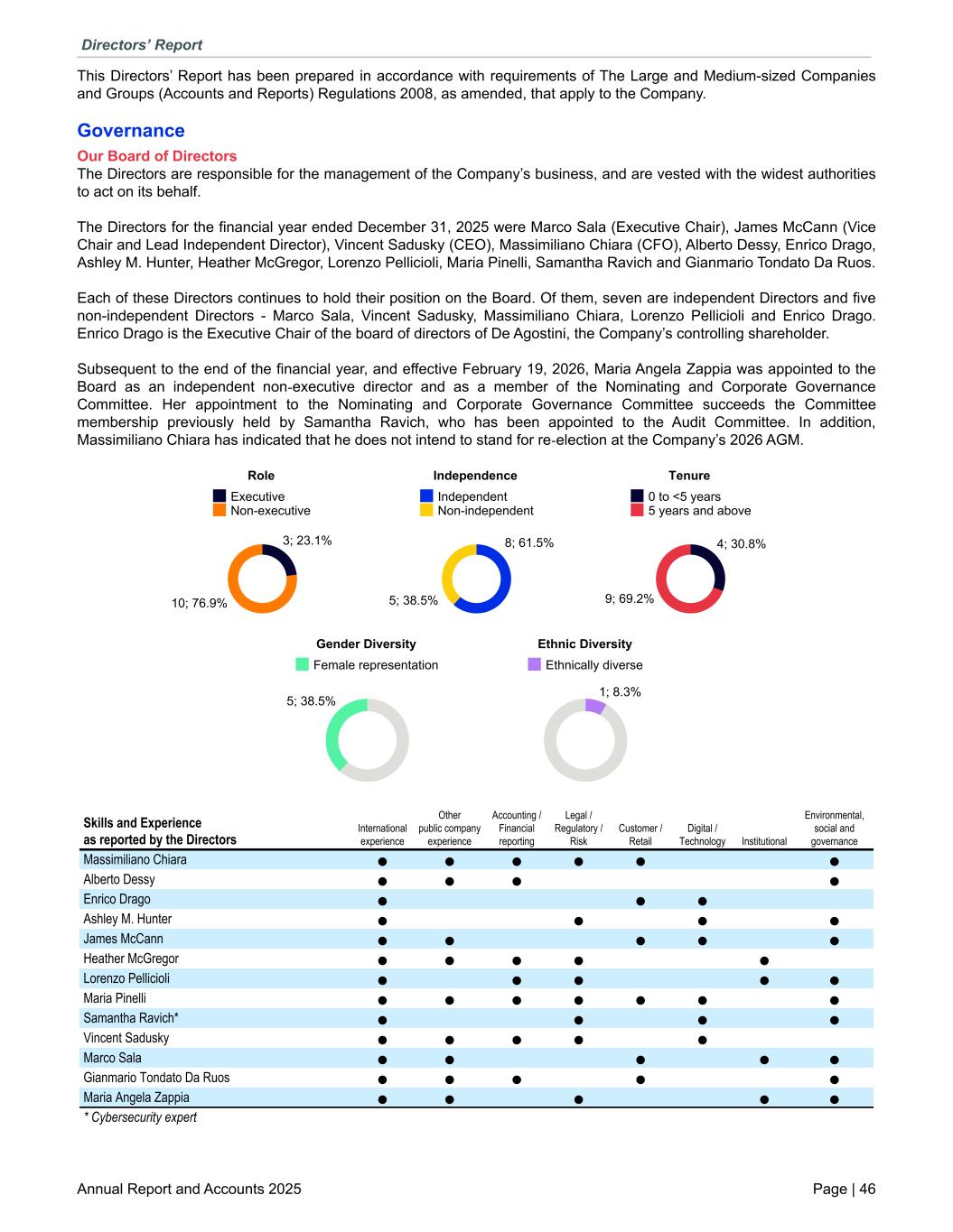 This Directors’ Report has been prepared in accordance with requirements of The Large and Medium-sized Companies and Groups (Accounts and Reports) Regulations 2008, as amended, that apply to the Company. Governance Our Board of Directors The Directors are responsible for the management of the Company’s business, and are vested with the widest authorities to act on its behalf. The Directors for the financial year ended December 31, 2025 were Marco Sala (Executive Chair), James McCann (Vice Chair and Lead Independent Director), Vincent Sadusky (CEO), Massimiliano Chiara (CFO), Alberto Dessy, Enrico Drago, Ashley M. Hunter, Heather McGregor, Lorenzo Pellicioli, Maria Pinelli, Samantha Ravich and Gianmario Tondato Da Ruos. Each of these Directors continues to hold their position on the Board. Of them, seven are independent Directors and five non-independent Directors - Marco Sala, Vincent Sadusky, Massimiliano Chiara, Lorenzo Pellicioli and Enrico Drago. Enrico Drago is the Executive Chair of the board of directors of De Agostini, the Company’s controlling shareholder. Subsequent to the end of the financial year, and effective February 19, 2026, Maria Angela Zappia was appointed to the Board as an independent non-executive director and as a member of the Nominating and Corporate Governance Committee. Her appointment to the Nominating and Corporate Governance Committee succeeds the Committee membership previously held by Samantha Ravich, who has been appointed to the Audit Committee. In addition, Massimiliano Chiara has indicated that he does not intend to stand for re-election at the Company’s 2026 AGM. Role 3; 23.1% 10; 76.9% Executive Non-executive Independence 8; 61.5% 5; 38.5% Independent Non-independent Tenure 4; 30.8% 9; 69.2% 0 to <5 years 5 years and above Gender Diversity 5; 38.5% Female representation Ethnic Diversity 1; 8.3% Ethnically diverse Skills and Experience as reported by the Directors International experience Other public company experience Accounting / Financial reporting Legal / Regulatory / Risk Customer / Retail Digital / Technology Institutional Environmental, social and governance Massimiliano Chiara l l l l l l Alberto Dessy l l l l Enrico Drago l l l Ashley M. Hunter l l l l James McCann l l l l l Heather McGregor l l l l l Lorenzo Pellicioli l l l l l Maria Pinelli l l l l l l l Samantha Ravich* l l l l Vincent Sadusky l l l l l Marco Sala l l l l l Gianmario Tondato Da Ruos l l l l l Maria Angela Zappia l l l l l * Cybersecurity expert Directors’ Report Annual Report and Accounts 2025 Page | 46