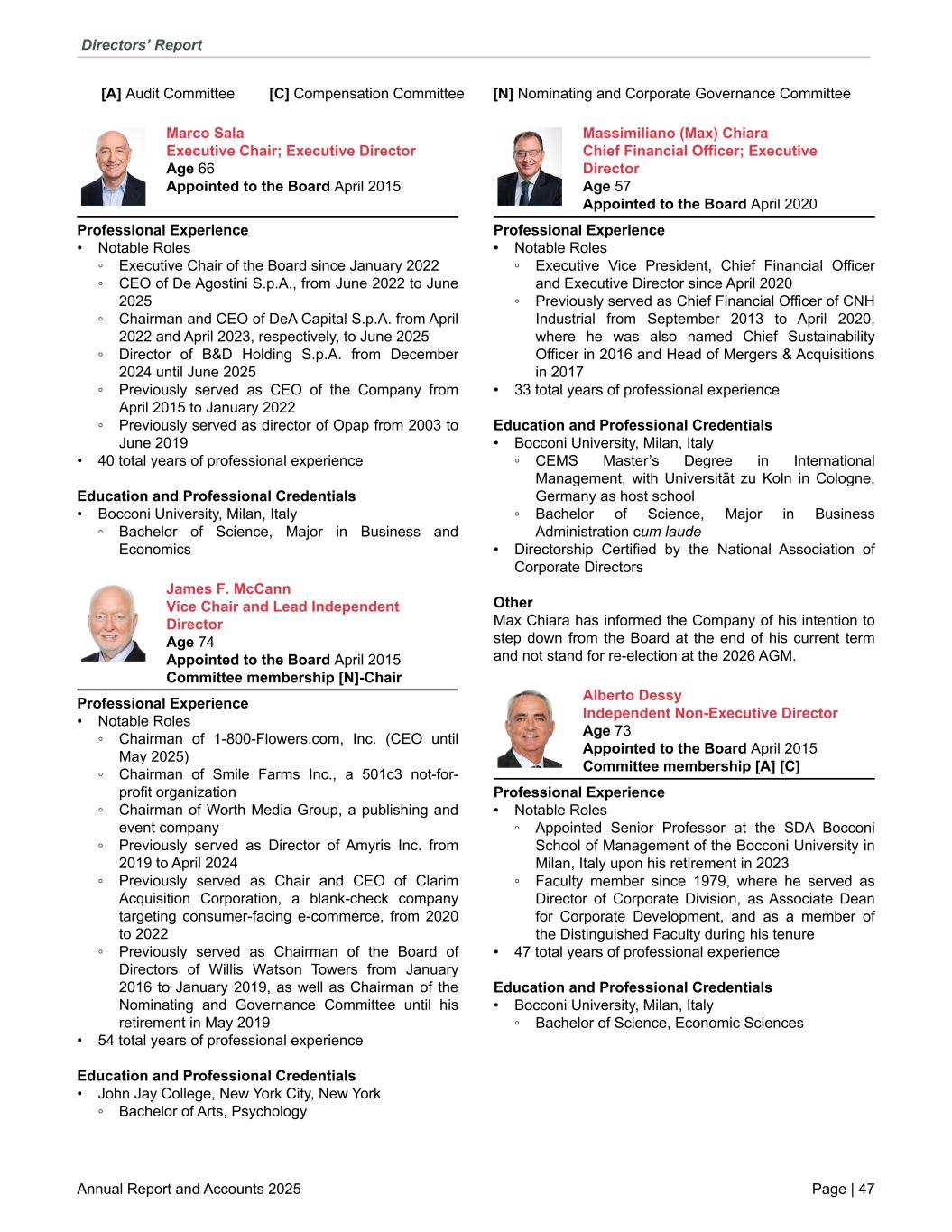 [A] Audit Committee [C] Compensation Committee [N] Nominating and Corporate Governance Committee Marco Sala Executive Chair; Executive Director Age 66 Appointed to the Board April 2015 Professional Experience • Notable Roles ◦ Executive Chair of the Board since January 2022 ◦ CEO of De Agostini S.p.A., from June 2022 to June 2025 ◦ Chairman and CEO of DeA Capital S.p.A. from April 2022 and April 2023, respectively, to June 2025 ◦ Director of B&D Holding S.p.A. from December 2024 until June 2025 ◦ Previously served as CEO of the Company from April 2015 to January 2022 ◦ Previously served as director of Opap from 2003 to June 2019 • 40 total years of professional experience Education and Professional Credentials • Bocconi University, Milan, Italy ◦ Bachelor of Science, Major in Business and Economics James F. McCann Vice Chair and Lead Independent Director Age 74 Appointed to the Board April 2015 Committee membership [N]-Chair Professional Experience • Notable Roles ◦ Chairman of 1-800-Flowers.com, Inc. (CEO until May 2025) ◦ Chairman of Smile Farms Inc., a 501c3 not-for- profit organization ◦ Chairman of Worth Media Group, a publishing and event company ◦ Previously served as Director of Amyris Inc. from 2019 to April 2024 ◦ Previously served as Chair and CEO of Clarim Acquisition Corporation, a blank-check company targeting consumer-facing e-commerce, from 2020 to 2022 ◦ Previously served as Chairman of the Board of Directors of Willis Watson Towers from January 2016 to January 2019, as well as Chairman of the Nominating and Governance Committee until his retirement in May 2019 • 54 total years of professional experience Education and Professional Credentials • John Jay College, New York City, New York ◦ Bachelor of Arts, Psychology Massimiliano (Max) Chiara Chief Financial Officer; Executive Director Age 57 Appointed to the Board April 2020 Professional Experience • Notable Roles ◦ Executive Vice President, Chief Financial Officer and Executive Director since April 2020 ◦ Previously served as Chief Financial Officer of CNH Industrial from September 2013 to April 2020, where he was also named Chief Sustainability Officer in 2016 and Head of Mergers & Acquisitions in 2017 • 33 total years of professional experience Education and Professional Credentials • Bocconi University, Milan, Italy ◦ CEMS Master’s Degree in International Management, with Universität zu Koln in Cologne, Germany as host school ◦ Bachelor of Science, Major in Business Administration cum laude • Directorship Certified by the National Association of Corporate Directors Other Max Chiara has informed the Company of his intention to step down from the Board at the end of his current term and not stand for re-election at the 2026 AGM. Alberto Dessy Independent Non-Executive Director Age 73 Appointed to the Board April 2015 Committee membership [A] [C] Professional Experience • Notable Roles ◦ Appointed Senior Professor at the SDA Bocconi School of Management of the Bocconi University in Milan, Italy upon his retirement in 2023 ◦ Faculty member since 1979, where he served as Director of Corporate Division, as Associate Dean for Corporate Development, and as a member of the Distinguished Faculty during his tenure • 47 total years of professional experience Education and Professional Credentials • Bocconi University, Milan, Italy ◦ Bachelor of Science, Economic Sciences Directors’ Report Annual Report and Accounts 2025 Page | 47