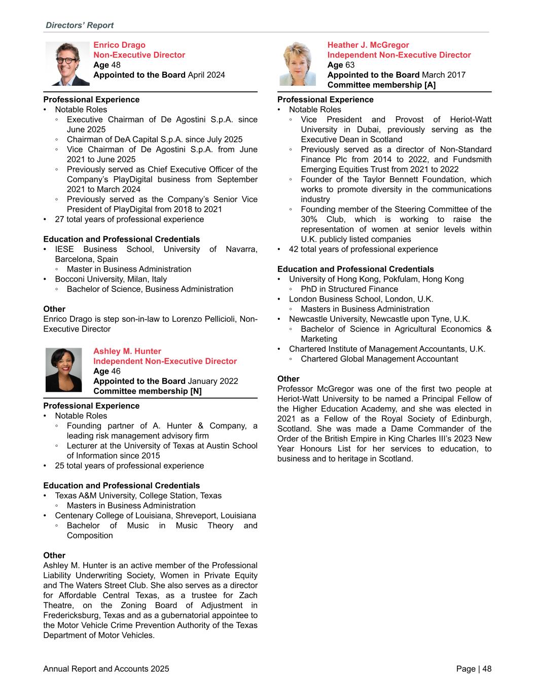 Enrico Drago Non-Executive Director Age 48 Appointed to the Board April 2024 Professional Experience • Notable Roles ◦ Executive Chairman of De Agostini S.p.A. since June 2025 ◦ Chairman of DeA Capital S.p.A. since July 2025 ◦ Vice Chairman of De Agostini S.p.A. from June 2021 to June 2025 ◦ Previously served as Chief Executive Officer of the Company’s PlayDigital business from September 2021 to March 2024 ◦ Previously served as the Company’s Senior Vice President of PlayDigital from 2018 to 2021 • 27 total years of professional experience Education and Professional Credentials • IESE Business School, University of Navarra, Barcelona, Spain ◦ Master in Business Administration • Bocconi University, Milan, Italy ◦ Bachelor of Science, Business Administration Other Enrico Drago is step son-in-law to Lorenzo Pellicioli, Non- Executive Director Ashley M. Hunter Independent Non-Executive Director Age 46 Appointed to the Board January 2022 Committee membership [N] Professional Experience • Notable Roles ◦ Founding partner of A. Hunter & Company, a leading risk management advisory firm ◦ Lecturer at the University of Texas at Austin School of Information since 2015 • 25 total years of professional experience Education and Professional Credentials • Texas A&M University, College Station, Texas ◦ Masters in Business Administration • Centenary College of Louisiana, Shreveport, Louisiana ◦ Bachelor of Music in Music Theory and Composition Other Ashley M. Hunter is an active member of the Professional Liability Underwriting Society, Women in Private Equity and The Waters Street Club. She also serves as a director for Affordable Central Texas, as a trustee for Zach Theatre, on the Zoning Board of Adjustment in Fredericksburg, Texas and as a gubernatorial appointee to the Motor Vehicle Crime Prevention Authority of the Texas Department of Motor Vehicles. Heather J. McGregor Independent Non-Executive Director Age 63 Appointed to the Board March 2017 Committee membership [A] Professional Experience • Notable Roles ◦ Vice President and Provost of Heriot-Watt University in Dubai, previously serving as the Executive Dean in Scotland ◦ Previously served as a director of Non-Standard Finance Plc from 2014 to 2022, and Fundsmith Emerging Equities Trust from 2021 to 2022 ◦ Founder of the Taylor Bennett Foundation, which works to promote diversity in the communications industry ◦ Founding member of the Steering Committee of the 30% Club, which is working to raise the representation of women at senior levels within U.K. publicly listed companies • 42 total years of professional experience Education and Professional Credentials • University of Hong Kong, Pokfulam, Hong Kong ◦ PhD in Structured Finance • London Business School, London, U.K. ◦ Masters in Business Administration • Newcastle University, Newcastle upon Tyne, U.K. ◦ Bachelor of Science in Agricultural Economics & Marketing • Chartered Institute of Management Accountants, U.K. ◦ Chartered Global Management Accountant Other Professor McGregor was one of the first two people at Heriot-Watt University to be named a Principal Fellow of the Higher Education Academy, and she was elected in 2021 as a Fellow of the Royal Society of Edinburgh, Scotland. She was made a Dame Commander of the Order of the British Empire in King Charles III’s 2023 New Year Honours List for her services to education, to business and to heritage in Scotland. Directors’ Report Annual Report and Accounts 2025 Page | 48