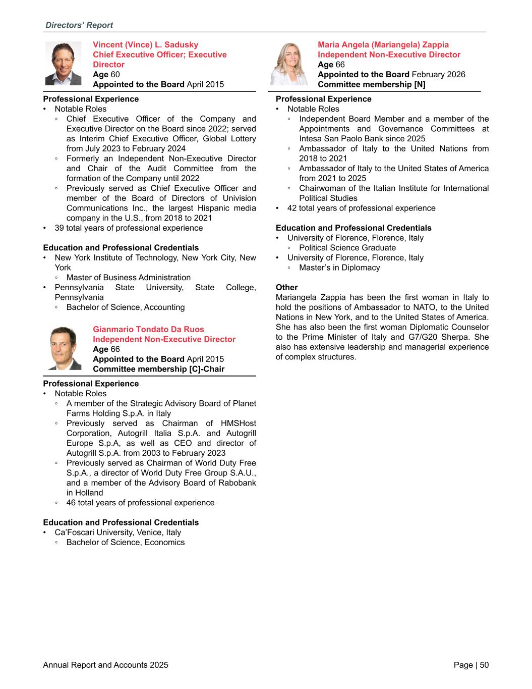 Vincent (Vince) L. Sadusky Chief Executive Officer; Executive Director Age 60 Appointed to the Board April 2015 Professional Experience • Notable Roles ◦ Chief Executive Officer of the Company and Executive Director on the Board since 2022; served as Interim Chief Executive Officer, Global Lottery from July 2023 to February 2024 ◦ Formerly an Independent Non-Executive Director and Chair of the Audit Committee from the formation of the Company until 2022 ◦ Previously served as Chief Executive Officer and member of the Board of Directors of Univision Communications Inc., the largest Hispanic media company in the U.S., from 2018 to 2021 • 39 total years of professional experience Education and Professional Credentials • New York Institute of Technology, New York City, New York ◦ Master of Business Administration • Pennsylvania State University, State College, Pennsylvania ◦ Bachelor of Science, Accounting Gianmario Tondato Da Ruos Independent Non-Executive Director Age 66 Appointed to the Board April 2015 Committee membership [C]-Chair Professional Experience • Notable Roles ◦ A member of the Strategic Advisory Board of Planet Farms Holding S.p.A. in Italy ◦ Previously served as Chairman of HMSHost Corporation, Autogrill Italia S.p.A. and Autogrill Europe S.p.A, as well as CEO and director of Autogrill S.p.A. from 2003 to February 2023 ◦ Previously served as Chairman of World Duty Free S.p.A., a director of World Duty Free Group S.A.U., and a member of the Advisory Board of Rabobank in Holland ◦ 46 total years of professional experience Education and Professional Credentials • Ca’Foscari University, Venice, Italy ◦ Bachelor of Science, Economics Maria Angela (Mariangela) Zappia Independent Non-Executive Director Age 66 Appointed to the Board February 2026 Committee membership [N] Professional Experience • Notable Roles ◦ Independent Board Member and a member of the Appointments and Governance Committees at Intesa San Paolo Bank since 2025 ◦ Ambassador of Italy to the United Nations from 2018 to 2021 ◦ Ambassador of Italy to the United States of America from 2021 to 2025 ◦ Chairwoman of the Italian Institute for International Political Studies • 42 total years of professional experience Education and Professional Credentials • University of Florence, Florence, Italy ◦ Political Science Graduate • University of Florence, Florence, Italy ◦ Master’s in Diplomacy Other Mariangela Zappia has been the first woman in Italy to hold the positions of Ambassador to NATO, to the United Nations in New York, and to the United States of America. She has also been the first woman Diplomatic Counselor to the Prime Minister of Italy and G7/G20 Sherpa. She also has extensive leadership and managerial experience of complex structures. Directors’ Report Annual Report and Accounts 2025 Page | 50
