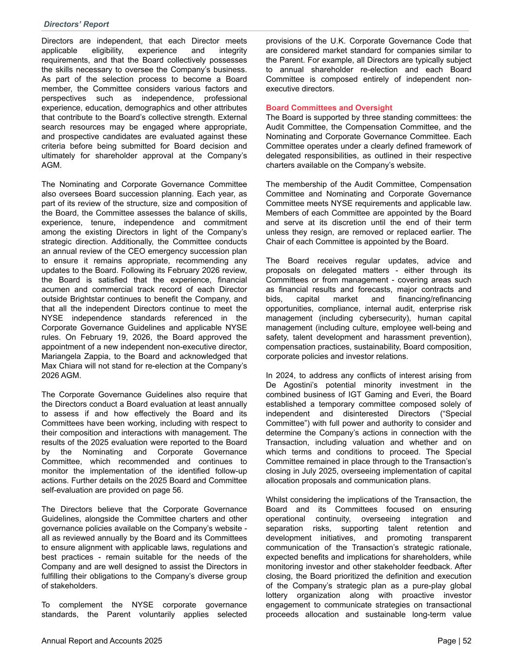 Directors are independent, that each Director meets applicable eligibility, experience and integrity requirements, and that the Board collectively possesses the skills necessary to oversee the Company’s business. As part of the selection process to become a Board member, the Committee considers various factors and perspectives such as independence, professional experience, education, demographics and other attributes that contribute to the Board’s collective strength. External search resources may be engaged where appropriate, and prospective candidates are evaluated against these criteria before being submitted for Board decision and ultimately for shareholder approval at the Company’s AGM. The Nominating and Corporate Governance Committee also oversees Board succession planning. Each year, as part of its review of the structure, size and composition of the Board, the Committee assesses the balance of skills, experience, tenure, independence and commitment among the existing Directors in light of the Company’s strategic direction. Additionally, the Committee conducts an annual review of the CEO emergency succession plan to ensure it remains appropriate, recommending any updates to the Board. Following its February 2026 review, the Board is satisfied that the experience, financial acumen and commercial track record of each Director outside Brightstar continues to benefit the Company, and that all the independent Directors continue to meet the NYSE independence standards referenced in the Corporate Governance Guidelines and applicable NYSE rules. On February 19, 2026, the Board approved the appointment of a new independent non-executive director, Mariangela Zappia, to the Board and acknowledged that Max Chiara will not stand for re-election at the Company’s 2026 AGM. The Corporate Governance Guidelines also require that the Directors conduct a Board evaluation at least annually to assess if and how effectively the Board and its Committees have been working, including with respect to their composition and interactions with management. The results of the 2025 evaluation were reported to the Board by the Nominating and Corporate Governance Committee, which recommended and continues to monitor the implementation of the identified follow-up actions. Further details on the 2025 Board and Committee self-evaluation are provided on page 56. The Directors believe that the Corporate Governance Guidelines, alongside the Committee charters and other governance policies available on the Company’s website - all as reviewed annually by the Board and its Committees to ensure alignment with applicable laws, regulations and best practices - remain suitable for the needs of the Company and are well designed to assist the Directors in fulfilling their obligations to the Company’s diverse group of stakeholders. To complement the NYSE corporate governance standards, the Parent voluntarily applies selected provisions of the U.K. Corporate Governance Code that are considered market standard for companies similar to the Parent. For example, all Directors are typically subject to annual shareholder re-election and each Board Committee is composed entirely of independent non- executive directors. Board Committees and Oversight The Board is supported by three standing committees: the Audit Committee, the Compensation Committee, and the Nominating and Corporate Governance Committee. Each Committee operates under a clearly defined framework of delegated responsibilities, as outlined in their respective charters available on the Company’s website. The membership of the Audit Committee, Compensation Committee and Nominating and Corporate Governance Committee meets NYSE requirements and applicable law. Members of each Committee are appointed by the Board and serve at its discretion until the end of their term unless they resign, are removed or replaced earlier. The Chair of each Committee is appointed by the Board. The Board receives regular updates, advice and proposals on delegated matters - either through its Committees or from management - covering areas such as financial results and forecasts, major contracts and bids, capital market and financing/refinancing opportunities, compliance, internal audit, enterprise risk management (including cybersecurity), human capital management (including culture, employee well-being and safety, talent development and harassment prevention), compensation practices, sustainability, Board composition, corporate policies and investor relations. In 2024, to address any conflicts of interest arising from De Agostini’s potential minority investment in the combined business of IGT Gaming and Everi, the Board established a temporary committee composed solely of independent and disinterested Directors (“Special Committee”) with full power and authority to consider and determine the Company’s actions in connection with the Transaction, including valuation and whether and on which terms and conditions to proceed. The Special Committee remained in place through to the Transaction’s closing in July 2025, overseeing implementation of capital allocation proposals and communication plans. Whilst considering the implications of the Transaction, the Board and its Committees focused on ensuring operational continuity, overseeing integration and separation risks, supporting talent retention and development initiatives, and promoting transparent communication of the Transaction’s strategic rationale, expected benefits and implications for shareholders, while monitoring investor and other stakeholder feedback. After closing, the Board prioritized the definition and execution of the Company’s strategic plan as a pure-play global lottery organization along with proactive investor engagement to communicate strategies on transactional proceeds allocation and sustainable long-term value Directors’ Report Annual Report and Accounts 2025 Page | 52