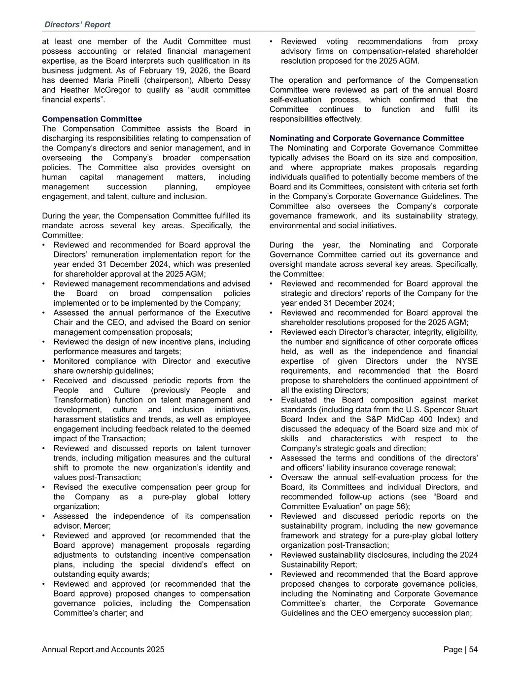 at least one member of the Audit Committee must possess accounting or related financial management expertise, as the Board interprets such qualification in its business judgment. As of February 19, 2026, the Board has deemed Maria Pinelli (chairperson), Alberto Dessy and Heather McGregor to qualify as “audit committee financial experts”. Compensation Committee The Compensation Committee assists the Board in discharging its responsibilities relating to compensation of the Company’s directors and senior management, and in overseeing the Company’s broader compensation policies. The Committee also provides oversight on human capital management matters, including management succession planning, employee engagement, and talent, culture and inclusion. During the year, the Compensation Committee fulfilled its mandate across several key areas. Specifically, the Committee: • Reviewed and recommended for Board approval the Directors’ remuneration implementation report for the year ended 31 December 2024, which was presented for shareholder approval at the 2025 AGM; • Reviewed management recommendations and advised the Board on broad compensation policies implemented or to be implemented by the Company; • Assessed the annual performance of the Executive Chair and the CEO, and advised the Board on senior management compensation proposals; • Reviewed the design of new incentive plans, including performance measures and targets; • Monitored compliance with Director and executive share ownership guidelines; • Received and discussed periodic reports from the People and Culture (previously People and Transformation) function on talent management and development, culture and inclusion initiatives, harassment statistics and trends, as well as employee engagement including feedback related to the deemed impact of the Transaction; • Reviewed and discussed reports on talent turnover trends, including mitigation measures and the cultural shift to promote the new organization’s identity and values post-Transaction; • Revised the executive compensation peer group for the Company as a pure-play global lottery organization; • Assessed the independence of its compensation advisor, Mercer; • Reviewed and approved (or recommended that the Board approve) management proposals regarding adjustments to outstanding incentive compensation plans, including the special dividend’s effect on outstanding equity awards; • Reviewed and approved (or recommended that the Board approve) proposed changes to compensation governance policies, including the Compensation Committee’s charter; and • Reviewed voting recommendations from proxy advisory firms on compensation-related shareholder resolution proposed for the 2025 AGM. The operation and performance of the Compensation Committee were reviewed as part of the annual Board self-evaluation process, which confirmed that the Committee continues to function and fulfil its responsibilities effectively. Nominating and Corporate Governance Committee The Nominating and Corporate Governance Committee typically advises the Board on its size and composition, and where appropriate makes proposals regarding individuals qualified to potentially become members of the Board and its Committees, consistent with criteria set forth in the Company’s Corporate Governance Guidelines. The Committee also oversees the Company’s corporate governance framework, and its sustainability strategy, environmental and social initiatives. During the year, the Nominating and Corporate Governance Committee carried out its governance and oversight mandate across several key areas. Specifically, the Committee: • Reviewed and recommended for Board approval the strategic and directors’ reports of the Company for the year ended 31 December 2024; • Reviewed and recommended for Board approval the shareholder resolutions proposed for the 2025 AGM; • Reviewed each Director’s character, integrity, eligibility, the number and significance of other corporate offices held, as well as the independence and financial expertise of given Directors under the NYSE requirements, and recommended that the Board propose to shareholders the continued appointment of all the existing Directors; • Evaluated the Board composition against market standards (including data from the U.S. Spencer Stuart Board Index and the S&P MidCap 400 Index) and discussed the adequacy of the Board size and mix of skills and characteristics with respect to the Company’s strategic goals and direction; • Assessed the terms and conditions of the directors’ and officers' liability insurance coverage renewal; • Oversaw the annual self-evaluation process for the Board, its Committees and individual Directors, and recommended follow-up actions (see “Board and Committee Evaluation” on page 56); • Reviewed and discussed periodic reports on the sustainability program, including the new governance framework and strategy for a pure-play global lottery organization post-Transaction; • Reviewed sustainability disclosures, including the 2024 Sustainability Report; • Reviewed and recommended that the Board approve proposed changes to corporate governance policies, including the Nominating and Corporate Governance Committee’s charter, the Corporate Governance Guidelines and the CEO emergency succession plan; Directors’ Report Annual Report and Accounts 2025 Page | 54