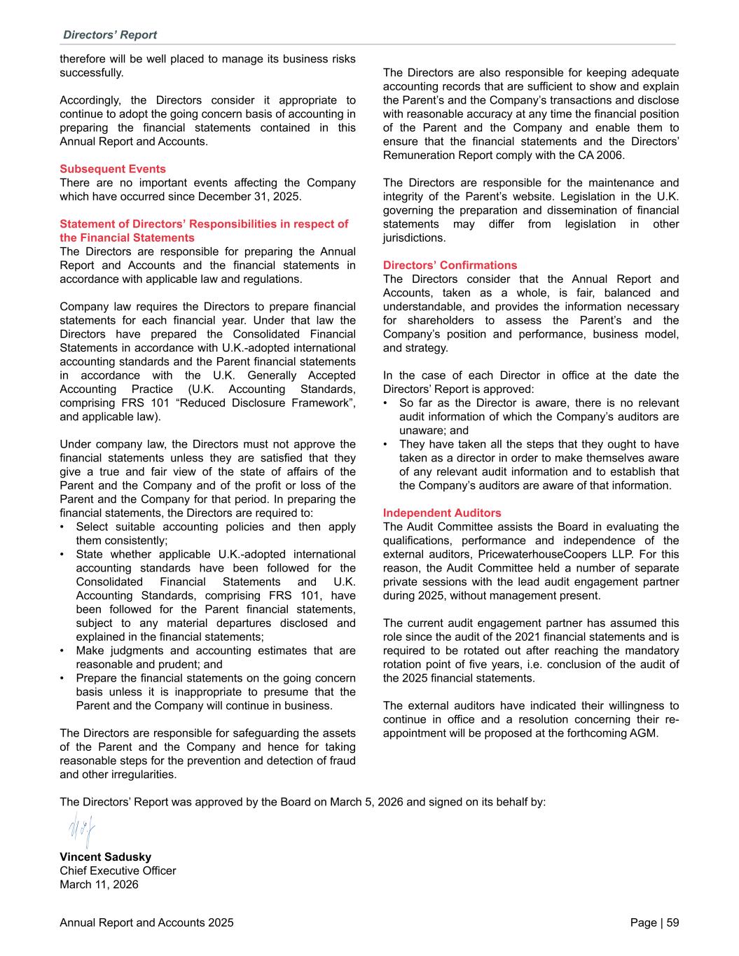 therefore will be well placed to manage its business risks successfully. Accordingly, the Directors consider it appropriate to continue to adopt the going concern basis of accounting in preparing the financial statements contained in this Annual Report and Accounts. Subsequent Events There are no important events affecting the Company which have occurred since December 31, 2025. Statement of Directors’ Responsibilities in respect of the Financial Statements The Directors are responsible for preparing the Annual Report and Accounts and the financial statements in accordance with applicable law and regulations. Company law requires the Directors to prepare financial statements for each financial year. Under that law the Directors have prepared the Consolidated Financial Statements in accordance with U.K.-adopted international accounting standards and the Parent financial statements in accordance with the U.K. Generally Accepted Accounting Practice (U.K. Accounting Standards, comprising FRS 101 “Reduced Disclosure Framework”, and applicable law). Under company law, the Directors must not approve the financial statements unless they are satisfied that they give a true and fair view of the state of affairs of the Parent and the Company and of the profit or loss of the Parent and the Company for that period. In preparing the financial statements, the Directors are required to: • Select suitable accounting policies and then apply them consistently; • State whether applicable U.K.-adopted international accounting standards have been followed for the Consolidated Financial Statements and U.K. Accounting Standards, comprising FRS 101, have been followed for the Parent financial statements, subject to any material departures disclosed and explained in the financial statements; • Make judgments and accounting estimates that are reasonable and prudent; and • Prepare the financial statements on the going concern basis unless it is inappropriate to presume that the Parent and the Company will continue in business. The Directors are responsible for safeguarding the assets of the Parent and the Company and hence for taking reasonable steps for the prevention and detection of fraud and other irregularities. The Directors are also responsible for keeping adequate accounting records that are sufficient to show and explain the Parent’s and the Company’s transactions and disclose with reasonable accuracy at any time the financial position of the Parent and the Company and enable them to ensure that the financial statements and the Directors’ Remuneration Report comply with the CA 2006. The Directors are responsible for the maintenance and integrity of the Parent’s website. Legislation in the U.K. governing the preparation and dissemination of financial statements may differ from legislation in other jurisdictions. Directors’ Confirmations The Directors consider that the Annual Report and Accounts, taken as a whole, is fair, balanced and understandable, and provides the information necessary for shareholders to assess the Parent’s and the Company’s position and performance, business model, and strategy. In the case of each Director in office at the date the Directors’ Report is approved: • So far as the Director is aware, there is no relevant audit information of which the Company’s auditors are unaware; and • They have taken all the steps that they ought to have taken as a director in order to make themselves aware of any relevant audit information and to establish that the Company’s auditors are aware of that information. Independent Auditors The Audit Committee assists the Board in evaluating the qualifications, performance and independence of the external auditors, PricewaterhouseCoopers LLP. For this reason, the Audit Committee held a number of separate private sessions with the lead audit engagement partner during 2025, without management present. The current audit engagement partner has assumed this role since the audit of the 2021 financial statements and is required to be rotated out after reaching the mandatory rotation point of five years, i.e. conclusion of the audit of the 2025 financial statements. The external auditors have indicated their willingness to continue in office and a resolution concerning their re- appointment will be proposed at the forthcoming AGM. The Directors’ Report was approved by the Board on March 5, 2026 and signed on its behalf by: Vincent Sadusky Chief Executive Officer March 11, 2026 Directors’ Report Annual Report and Accounts 2025 Page | 59