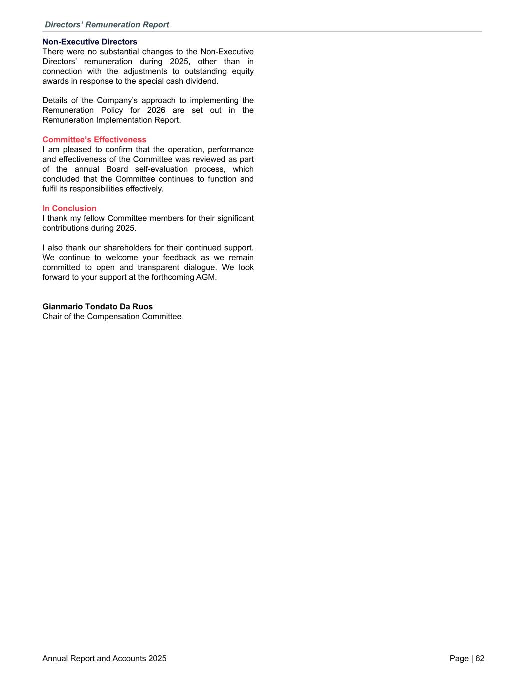 Non-Executive Directors There were no substantial changes to the Non-Executive Directors’ remuneration during 2025, other than in connection with the adjustments to outstanding equity awards in response to the special cash dividend. Details of the Company’s approach to implementing the Remuneration Policy for 2026 are set out in the Remuneration Implementation Report. Committee’s Effectiveness I am pleased to confirm that the operation, performance and effectiveness of the Committee was reviewed as part of the annual Board self-evaluation process, which concluded that the Committee continues to function and fulfil its responsibilities effectively. In Conclusion I thank my fellow Committee members for their significant contributions during 2025. I also thank our shareholders for their continued support. We continue to welcome your feedback as we remain committed to open and transparent dialogue. We look forward to your support at the forthcoming AGM. Gianmario Tondato Da Ruos Chair of the Compensation Committee Directors’ Remuneration Report Annual Report and Accounts 2025 Page | 62