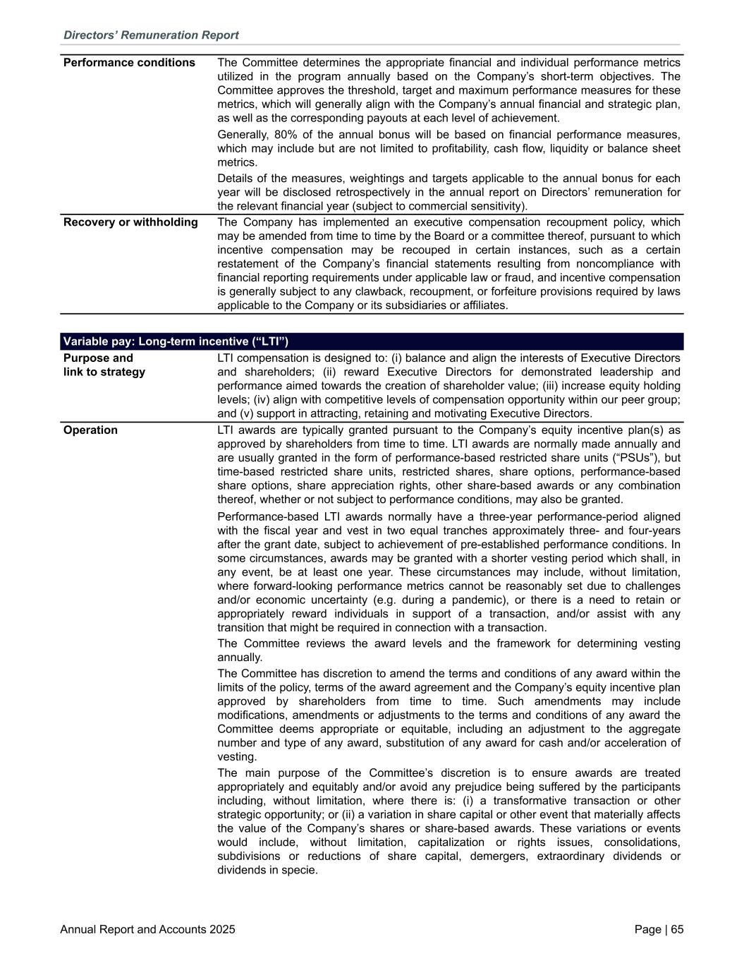 Performance conditions The Committee determines the appropriate financial and individual performance metrics utilized in the program annually based on the Company’s short-term objectives. The Committee approves the threshold, target and maximum performance measures for these metrics, which will generally align with the Company’s annual financial and strategic plan, as well as the corresponding payouts at each level of achievement. Generally, 80% of the annual bonus will be based on financial performance measures, which may include but are not limited to profitability, cash flow, liquidity or balance sheet metrics. Details of the measures, weightings and targets applicable to the annual bonus for each year will be disclosed retrospectively in the annual report on Directors’ remuneration for the relevant financial year (subject to commercial sensitivity). Recovery or withholding The Company has implemented an executive compensation recoupment policy, which may be amended from time to time by the Board or a committee thereof, pursuant to which incentive compensation may be recouped in certain instances, such as a certain restatement of the Company’s financial statements resulting from noncompliance with financial reporting requirements under applicable law or fraud, and incentive compensation is generally subject to any clawback, recoupment, or forfeiture provisions required by laws applicable to the Company or its subsidiaries or affiliates. Variable pay: Long-term incentive (“LTI”) Purpose and link to strategy LTI compensation is designed to: (i) balance and align the interests of Executive Directors and shareholders; (ii) reward Executive Directors for demonstrated leadership and performance aimed towards the creation of shareholder value; (iii) increase equity holding levels; (iv) align with competitive levels of compensation opportunity within our peer group; and (v) support in attracting, retaining and motivating Executive Directors. Operation LTI awards are typically granted pursuant to the Company’s equity incentive plan(s) as approved by shareholders from time to time. LTI awards are normally made annually and are usually granted in the form of performance-based restricted share units (“PSUs”), but time-based restricted share units, restricted shares, share options, performance-based share options, share appreciation rights, other share-based awards or any combination thereof, whether or not subject to performance conditions, may also be granted. Performance-based LTI awards normally have a three-year performance-period aligned with the fiscal year and vest in two equal tranches approximately three- and four-years after the grant date, subject to achievement of pre-established performance conditions. In some circumstances, awards may be granted with a shorter vesting period which shall, in any event, be at least one year. These circumstances may include, without limitation, where forward-looking performance metrics cannot be reasonably set due to challenges and/or economic uncertainty (e.g. during a pandemic), or there is a need to retain or appropriately reward individuals in support of a transaction, and/or assist with any transition that might be required in connection with a transaction. The Committee reviews the award levels and the framework for determining vesting annually. The Committee has discretion to amend the terms and conditions of any award within the limits of the policy, terms of the award agreement and the Company’s equity incentive plan approved by shareholders from time to time. Such amendments may include modifications, amendments or adjustments to the terms and conditions of any award the Committee deems appropriate or equitable, including an adjustment to the aggregate number and type of any award, substitution of any award for cash and/or acceleration of vesting. The main purpose of the Committee’s discretion is to ensure awards are treated appropriately and equitably and/or avoid any prejudice being suffered by the participants including, without limitation, where there is: (i) a transformative transaction or other strategic opportunity; or (ii) a variation in share capital or other event that materially affects the value of the Company’s shares or share-based awards. These variations or events would include, without limitation, capitalization or rights issues, consolidations, subdivisions or reductions of share capital, demergers, extraordinary dividends or dividends in specie. Directors’ Remuneration Report Annual Report and Accounts 2025 Page | 65