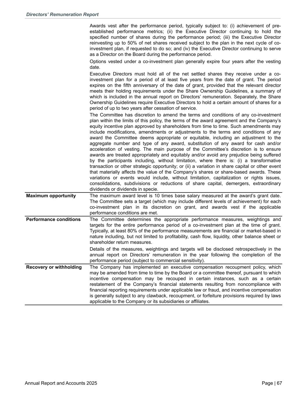 Awards vest after the performance period, typically subject to: (i) achievement of pre- established performance metrics; (ii) the Executive Director continuing to hold the specified number of shares during the performance period; (iii) the Executive Director reinvesting up to 50% of net shares received subject to the plan in the next cycle of co- investment plan, if requested to do so; and (iv) the Executive Director continuing to serve as a Director on the Board during the performance period. Options vested under a co-investment plan generally expire four years after the vesting date. Executive Directors must hold all of the net settled shares they receive under a co- investment plan for a period of at least five years from the date of grant. The period expires on the fifth anniversary of the date of grant, provided that the relevant director meets their holding requirements under the Share Ownership Guidelines, a summary of which is included in the annual report on Directors’ remuneration. Separately, the Share Ownership Guidelines require Executive Directors to hold a certain amount of shares for a period of up to two years after cessation of service. The Committee has discretion to amend the terms and conditions of any co-investment plan within the limits of this policy, the terms of the award agreement and the Company’s equity incentive plan approved by shareholders from time to time. Such amendments may include modifications, amendments or adjustments to the terms and conditions of any award the Committee deems appropriate or equitable, including an adjustment to the aggregate number and type of any award, substitution of any award for cash and/or acceleration of vesting. The main purpose of the Committee’s discretion is to ensure awards are treated appropriately and equitably and/or avoid any prejudice being suffered by the participants including, without limitation, where there is: (i) a transformative transaction or other strategic opportunity; or (ii) a variation in share capital or other event that materially affects the value of the Company’s shares or share-based awards. These variations or events would include, without limitation, capitalization or rights issues, consolidations, subdivisions or reductions of share capital, demergers, extraordinary dividends or dividends in specie. Maximum opportunity The maximum award level is 10 times base salary measured at the award’s grant date. The Committee sets a target (which may include different levels of achievement) for each co-investment plan in its discretion on grant, and awards vest if the applicable performance conditions are met. Performance conditions The Committee determines the appropriate performance measures, weightings and targets for the entire performance period of a co-investment plan at the time of grant. Typically, at least 80% of the performance measurements are financial or market-based in nature including, but not limited to profitability, cash flow, liquidity, other balance sheet or shareholder return measures. Details of the measures, weightings and targets will be disclosed retrospectively in the annual report on Directors’ remuneration in the year following the completion of the performance period (subject to commercial sensitivity). Recovery or withholding The Company has implemented an executive compensation recoupment policy, which may be amended from time to time by the Board or a committee thereof, pursuant to which incentive compensation may be recouped in certain instances, such as a certain restatement of the Company’s financial statements resulting from noncompliance with financial reporting requirements under applicable law or fraud, and incentive compensation is generally subject to any clawback, recoupment, or forfeiture provisions required by laws applicable to the Company or its subsidiaries or affiliates. Directors’ Remuneration Report Annual Report and Accounts 2025 Page | 67