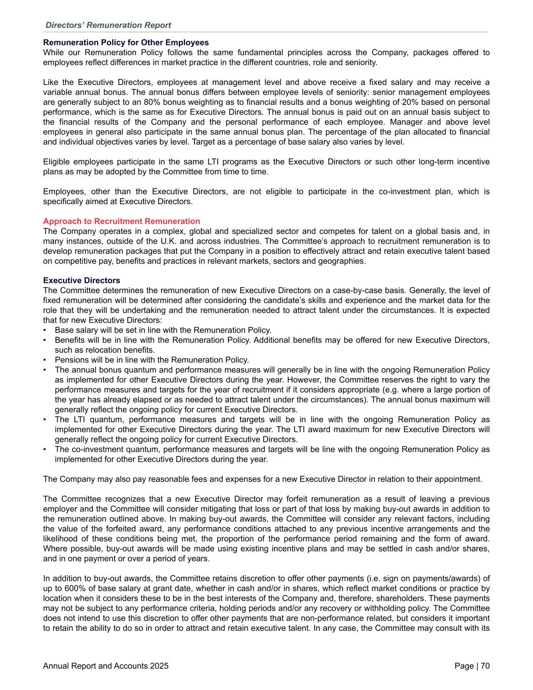 Remuneration Policy for Other Employees While our Remuneration Policy follows the same fundamental principles across the Company, packages offered to employees reflect differences in market practice in the different countries, role and seniority. Like the Executive Directors, employees at management level and above receive a fixed salary and may receive a variable annual bonus. The annual bonus differs between employee levels of seniority: senior management employees are generally subject to an 80% bonus weighting as to financial results and a bonus weighting of 20% based on personal performance, which is the same as for Executive Directors. The annual bonus is paid out on an annual basis subject to the financial results of the Company and the personal performance of each employee. Manager and above level employees in general also participate in the same annual bonus plan. The percentage of the plan allocated to financial and individual objectives varies by level. Target as a percentage of base salary also varies by level. Eligible employees participate in the same LTI programs as the Executive Directors or such other long-term incentive plans as may be adopted by the Committee from time to time. Employees, other than the Executive Directors, are not eligible to participate in the co-investment plan, which is specifically aimed at Executive Directors. Approach to Recruitment Remuneration The Company operates in a complex, global and specialized sector and competes for talent on a global basis and, in many instances, outside of the U.K. and across industries. The Committee’s approach to recruitment remuneration is to develop remuneration packages that put the Company in a position to effectively attract and retain executive talent based on competitive pay, benefits and practices in relevant markets, sectors and geographies. Executive Directors The Committee determines the remuneration of new Executive Directors on a case-by-case basis. Generally, the level of fixed remuneration will be determined after considering the candidate’s skills and experience and the market data for the role that they will be undertaking and the remuneration needed to attract talent under the circumstances. It is expected that for new Executive Directors: • Base salary will be set in line with the Remuneration Policy. • Benefits will be in line with the Remuneration Policy. Additional benefits may be offered for new Executive Directors, such as relocation benefits. • Pensions will be in line with the Remuneration Policy. • The annual bonus quantum and performance measures will generally be in line with the ongoing Remuneration Policy as implemented for other Executive Directors during the year. However, the Committee reserves the right to vary the performance measures and targets for the year of recruitment if it considers appropriate (e.g. where a large portion of the year has already elapsed or as needed to attract talent under the circumstances). The annual bonus maximum will generally reflect the ongoing policy for current Executive Directors. • The LTI quantum, performance measures and targets will be in line with the ongoing Remuneration Policy as implemented for other Executive Directors during the year. The LTI award maximum for new Executive Directors will generally reflect the ongoing policy for current Executive Directors. • The co-investment quantum, performance measures and targets will be line with the ongoing Remuneration Policy as implemented for other Executive Directors during the year. The Company may also pay reasonable fees and expenses for a new Executive Director in relation to their appointment. The Committee recognizes that a new Executive Director may forfeit remuneration as a result of leaving a previous employer and the Committee will consider mitigating that loss or part of that loss by making buy-out awards in addition to the remuneration outlined above. In making buy-out awards, the Committee will consider any relevant factors, including the value of the forfeited award, any performance conditions attached to any previous incentive arrangements and the likelihood of these conditions being met, the proportion of the performance period remaining and the form of award. Where possible, buy-out awards will be made using existing incentive plans and may be settled in cash and/or shares, and in one payment or over a period of years. In addition to buy-out awards, the Committee retains discretion to offer other payments (i.e. sign on payments/awards) of up to 600% of base salary at grant date, whether in cash and/or in shares, which reflect market conditions or practice by location when it considers these to be in the best interests of the Company and, therefore, shareholders. These payments may not be subject to any performance criteria, holding periods and/or any recovery or withholding policy. The Committee does not intend to use this discretion to offer other payments that are non-performance related, but considers it important to retain the ability to do so in order to attract and retain executive talent. In any case, the Committee may consult with its Directors’ Remuneration Report Annual Report and Accounts 2025 Page | 70