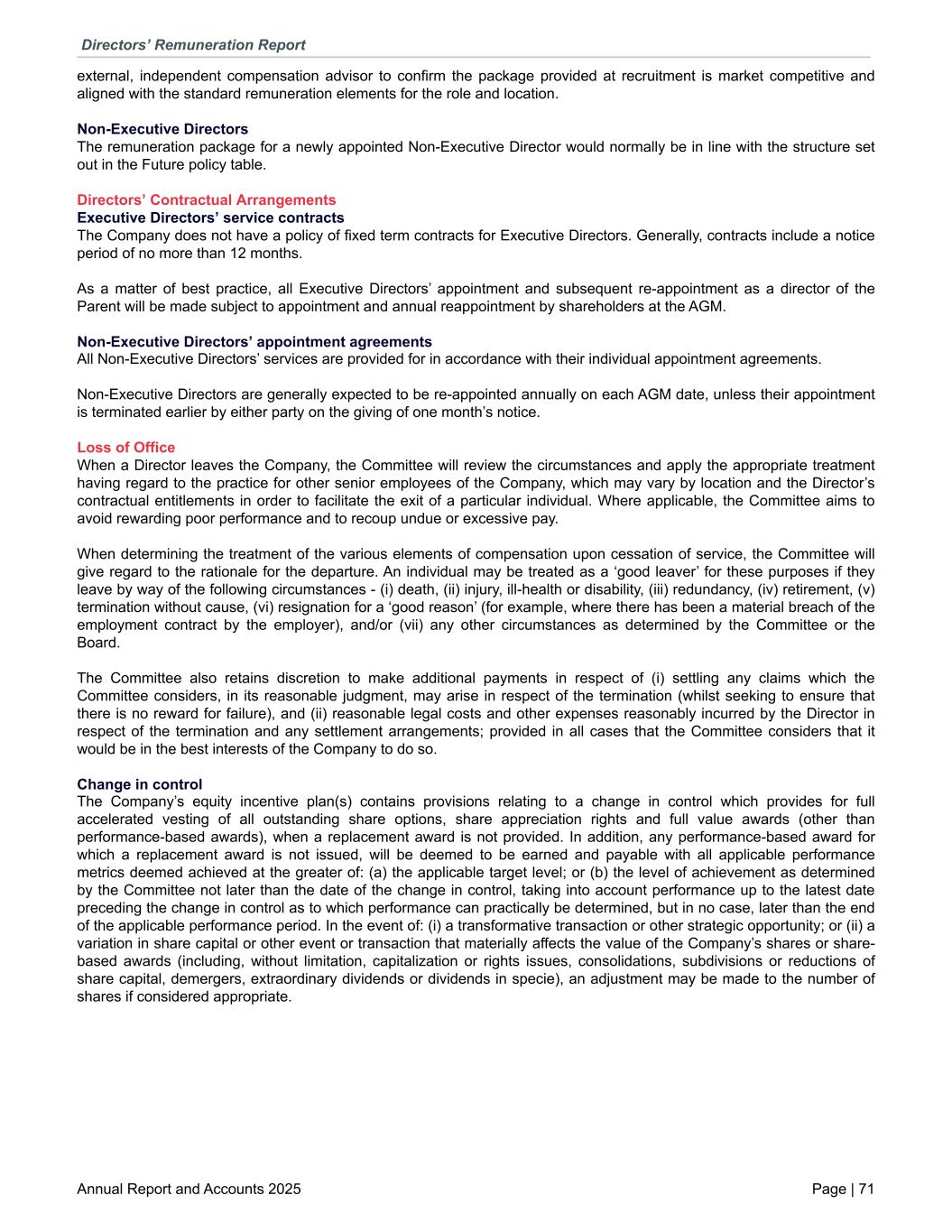external, independent compensation advisor to confirm the package provided at recruitment is market competitive and aligned with the standard remuneration elements for the role and location. Non-Executive Directors The remuneration package for a newly appointed Non-Executive Director would normally be in line with the structure set out in the Future policy table. Directors’ Contractual Arrangements Executive Directors’ service contracts The Company does not have a policy of fixed term contracts for Executive Directors. Generally, contracts include a notice period of no more than 12 months. As a matter of best practice, all Executive Directors’ appointment and subsequent re-appointment as a director of the Parent will be made subject to appointment and annual reappointment by shareholders at the AGM. Non-Executive Directors’ appointment agreements All Non-Executive Directors’ services are provided for in accordance with their individual appointment agreements. Non-Executive Directors are generally expected to be re-appointed annually on each AGM date, unless their appointment is terminated earlier by either party on the giving of one month’s notice. Loss of Office When a Director leaves the Company, the Committee will review the circumstances and apply the appropriate treatment having regard to the practice for other senior employees of the Company, which may vary by location and the Director’s contractual entitlements in order to facilitate the exit of a particular individual. Where applicable, the Committee aims to avoid rewarding poor performance and to recoup undue or excessive pay. When determining the treatment of the various elements of compensation upon cessation of service, the Committee will give regard to the rationale for the departure. An individual may be treated as a ‘good leaver’ for these purposes if they leave by way of the following circumstances - (i) death, (ii) injury, ill-health or disability, (iii) redundancy, (iv) retirement, (v) termination without cause, (vi) resignation for a ‘good reason’ (for example, where there has been a material breach of the employment contract by the employer), and/or (vii) any other circumstances as determined by the Committee or the Board. The Committee also retains discretion to make additional payments in respect of (i) settling any claims which the Committee considers, in its reasonable judgment, may arise in respect of the termination (whilst seeking to ensure that there is no reward for failure), and (ii) reasonable legal costs and other expenses reasonably incurred by the Director in respect of the termination and any settlement arrangements; provided in all cases that the Committee considers that it would be in the best interests of the Company to do so. Change in control The Company’s equity incentive plan(s) contains provisions relating to a change in control which provides for full accelerated vesting of all outstanding share options, share appreciation rights and full value awards (other than performance-based awards), when a replacement award is not provided. In addition, any performance-based award for which a replacement award is not issued, will be deemed to be earned and payable with all applicable performance metrics deemed achieved at the greater of: (a) the applicable target level; or (b) the level of achievement as determined by the Committee not later than the date of the change in control, taking into account performance up to the latest date preceding the change in control as to which performance can practically be determined, but in no case, later than the end of the applicable performance period. In the event of: (i) a transformative transaction or other strategic opportunity; or (ii) a variation in share capital or other event or transaction that materially affects the value of the Company’s shares or share- based awards (including, without limitation, capitalization or rights issues, consolidations, subdivisions or reductions of share capital, demergers, extraordinary dividends or dividends in specie), an adjustment may be made to the number of shares if considered appropriate. Directors’ Remuneration Report Annual Report and Accounts 2025 Page | 71