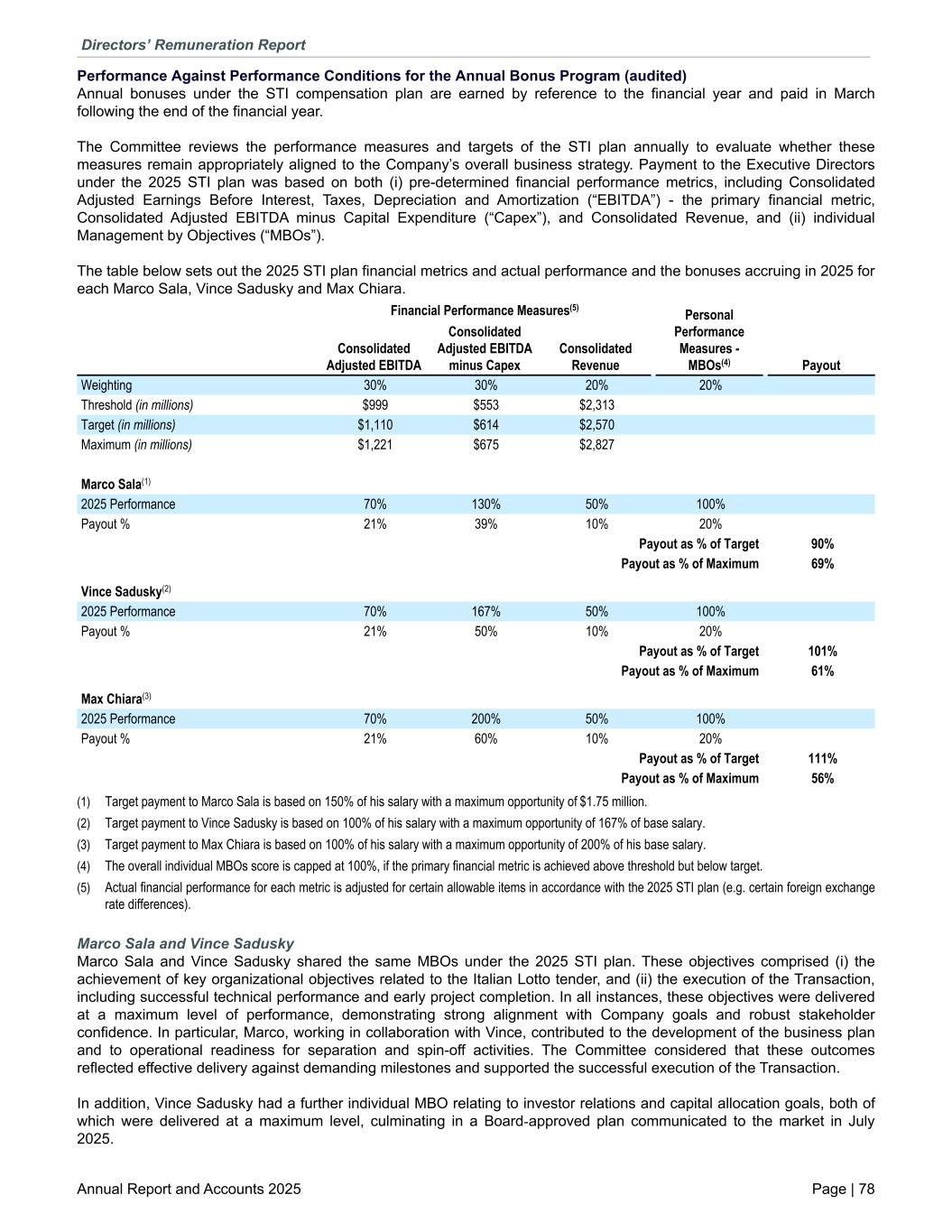 Performance Against Performance Conditions for the Annual Bonus Program (audited) Annual bonuses under the STI compensation plan are earned by reference to the financial year and paid in March following the end of the financial year. The Committee reviews the performance measures and targets of the STI plan annually to evaluate whether these measures remain appropriately aligned to the Company’s overall business strategy. Payment to the Executive Directors under the 2025 STI plan was based on both (i) pre-determined financial performance metrics, including Consolidated Adjusted Earnings Before Interest, Taxes, Depreciation and Amortization (“EBITDA”) - the primary financial metric, Consolidated Adjusted EBITDA minus Capital Expenditure (“Capex”), and Consolidated Revenue, and (ii) individual Management by Objectives (“MBOs”). The table below sets out the 2025 STI plan financial metrics and actual performance and the bonuses accruing in 2025 for each Marco Sala, Vince Sadusky and Max Chiara. Financial Performance Measures(5) Personal Performance Measures - MBOs(4) Payout Consolidated Adjusted EBITDA Consolidated Adjusted EBITDA minus Capex Consolidated Revenue Weighting 30% 30% 20% 20% Threshold (in millions) $999 $553 $2,313 Target (in millions) $1,110 $614 $2,570 Maximum (in millions) $1,221 $675 $2,827 Marco Sala(1) 2025 Performance 70% 130% 50% 100% Payout % 21% 39% 10% 20% Payout as % of Target 90% Payout as % of Maximum 69% Vince Sadusky(2) 2025 Performance 70% 167% 50% 100% Payout % 21% 50% 10% 20% Payout as % of Target 101% Payout as % of Maximum 61% Max Chiara(3) 2025 Performance 70% 200% 50% 100% Payout % 21% 60% 10% 20% Payout as % of Target 111% Payout as % of Maximum 56% (1) Target payment to Marco Sala is based on 150% of his salary with a maximum opportunity of $1.75 million. (2) Target payment to Vince Sadusky is based on 100% of his salary with a maximum opportunity of 167% of base salary. (3) Target payment to Max Chiara is based on 100% of his salary with a maximum opportunity of 200% of his base salary. (4) The overall individual MBOs score is capped at 100%, if the primary financial metric is achieved above threshold but below target. (5) Actual financial performance for each metric is adjusted for certain allowable items in accordance with the 2025 STI plan (e.g. certain foreign exchange rate differences). Marco Sala and Vince Sadusky Marco Sala and Vince Sadusky shared the same MBOs under the 2025 STI plan. These objectives comprised (i) the achievement of key organizational objectives related to the Italian Lotto tender, and (ii) the execution of the Transaction, including successful technical performance and early project completion. In all instances, these objectives were delivered at a maximum level of performance, demonstrating strong alignment with Company goals and robust stakeholder confidence. In particular, Marco, working in collaboration with Vince, contributed to the development of the business plan and to operational readiness for separation and spin-off activities. The Committee considered that these outcomes reflected effective delivery against demanding milestones and supported the successful execution of the Transaction. In addition, Vince Sadusky had a further individual MBO relating to investor relations and capital allocation goals, both of which were delivered at a maximum level, culminating in a Board-approved plan communicated to the market in July 2025. Directors’ Remuneration Report Annual Report and Accounts 2025 Page | 78