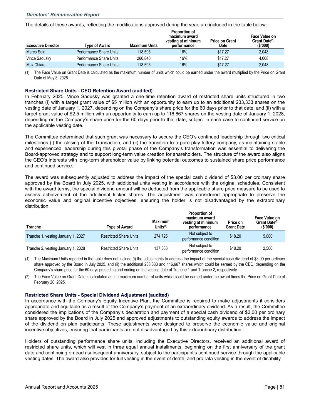 The details of these awards, reflecting the modifications approved during the year, are included in the table below: Executive Director Type of Award Maximum Units Proportion of maximum award vesting at minimum performance Price on Grant Date Face Value on Grant Date(1) ($’000) Marco Sala Performance Share Units 118,595 16% $17.27 2,048 Vince Sadusky Performance Share Units 266,840 16% $17.27 4,608 Max Chiara Performance Share Units 118,595 16% $17.27 2,048 (1) The Face Value on Grant Date is calculated as the maximum number of units which could be earned under the award multiplied by the Price on Grant Date of May 8, 2025. Restricted Share Units - CEO Retention Award (audited) In February 2025, Vince Sadusky was granted a one-time retention award of restricted share units structured in two tranches (i) with a target grant value of $5 million with an opportunity to earn up to an additional 233,333 shares on the vesting date of January 1, 2027, depending on the Company’s share price for the 60 days prior to that date, and (ii) with a target grant value of $2.5 million with an opportunity to earn up to 116,667 shares on the vesting date of January 1, 2028, depending on the Company’s share price for the 60 days prior to that date, subject in each case to continued service on the applicable vesting date. The Committee determined that such grant was necessary to secure the CEO’s continued leadership through two critical milestones (i) the closing of the Transaction, and (ii) the transition to a pure-play lottery company, as maintaining stable and experienced leadership during this pivotal phase of the Company’s transformation was essential to delivering the Board-approved strategy and to support long-term value creation for shareholders. The structure of the award also aligns the CEO’s interests with long-term shareholder value by linking potential outcomes to sustained share price performance and continued service. The award was subsequently adjusted to address the impact of the special cash dividend of $3.00 per ordinary share approved by the Board in July 2025, with additional units vesting in accordance with the original schedules. Consistent with the award terms, the special dividend amount will be deducted from the applicable share price measure to be used to assess achievement of the additional kicker shares. The adjustment was considered appropriate to preserve the economic value and original incentive objectives, ensuring the holder is not disadvantaged by the extraordinary distribution. Tranche Type of Award Maximum Units(1) Proportion of maximum award vesting at minimum performance Price on Grant Date Face Value on Grant Date(2) ($’000) Tranche 1, vesting January 1, 2027 Restricted Share Units 274,725 Not subject to performance condition $18.20 5,000 Tranche 2, vesting January 1, 2028 Restricted Share Units 137,363 Not subject to performance condition $18.20 2,500 (1) The Maximum Units reported in the table does not include (i) the adjustments to address the impact of the special cash dividend of $3.00 per ordinary share approved by the Board in July 2025, and (ii) the additional 233,333 and 116,667 shares which could be earned by the CEO, depending on the Company’s share price for the 60 days preceding and ending on the vesting date of Tranche 1 and Tranche 2, respectively. (2) The Face Value on Grant Date is calculated as the maximum number of units which could be earned under the award times the Price on Grant Date of February 20, 2025. Restricted Share Units - Special Dividend Adjustment (audited) In accordance with the Company’s Equity Incentive Plan, the Committee is required to make adjustments it considers appropriate and equitable as a result of the Company’s payment of an extraordinary dividend. As a result, the Committee considered the implications of the Company’s declaration and payment of a special cash dividend of $3.00 per ordinary share approved by the Board in July 2025 and approved adjustments to outstanding equity awards to address the impact of the dividend on plan participants. These adjustments were designed to preserve the economic value and original incentive objectives, ensuring that participants are not disadvantaged by this extraordinary distribution. Holders of outstanding performance share units, including the Executive Directors, received an additional award of restricted share units, which will vest in three equal annual installments, beginning on the first anniversary of the grant date and continuing on each subsequent anniversary, subject to the participant’s continued service through the applicable vesting dates. The award also provides for full vesting in the event of death, and pro rata vesting in the event of disability. Directors’ Remuneration Report Annual Report and Accounts 2025 Page | 81