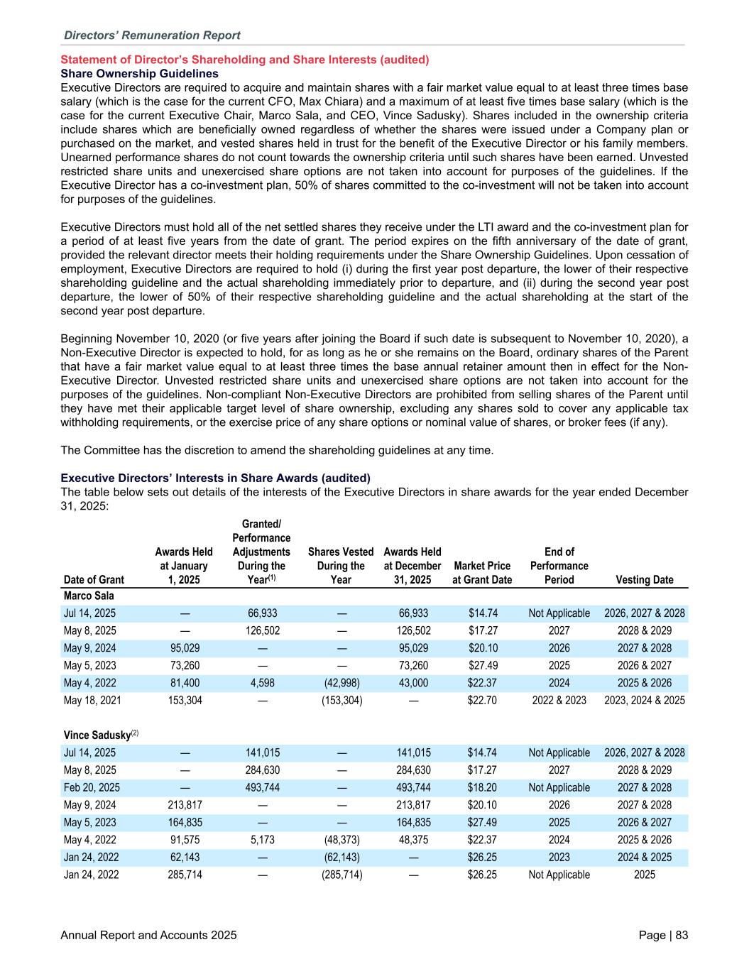 Statement of Director’s Shareholding and Share Interests (audited) Share Ownership Guidelines Executive Directors are required to acquire and maintain shares with a fair market value equal to at least three times base salary (which is the case for the current CFO, Max Chiara) and a maximum of at least five times base salary (which is the case for the current Executive Chair, Marco Sala, and CEO, Vince Sadusky). Shares included in the ownership criteria include shares which are beneficially owned regardless of whether the shares were issued under a Company plan or purchased on the market, and vested shares held in trust for the benefit of the Executive Director or his family members. Unearned performance shares do not count towards the ownership criteria until such shares have been earned. Unvested restricted share units and unexercised share options are not taken into account for purposes of the guidelines. If the Executive Director has a co-investment plan, 50% of shares committed to the co-investment will not be taken into account for purposes of the guidelines. Executive Directors must hold all of the net settled shares they receive under the LTI award and the co-investment plan for a period of at least five years from the date of grant. The period expires on the fifth anniversary of the date of grant, provided the relevant director meets their holding requirements under the Share Ownership Guidelines. Upon cessation of employment, Executive Directors are required to hold (i) during the first year post departure, the lower of their respective shareholding guideline and the actual shareholding immediately prior to departure, and (ii) during the second year post departure, the lower of 50% of their respective shareholding guideline and the actual shareholding at the start of the second year post departure. Beginning November 10, 2020 (or five years after joining the Board if such date is subsequent to November 10, 2020), a Non-Executive Director is expected to hold, for as long as he or she remains on the Board, ordinary shares of the Parent that have a fair market value equal to at least three times the base annual retainer amount then in effect for the Non- Executive Director. Unvested restricted share units and unexercised share options are not taken into account for the purposes of the guidelines. Non-compliant Non-Executive Directors are prohibited from selling shares of the Parent until they have met their applicable target level of share ownership, excluding any shares sold to cover any applicable tax withholding requirements, or the exercise price of any share options or nominal value of shares, or broker fees (if any). The Committee has the discretion to amend the shareholding guidelines at any time. Executive Directors’ Interests in Share Awards (audited) The table below sets out details of the interests of the Executive Directors in share awards for the year ended December 31, 2025: Marco Sala Jul 14, 2025 — 66,933 — 66,933 $14.74 Not Applicable 2026, 2027 & 2028 May 8, 2025 — 126,502 — 126,502 $17.27 2027 2028 & 2029 May 9, 2024 95,029 — — 95,029 $20.10 2026 2027 & 2028 May 5, 2023 73,260 — — 73,260 $27.49 2025 2026 & 2027 May 4, 2022 81,400 4,598 (42,998) 43,000 $22.37 2024 2025 & 2026 May 18, 2021 153,304 — (153,304) — $22.70 2022 & 2023 2023, 2024 & 2025 Vince Sadusky(2) Jul 14, 2025 — 141,015 — 141,015 $14.74 Not Applicable 2026, 2027 & 2028 May 8, 2025 — 284,630 — 284,630 $17.27 2027 2028 & 2029 Feb 20, 2025 — 493,744 — 493,744 $18.20 Not Applicable 2027 & 2028 May 9, 2024 213,817 — — 213,817 $20.10 2026 2027 & 2028 May 5, 2023 164,835 — — 164,835 $27.49 2025 2026 & 2027 May 4, 2022 91,575 5,173 (48,373) 48,375 $22.37 2024 2025 & 2026 Jan 24, 2022 62,143 — (62,143) — $26.25 2023 2024 & 2025 Jan 24, 2022 285,714 — (285,714) — $26.25 Not Applicable 2025 Date of Grant Awards Held at January 1, 2025 Granted/ Performance Adjustments During the Year(1) Shares Vested During the Year Awards Held at December 31, 2025 Market Price at Grant Date End of Performance Period Vesting Date Directors’ Remuneration Report Annual Report and Accounts 2025 Page | 83