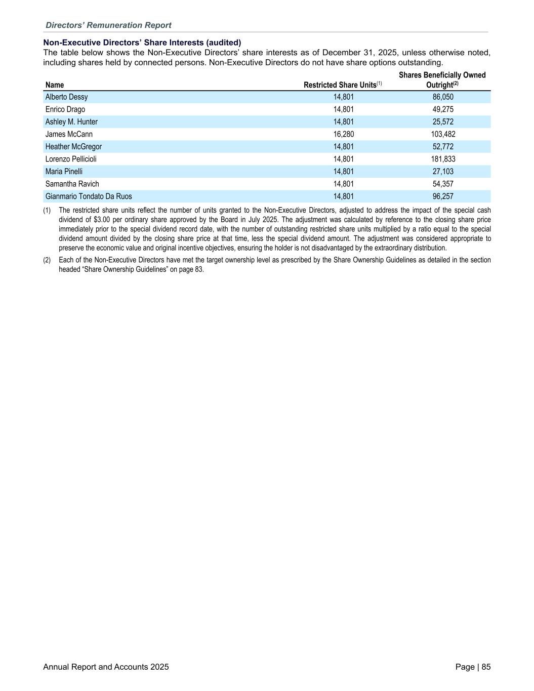 Non-Executive Directors’ Share Interests (audited) The table below shows the Non-Executive Directors’ share interests as of December 31, 2025, unless otherwise noted, including shares held by connected persons. Non-Executive Directors do not have share options outstanding. Alberto Dessy 14,801 86,050 Enrico Drago 14,801 49,275 Ashley M. Hunter 14,801 25,572 James McCann 16,280 103,482 Heather McGregor 14,801 52,772 Lorenzo Pellicioli 14,801 181,833 Maria Pinelli 14,801 27,103 Samantha Ravich 14,801 54,357 Gianmario Tondato Da Ruos 14,801 96,257 Name Restricted Share Units(1) Shares Beneficially Owned Outright(2) (1) The restricted share units reflect the number of units granted to the Non-Executive Directors, adjusted to address the impact of the special cash dividend of $3.00 per ordinary share approved by the Board in July 2025. The adjustment was calculated by reference to the closing share price immediately prior to the special dividend record date, with the number of outstanding restricted share units multiplied by a ratio equal to the special dividend amount divided by the closing share price at that time, less the special dividend amount. The adjustment was considered appropriate to preserve the economic value and original incentive objectives, ensuring the holder is not disadvantaged by the extraordinary distribution. (2) Each of the Non-Executive Directors have met the target ownership level as prescribed by the Share Ownership Guidelines as detailed in the section headed “Share Ownership Guidelines” on page 83. Directors’ Remuneration Report Annual Report and Accounts 2025 Page | 85