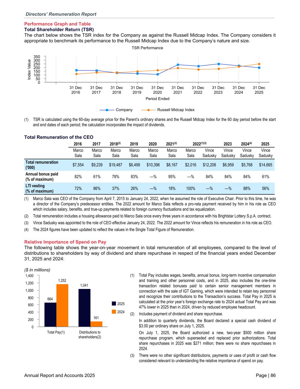 Performance Graph and Table Total Shareholder Return (TSR) The chart below shows the TSR index for the Company as against the Russell Midcap Index. The Company considers it appropriate to benchmark its performance to the Russell Midcap Index due to the Company’s nature and size. Period Ended In de x Va lu e TSR Performance Company Russell Midcap Index 31 Dec 2016 31 Dec 2017 31 Dec 2018 31 Dec 2019 31 Dec 2020 31 Dec 2021 31 Dec 2022 31 Dec 2023 31 Dec 2024 31 Dec 2025 0 50 100 150 200 250 300 350 (1) TSR is calculated using the 60-day average price for the Parent’s ordinary shares and the Russell Midcap Index for the 60 day period before the start and end dates of each period; the calculation incorporates the impact of dividends. Total Remuneration of the CEO 2016 2017 2018(2) 2019 2020 2021(2) 2022(1)(3) 2023 2024(4) 2025 Marco Sala Marco Sala Marco Sala Marco Sala Marco Sala Marco Sala Marco Sala Vince Sadusky Vince Sadusky Vince Sadusky Vince Sadusky Total remuneration ('000) $7,554 $9,239 $19,487 $6,499 $10,396 $8,167 $2,016 $12,208 $6,959 $5,768 $14,665 Annual bonus paid (% of maximum) 82% 61% 78% 83% —% 95% —% 84% 84% 84% 61% LTI vesting (% of maximum) 72% 86% 37% 26% —% 18% 100% —% —% 88% 56% (1) Marco Sala was CEO of the Company from April 7, 2015 to January 24, 2022, when he assumed the role of Executive Chair. Prior to this time, he was a director of the Company’s predecessor entities. The 2022 amount for Marco Sala reflects a pro-rata payment received by him in his role as CEO which includes salary, benefits, and true-up payments related to foreign currency fluctuations and tax equalization. (2) Total remuneration includes a housing allowance paid to Marco Sala once every three years in accordance with his Brightstar Lottery S.p.A. contract. (3) Vince Sadusky was appointed to the role of CEO effective January 24, 2022. The 2022 amount for Vince reflects his remuneration in his role as CEO. (4) The 2024 figures have been updated to reflect the values in the Single Total Figure of Remuneration. Relative Importance of Spend on Pay The following table shows the year-on-year movement in total remuneration of all employees, compared to the level of distributions to shareholders by way of dividend and share repurchase in respect of the financial years ended December 31, 2025 and 2024: ($ in millions) 664 1,041 1,252 161 2025 2024 Total Pay(1) Distributions to shareholders(2) 0 200 400 600 800 1,000 1,200 1,400 (1) Total Pay includes wages, benefits, annual bonus, long-term incentive compensation and training and other personnel costs, and in 2025, also includes the one-time transaction related bonuses paid to certain senior management members in connection with the sale of IGT Gaming, which were intended to retain key personnel and recognize their contributions to the Transaction’s success. Total Pay in 2025 is calculated at the prior year’s foreign exchange rate to 2024 actual Total Pay and was 47% lower in 2025 than in 2024, driven by reduced employee headcount. (2) Includes payment of dividend and share repurchase. In addition to quarterly dividends, the Board declared a special cash dividend of $3.00 per ordinary share on July 1, 2025. On July 1, 2025, the Board authorized a new, two-year $500 million share repurchase program, which superseded and replaced prior authorizations. Total share repurchases in 2025 was $271 million; there were no share repurchases in 2024. (3) There were no other significant distributions, payments or uses of profit or cash flow considered relevant to understanding the relative importance of spend on pay. Directors’ Remuneration Report Annual Report and Accounts 2025 Page | 86