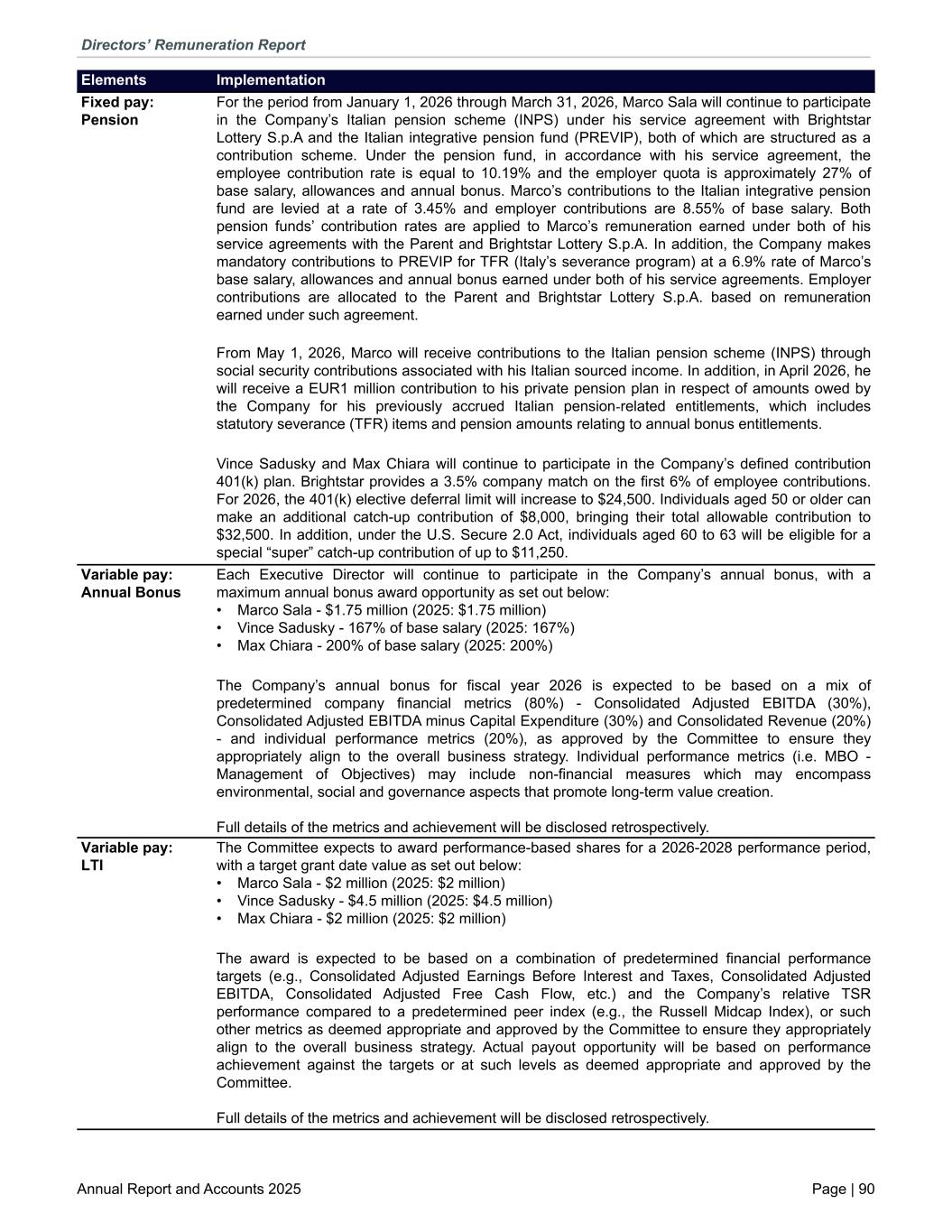 Fixed pay: Pension For the period from January 1, 2026 through March 31, 2026, Marco Sala will continue to participate in the Company’s Italian pension scheme (INPS) under his service agreement with Brightstar Lottery S.p.A and the Italian integrative pension fund (PREVIP), both of which are structured as a contribution scheme. Under the pension fund, in accordance with his service agreement, the employee contribution rate is equal to 10.19% and the employer quota is approximately 27% of base salary, allowances and annual bonus. Marco’s contributions to the Italian integrative pension fund are levied at a rate of 3.45% and employer contributions are 8.55% of base salary. Both pension funds’ contribution rates are applied to Marco’s remuneration earned under both of his service agreements with the Parent and Brightstar Lottery S.p.A. In addition, the Company makes mandatory contributions to PREVIP for TFR (Italy’s severance program) at a 6.9% rate of Marco’s base salary, allowances and annual bonus earned under both of his service agreements. Employer contributions are allocated to the Parent and Brightstar Lottery S.p.A. based on remuneration earned under such agreement. From May 1, 2026, Marco will receive contributions to the Italian pension scheme (INPS) through social security contributions associated with his Italian sourced income. In addition, in April 2026, he will receive a EUR1 million contribution to his private pension plan in respect of amounts owed by the Company for his previously accrued Italian pension-related entitlements, which includes statutory severance (TFR) items and pension amounts relating to annual bonus entitlements. Vince Sadusky and Max Chiara will continue to participate in the Company’s defined contribution 401(k) plan. Brightstar provides a 3.5% company match on the first 6% of employee contributions. For 2026, the 401(k) elective deferral limit will increase to $24,500. Individuals aged 50 or older can make an additional catch-up contribution of $8,000, bringing their total allowable contribution to $32,500. In addition, under the U.S. Secure 2.0 Act, individuals aged 60 to 63 will be eligible for a special “super” catch-up contribution of up to $11,250. Variable pay: Annual Bonus Each Executive Director will continue to participate in the Company’s annual bonus, with a maximum annual bonus award opportunity as set out below: • Marco Sala - $1.75 million (2025: $1.75 million) • Vince Sadusky - 167% of base salary (2025: 167%) • Max Chiara - 200% of base salary (2025: 200%) The Company’s annual bonus for fiscal year 2026 is expected to be based on a mix of predetermined company financial metrics (80%) - Consolidated Adjusted EBITDA (30%), Consolidated Adjusted EBITDA minus Capital Expenditure (30%) and Consolidated Revenue (20%) - and individual performance metrics (20%), as approved by the Committee to ensure they appropriately align to the overall business strategy. Individual performance metrics (i.e. MBO - Management of Objectives) may include non-financial measures which may encompass environmental, social and governance aspects that promote long-term value creation. Full details of the metrics and achievement will be disclosed retrospectively. Variable pay: LTI The Committee expects to award performance-based shares for a 2026-2028 performance period, with a target grant date value as set out below: • Marco Sala - $2 million (2025: $2 million) • Vince Sadusky - $4.5 million (2025: $4.5 million) • Max Chiara - $2 million (2025: $2 million) The award is expected to be based on a combination of predetermined financial performance targets (e.g., Consolidated Adjusted Earnings Before Interest and Taxes, Consolidated Adjusted EBITDA, Consolidated Adjusted Free Cash Flow, etc.) and the Company’s relative TSR performance compared to a predetermined peer index (e.g., the Russell Midcap Index), or such other metrics as deemed appropriate and approved by the Committee to ensure they appropriately align to the overall business strategy. Actual payout opportunity will be based on performance achievement against the targets or at such levels as deemed appropriate and approved by the Committee. Full details of the metrics and achievement will be disclosed retrospectively. Elements Implementation Directors’ Remuneration Report Annual Report and Accounts 2025 Page | 90