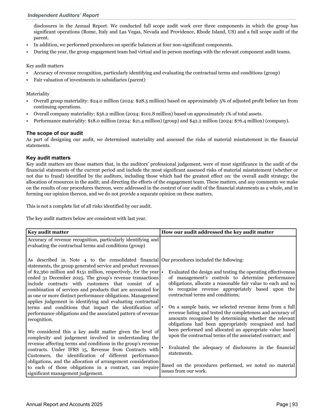 disclosures in the Annual Report. We conducted full scope audit work over three components in which the group has significant operations (Rome, Italy and Las Vegas, Nevada and Providence, Rhode Island, US) and a full scope audit of the parent. • In addition, we performed procedures on specific balances at four non-significant components. • During the year, the group engagement team had virtual and in person meetings with the relevant component audit teams. Key audit matters • Accuracy of revenue recognition, particularly identifying and evaluating the contractual terms and conditions (group) • Fair valuation of investments in subsidiaries (parent) Materiality • Overall group materiality: $24.0 million (2024: $28.5 million) based on approximately 5% of adjusted profit before tax from continuing operations. • Overall company materiality: $56.2 million (2024: $101.8 million) based on approximately 1% of total assets. • Performance materiality: $18.0 million (2024: $21.4 million) (group) and $42.2 million (2024: $76.4 million) (company). The scope of our audit As part of designing our audit, we determined materiality and assessed the risks of material misstatement in the financial statements. Key audit matters Key audit matters are those matters that, in the auditors’ professional judgement, were of most significance in the audit of the financial statements of the current period and include the most significant assessed risks of material misstatement (whether or not due to fraud) identified by the auditors, including those which had the greatest effect on: the overall audit strategy; the allocation of resources in the audit; and directing the efforts of the engagement team. These matters, and any comments we make on the results of our procedures thereon, were addressed in the context of our audit of the financial statements as a whole, and in forming our opinion thereon, and we do not provide a separate opinion on these matters. This is not a complete list of all risks identified by our audit. The key audit matters below are consistent with last year. Accuracy of revenue recognition, particularly identifying and evaluating the contractual terms and conditions (group) As described in Note 4 to the consolidated financial statements, the group generated service and product revenues of $2,360 million and $151 million, respectively, for the year ended 31 December 2025. The group’s revenue transactions include contracts with customers that consist of a combination of services and products that are accounted for as one or more distinct performance obligations. Management applies judgement in identifying and evaluating contractual terms and conditions that impact the identification of performance obligations and the associated pattern of revenue recognition. We considered this a key audit matter given the level of complexity and judgement involved in understanding the revenue affecting terms and conditions in the group’s revenue contracts. Under IFRS 15, Revenue from Contracts with Customers, the identification of different performance obligations, and the allocation of arrangement consideration to each of those obligations in a contract, can require significant management judgement. Our procedures included the following: • Evaluated the design and testing the operating effectiveness of management’s controls to determine performance obligations, allocate a reasonable fair value to each and so to recognise revenue appropriately based upon the contractual terms and conditions; • On a sample basis, we selected revenue items from a full revenue listing and tested the completeness and accuracy of amounts recognised by determining whether the relevant obligations had been appropriately recognised and had been performed and allocated an appropriate value based upon the contractual terms of the associated contract; and • Evaluated the adequacy of disclosures in the financial statements. Based on the procedures performed, we noted no material issues from our work. Key audit matter How our audit addressed the key audit matter Independent Auditors’ Report Annual Report and Accounts 2025 Page | 93