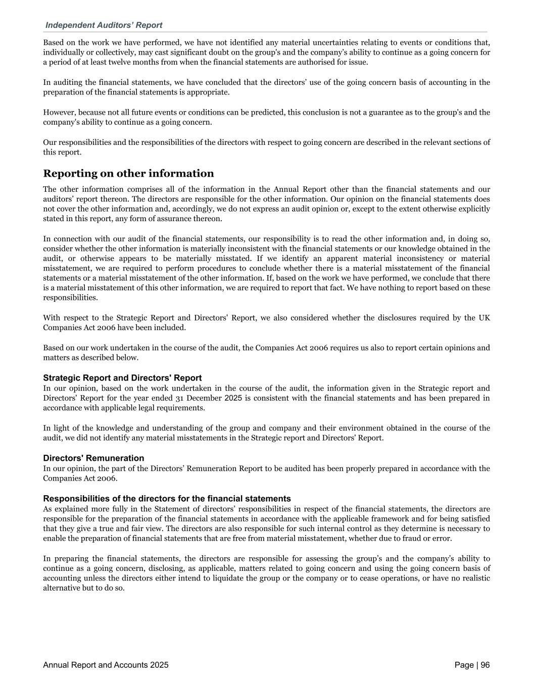 Based on the work we have performed, we have not identified any material uncertainties relating to events or conditions that, individually or collectively, may cast significant doubt on the group's and the company’s ability to continue as a going concern for a period of at least twelve months from when the financial statements are authorised for issue. In auditing the financial statements, we have concluded that the directors’ use of the going concern basis of accounting in the preparation of the financial statements is appropriate. However, because not all future events or conditions can be predicted, this conclusion is not a guarantee as to the group's and the company's ability to continue as a going concern. Our responsibilities and the responsibilities of the directors with respect to going concern are described in the relevant sections of this report. Reporting on other information The other information comprises all of the information in the Annual Report other than the financial statements and our auditors’ report thereon. The directors are responsible for the other information. Our opinion on the financial statements does not cover the other information and, accordingly, we do not express an audit opinion or, except to the extent otherwise explicitly stated in this report, any form of assurance thereon. In connection with our audit of the financial statements, our responsibility is to read the other information and, in doing so, consider whether the other information is materially inconsistent with the financial statements or our knowledge obtained in the audit, or otherwise appears to be materially misstated. If we identify an apparent material inconsistency or material misstatement, we are required to perform procedures to conclude whether there is a material misstatement of the financial statements or a material misstatement of the other information. If, based on the work we have performed, we conclude that there is a material misstatement of this other information, we are required to report that fact. We have nothing to report based on these responsibilities. With respect to the Strategic Report and Directors' Report, we also considered whether the disclosures required by the UK Companies Act 2006 have been included. Based on our work undertaken in the course of the audit, the Companies Act 2006 requires us also to report certain opinions and matters as described below. Strategic Report and Directors' Report In our opinion, based on the work undertaken in the course of the audit, the information given in the Strategic report and Directors' Report for the year ended 31 December 2025 is consistent with the financial statements and has been prepared in accordance with applicable legal requirements. In light of the knowledge and understanding of the group and company and their environment obtained in the course of the audit, we did not identify any material misstatements in the Strategic report and Directors' Report. Directors' Remuneration In our opinion, the part of the Directors’ Remuneration Report to be audited has been properly prepared in accordance with the Companies Act 2006. Responsibilities of the directors for the financial statements As explained more fully in the Statement of directors’ responsibilities in respect of the financial statements, the directors are responsible for the preparation of the financial statements in accordance with the applicable framework and for being satisfied that they give a true and fair view. The directors are also responsible for such internal control as they determine is necessary to enable the preparation of financial statements that are free from material misstatement, whether due to fraud or error. In preparing the financial statements, the directors are responsible for assessing the group’s and the company’s ability to continue as a going concern, disclosing, as applicable, matters related to going concern and using the going concern basis of accounting unless the directors either intend to liquidate the group or the company or to cease operations, or have no realistic alternative but to do so. Independent Auditors’ Report Annual Report and Accounts 2025 Page | 96