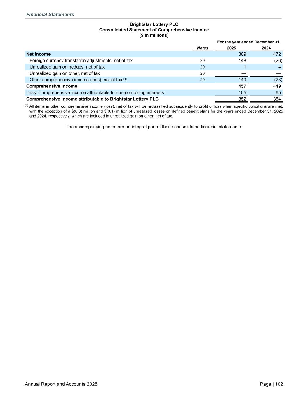 Brightstar Lottery PLC Consolidated Statement of Comprehensive Income ($ in millions) For the year ended December 31, Notes 2025 2024 Net income 309 472 Foreign currency translation adjustments, net of tax 20 148 (26) Unrealized gain on hedges, net of tax 20 1 4 Unrealized gain on other, net of tax 20 — — Other comprehensive income (loss), net of tax (1) 20 149 (23) Comprehensive income 457 449 Less: Comprehensive income attributable to non-controlling interests 105 65 Comprehensive income attributable to Brightstar Lottery PLC 352 384 (1) All items in other comprehensive income (loss), net of tax will be reclassified subsequently to profit or loss when specific conditions are met, with the exception of a $(0.3) million and $(0.1) million of unrealized losses on defined benefit plans for the years ended December 31, 2025 and 2024, respectively, which are included in unrealized gain on other, net of tax. The accompanying notes are an integral part of these consolidated financial statements. Financial Statements Annual Report and Accounts 2025 Page | 102