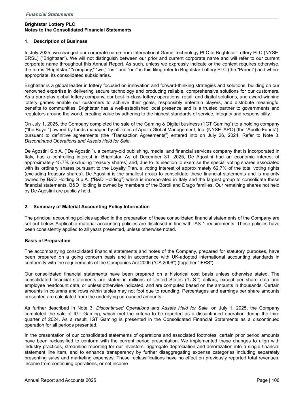 Brightstar Lottery PLC Notes to the Consolidated Financial Statements 1. Description of Business In July 2025, we changed our corporate name from International Game Technology PLC to Brightstar Lottery PLC (NYSE: BRSL) (“Brightstar”). We will not distinguish between our prior and current corporate name and will refer to our current corporate name throughout this Annual Report. As such, unless we expressly indicate or the context requires otherwise, the terms “Brightstar,” “company,” “we,” “us,” and “our” in this filing refer to Brightstar Lottery PLC (the “Parent”) and where appropriate, its consolidated subsidiaries. Brightstar is a global leader in lottery focused on innovation and forward-thinking strategies and solutions, building on our renowned expertise in delivering secure technology and producing reliable, comprehensive solutions for our customers. As a pure-play global lottery company, our best-in-class lottery operations, retail, and digital solutions, and award-winning lottery games enable our customers to achieve their goals, responsibly entertain players, and distribute meaningful benefits to communities. Brightstar has a well-established local presence and is a trusted partner to governments and regulators around the world, creating value by adhering to the highest standards of service, integrity and responsibility. On July 1, 2025, the Company completed the sale of the Gaming & Digital business (“IGT Gaming”) to a holding company (“the Buyer”) owned by funds managed by affiliates of Apollo Global Management, Inc. (NYSE: APO) (the “Apollo Funds”), pursuant to definitive agreements (the “Transaction Agreements”) entered into on July 26, 2024. Refer to Note 3. Discontinued Operations and Assets Held for Sale. De Agostini S.p.A. (“De Agostini”), a century-old publishing, media, and financial services company that is incorporated in Italy, has a controlling interest in Brightstar. As of December 31, 2025, De Agostini had an economic interest of approximately 45.7% (excluding treasury shares) and, due to its election to exercise the special voting shares associated with its ordinary shares pursuant to the Loyalty Plan, a voting interest of approximately 62.7% of the total voting rights (excluding treasury shares). De Agostini is the smallest group to consolidate these financial statements and is majority owned by B&D Holding S.p.A. (“B&D Holding”) which is incorporated in Italy and the largest group to consolidate these financial statements. B&D Holding is owned by members of the Boroli and Drago families. Our remaining shares not held by De Agostini are publicly held. 2. Summary of Material Accounting Policy Information The principal accounting policies applied in the preparation of these consolidated financial statements of the Company are set out below. Applicable material accounting policies are disclosed in line with IAS 1 requirements. These policies have been consistently applied to all years presented, unless otherwise noted. Basis of Preparation The accompanying consolidated financial statements and notes of the Company, prepared for statutory purposes, have been prepared on a going concern basis and in accordance with UK-adopted international accounting standards in conformity with the requirements of the Companies Act 2006 (“CA 2006”) (together “IFRS”). Our consolidated financial statements have been prepared on a historical cost basis unless otherwise stated. The consolidated financial statements are stated in millions of United States (“U.S.”) dollars, except per share data and employee headcount data, or unless otherwise indicated, and are computed based on the amounts in thousands. Certain amounts in columns and rows within tables may not foot due to rounding. Percentages and earnings per share amounts presented are calculated from the underlying unrounded amounts. As further described in Note 3. Discontinued Operations and Assets Held for Sale, on July 1, 2025, the Company completed the sale of IGT Gaming, which met the criteria to be reported as a discontinued operation during the third quarter of 2024. As a result, IGT Gaming is presented in the Consolidated Financial Statements as a discontinued operation for all periods presented. In the presentation of our consolidated statements of operations and associated footnotes, certain prior period amounts have been reclassified to conform with the current period presentation. We implemented these changes to align with industry practices, streamline reporting for our investors, aggregate depreciation and amortization into a single financial statement line item, and to enhance transparency by further disaggregating expense categories including separately presenting sales and marketing expenses. These reclassifications have no effect on previously reported total revenues, income from continuing operations, or net income Financial Statements Annual Report and Accounts 2025 Page | 106