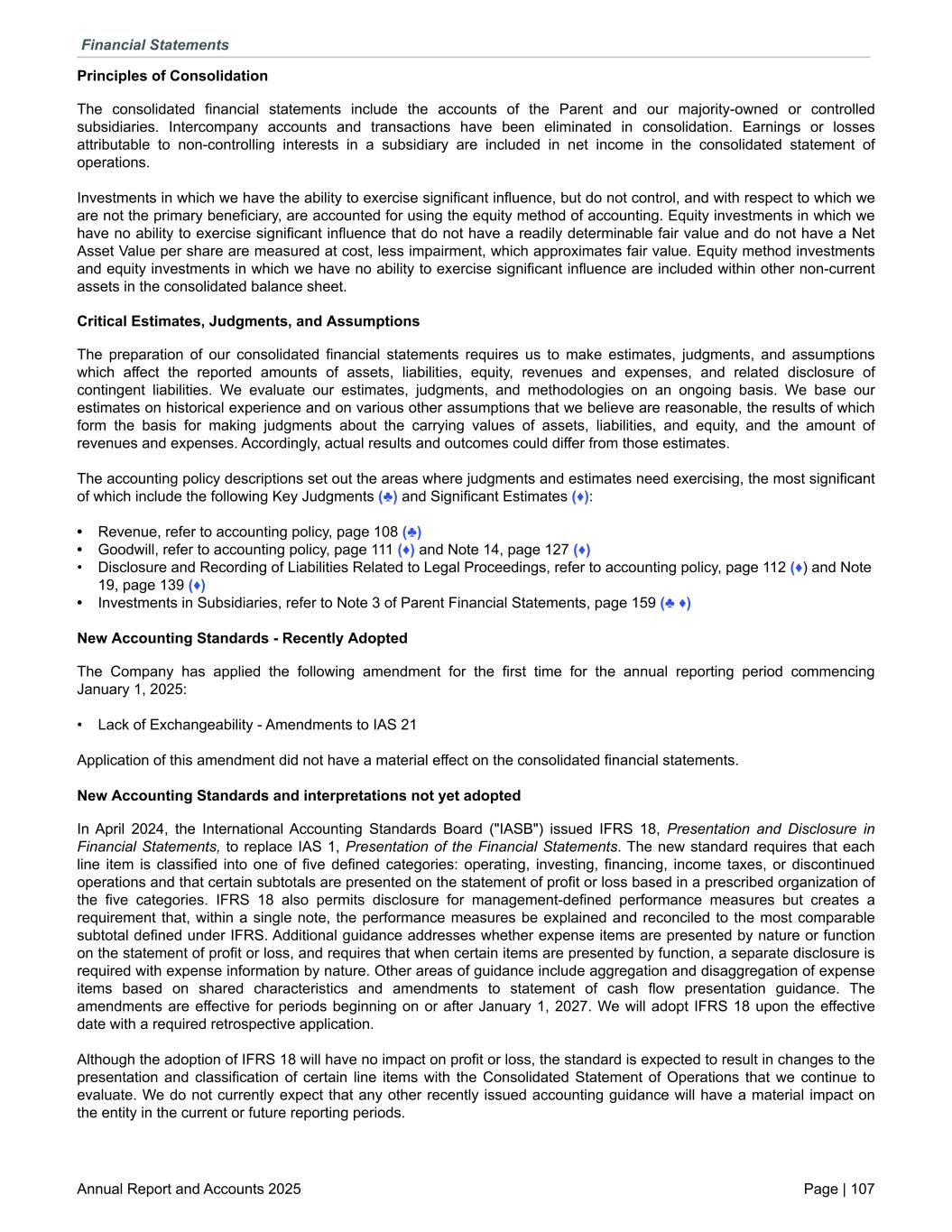 Principles of Consolidation The consolidated financial statements include the accounts of the Parent and our majority-owned or controlled subsidiaries. Intercompany accounts and transactions have been eliminated in consolidation. Earnings or losses attributable to non-controlling interests in a subsidiary are included in net income in the consolidated statement of operations. Investments in which we have the ability to exercise significant influence, but do not control, and with respect to which we are not the primary beneficiary, are accounted for using the equity method of accounting. Equity investments in which we have no ability to exercise significant influence that do not have a readily determinable fair value and do not have a Net Asset Value per share are measured at cost, less impairment, which approximates fair value. Equity method investments and equity investments in which we have no ability to exercise significant influence are included within other non-current assets in the consolidated balance sheet. Critical Estimates, Judgments, and Assumptions The preparation of our consolidated financial statements requires us to make estimates, judgments, and assumptions which affect the reported amounts of assets, liabilities, equity, revenues and expenses, and related disclosure of contingent liabilities. We evaluate our estimates, judgments, and methodologies on an ongoing basis. We base our estimates on historical experience and on various other assumptions that we believe are reasonable, the results of which form the basis for making judgments about the carrying values of assets, liabilities, and equity, and the amount of revenues and expenses. Accordingly, actual results and outcomes could differ from those estimates. The accounting policy descriptions set out the areas where judgments and estimates need exercising, the most significant of which include the following Key Judgments (♣) and Significant Estimates (♦): • Revenue, refer to accounting policy, page 108 (♣) • Goodwill, refer to accounting policy, page 111 (♦) and Note 14, page 127 (♦) • Disclosure and Recording of Liabilities Related to Legal Proceedings, refer to accounting policy, page 112 (♦) and Note 19, page 139 (♦) • Investments in Subsidiaries, refer to Note 3 of Parent Financial Statements, page 159 (♣ ♦) New Accounting Standards - Recently Adopted The Company has applied the following amendment for the first time for the annual reporting period commencing January 1, 2025: • Lack of Exchangeability - Amendments to IAS 21 Application of this amendment did not have a material effect on the consolidated financial statements. New Accounting Standards and interpretations not yet adopted In April 2024, the International Accounting Standards Board ("IASB") issued IFRS 18, Presentation and Disclosure in Financial Statements, to replace IAS 1, Presentation of the Financial Statements. The new standard requires that each line item is classified into one of five defined categories: operating, investing, financing, income taxes, or discontinued operations and that certain subtotals are presented on the statement of profit or loss based in a prescribed organization of the five categories. IFRS 18 also permits disclosure for management-defined performance measures but creates a requirement that, within a single note, the performance measures be explained and reconciled to the most comparable subtotal defined under IFRS. Additional guidance addresses whether expense items are presented by nature or function on the statement of profit or loss, and requires that when certain items are presented by function, a separate disclosure is required with expense information by nature. Other areas of guidance include aggregation and disaggregation of expense items based on shared characteristics and amendments to statement of cash flow presentation guidance. The amendments are effective for periods beginning on or after January 1, 2027. We will adopt IFRS 18 upon the effective date with a required retrospective application. Although the adoption of IFRS 18 will have no impact on profit or loss, the standard is expected to result in changes to the presentation and classification of certain line items with the Consolidated Statement of Operations that we continue to evaluate. We do not currently expect that any other recently issued accounting guidance will have a material impact on the entity in the current or future reporting periods. Financial Statements Annual Report and Accounts 2025 Page | 107