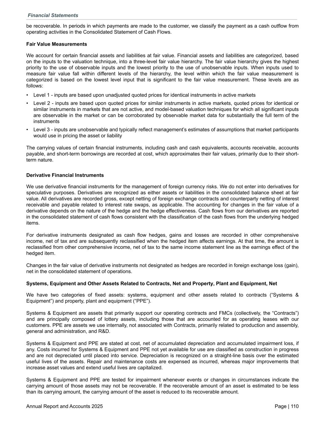 be recoverable. In periods in which payments are made to the customer, we classify the payment as a cash outflow from operating activities in the Consolidated Statement of Cash Flows. Fair Value Measurements We account for certain financial assets and liabilities at fair value. Financial assets and liabilities are categorized, based on the inputs to the valuation technique, into a three-level fair value hierarchy. The fair value hierarchy gives the highest priority to the use of observable inputs and the lowest priority to the use of unobservable inputs. When inputs used to measure fair value fall within different levels of the hierarchy, the level within which the fair value measurement is categorized is based on the lowest level input that is significant to the fair value measurement. These levels are as follows: • Level 1 - inputs are based upon unadjusted quoted prices for identical instruments in active markets • Level 2 - inputs are based upon quoted prices for similar instruments in active markets, quoted prices for identical or similar instruments in markets that are not active, and model-based valuation techniques for which all significant inputs are observable in the market or can be corroborated by observable market data for substantially the full term of the instruments • Level 3 - inputs are unobservable and typically reflect management’s estimates of assumptions that market participants would use in pricing the asset or liability The carrying values of certain financial instruments, including cash and cash equivalents, accounts receivable, accounts payable, and short-term borrowings are recorded at cost, which approximates their fair values, primarily due to their short- term nature. Derivative Financial Instruments We use derivative financial instruments for the management of foreign currency risks. We do not enter into derivatives for speculative purposes. Derivatives are recognized as either assets or liabilities in the consolidated balance sheet at fair value. All derivatives are recorded gross, except netting of foreign exchange contracts and counterparty netting of interest receivable and payable related to interest rate swaps, as applicable. The accounting for changes in the fair value of a derivative depends on the nature of the hedge and the hedge effectiveness. Cash flows from our derivatives are reported in the consolidated statement of cash flows consistent with the classification of the cash flows from the underlying hedged items. For derivative instruments designated as cash flow hedges, gains and losses are recorded in other comprehensive income, net of tax and are subsequently reclassified when the hedged item affects earnings. At that time, the amount is reclassified from other comprehensive income, net of tax to the same income statement line as the earnings effect of the hedged item. Changes in the fair value of derivative instruments not designated as hedges are recorded in foreign exchange loss (gain), net in the consolidated statement of operations. Systems, Equipment and Other Assets Related to Contracts, Net and Property, Plant and Equipment, Net We have two categories of fixed assets: systems, equipment and other assets related to contracts (“Systems & Equipment”) and property, plant and equipment (“PPE”). Systems & Equipment are assets that primarily support our operating contracts and FMCs (collectively, the “Contracts”) and are principally composed of lottery assets, including those that are accounted for as operating leases with our customers. PPE are assets we use internally, not associated with Contracts, primarily related to production and assembly, general and administration, and R&D. Systems & Equipment and PPE are stated at cost, net of accumulated depreciation and accumulated impairment loss, if any. Costs incurred for Systems & Equipment and PPE not yet available for use are classified as construction in progress and are not depreciated until placed into service. Depreciation is recognized on a straight-line basis over the estimated useful lives of the assets. Repair and maintenance costs are expensed as incurred, whereas major improvements that increase asset values and extend useful lives are capitalized. Systems & Equipment and PPE are tested for impairment whenever events or changes in circumstances indicate the carrying amount of those assets may not be recoverable. If the recoverable amount of an asset is estimated to be less than its carrying amount, the carrying amount of the asset is reduced to its recoverable amount. Financial Statements Annual Report and Accounts 2025 Page | 110