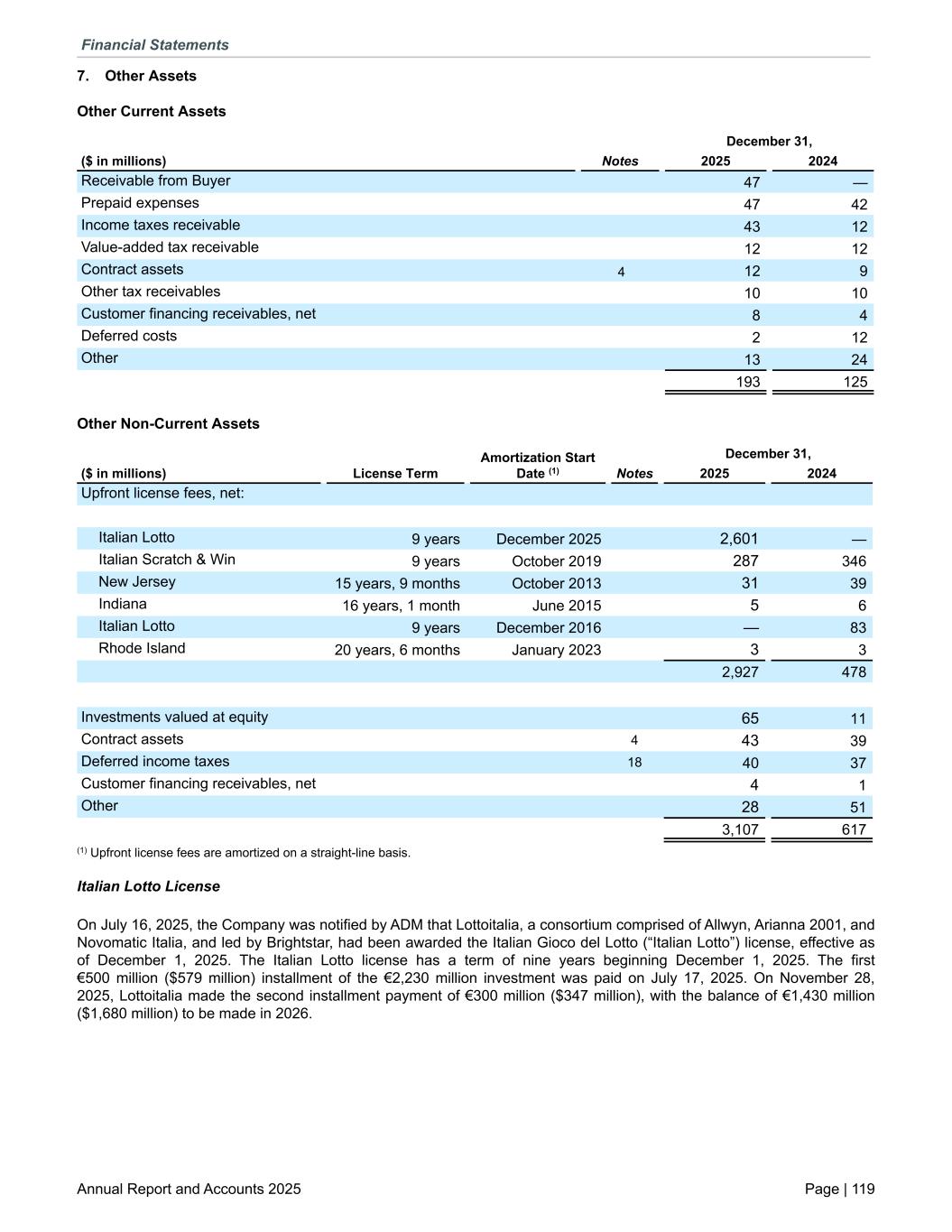 7. Other Assets Other Current Assets December 31, ($ in millions) Notes 2025 2024 Receivable from Buyer 47 — Prepaid expenses 47 42 Income taxes receivable 43 12 Value-added tax receivable 12 12 Contract assets 4 12 9 Other tax receivables 10 10 Customer financing receivables, net 8 4 Deferred costs 2 12 Other 13 24 193 125 Other Non-Current Assets Amortization Start Date (1) December 31, ($ in millions) License Term Notes 2025 2024 Upfront license fees, net: Italian Lotto 9 years December 2025 2,601 — Italian Scratch & Win 9 years October 2019 287 346 New Jersey 15 years, 9 months October 2013 31 39 Indiana 16 years, 1 month June 2015 5 6 Italian Lotto 9 years December 2016 — 83 Rhode Island 20 years, 6 months January 2023 3 3 2,927 478 Investments valued at equity 65 11 Contract assets 4 43 39 Deferred income taxes 18 40 37 Customer financing receivables, net 4 1 Other 28 51 3,107 617 (1) Upfront license fees are amortized on a straight-line basis. Italian Lotto License On July 16, 2025, the Company was notified by ADM that Lottoitalia, a consortium comprised of Allwyn, Arianna 2001, and Novomatic Italia, and led by Brightstar, had been awarded the Italian Gioco del Lotto (“Italian Lotto”) license, effective as of December 1, 2025. The Italian Lotto license has a term of nine years beginning December 1, 2025. The first €500 million ($579 million) installment of the €2,230 million investment was paid on July 17, 2025. On November 28, 2025, Lottoitalia made the second installment payment of €300 million ($347 million), with the balance of €1,430 million ($1,680 million) to be made in 2026. Financial Statements Annual Report and Accounts 2025 Page | 119