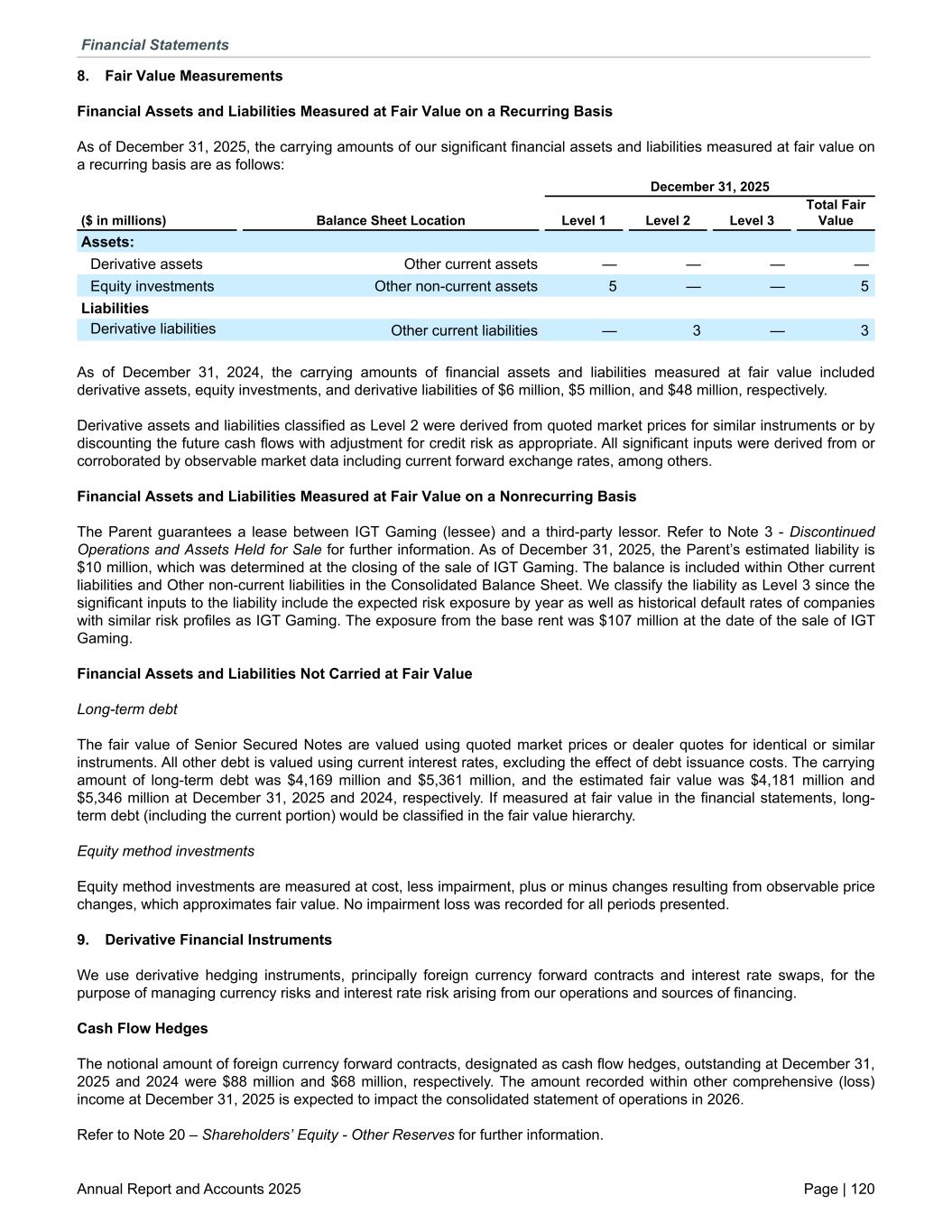 8. Fair Value Measurements Financial Assets and Liabilities Measured at Fair Value on a Recurring Basis As of December 31, 2025, the carrying amounts of our significant financial assets and liabilities measured at fair value on a recurring basis are as follows: December 31, 2025 ($ in millions) Balance Sheet Location Level 1 Level 2 Level 3 Total Fair Value Assets: Derivative assets Other current assets — — — — Equity investments Other non-current assets 5 — — 5 Liabilities Derivative liabilities Other current liabilities — 3 — 3 As of December 31, 2024, the carrying amounts of financial assets and liabilities measured at fair value included derivative assets, equity investments, and derivative liabilities of $6 million, $5 million, and $48 million, respectively. Derivative assets and liabilities classified as Level 2 were derived from quoted market prices for similar instruments or by discounting the future cash flows with adjustment for credit risk as appropriate. All significant inputs were derived from or corroborated by observable market data including current forward exchange rates, among others. Financial Assets and Liabilities Measured at Fair Value on a Nonrecurring Basis The Parent guarantees a lease between IGT Gaming (lessee) and a third-party lessor. Refer to Note 3 - Discontinued Operations and Assets Held for Sale for further information. As of December 31, 2025, the Parent’s estimated liability is $10 million, which was determined at the closing of the sale of IGT Gaming. The balance is included within Other current liabilities and Other non-current liabilities in the Consolidated Balance Sheet. We classify the liability as Level 3 since the significant inputs to the liability include the expected risk exposure by year as well as historical default rates of companies with similar risk profiles as IGT Gaming. The exposure from the base rent was $107 million at the date of the sale of IGT Gaming. Financial Assets and Liabilities Not Carried at Fair Value Long-term debt The fair value of Senior Secured Notes are valued using quoted market prices or dealer quotes for identical or similar instruments. All other debt is valued using current interest rates, excluding the effect of debt issuance costs. The carrying amount of long-term debt was $4,169 million and $5,361 million, and the estimated fair value was $4,181 million and $5,346 million at December 31, 2025 and 2024, respectively. If measured at fair value in the financial statements, long- term debt (including the current portion) would be classified in the fair value hierarchy. Equity method investments Equity method investments are measured at cost, less impairment, plus or minus changes resulting from observable price changes, which approximates fair value. No impairment loss was recorded for all periods presented. 9. Derivative Financial Instruments We use derivative hedging instruments, principally foreign currency forward contracts and interest rate swaps, for the purpose of managing currency risks and interest rate risk arising from our operations and sources of financing. Cash Flow Hedges The notional amount of foreign currency forward contracts, designated as cash flow hedges, outstanding at December 31, 2025 and 2024 were $88 million and $68 million, respectively. The amount recorded within other comprehensive (loss) income at December 31, 2025 is expected to impact the consolidated statement of operations in 2026. Refer to Note 20 – Shareholders’ Equity - Other Reserves for further information. Financial Statements Annual Report and Accounts 2025 Page | 120