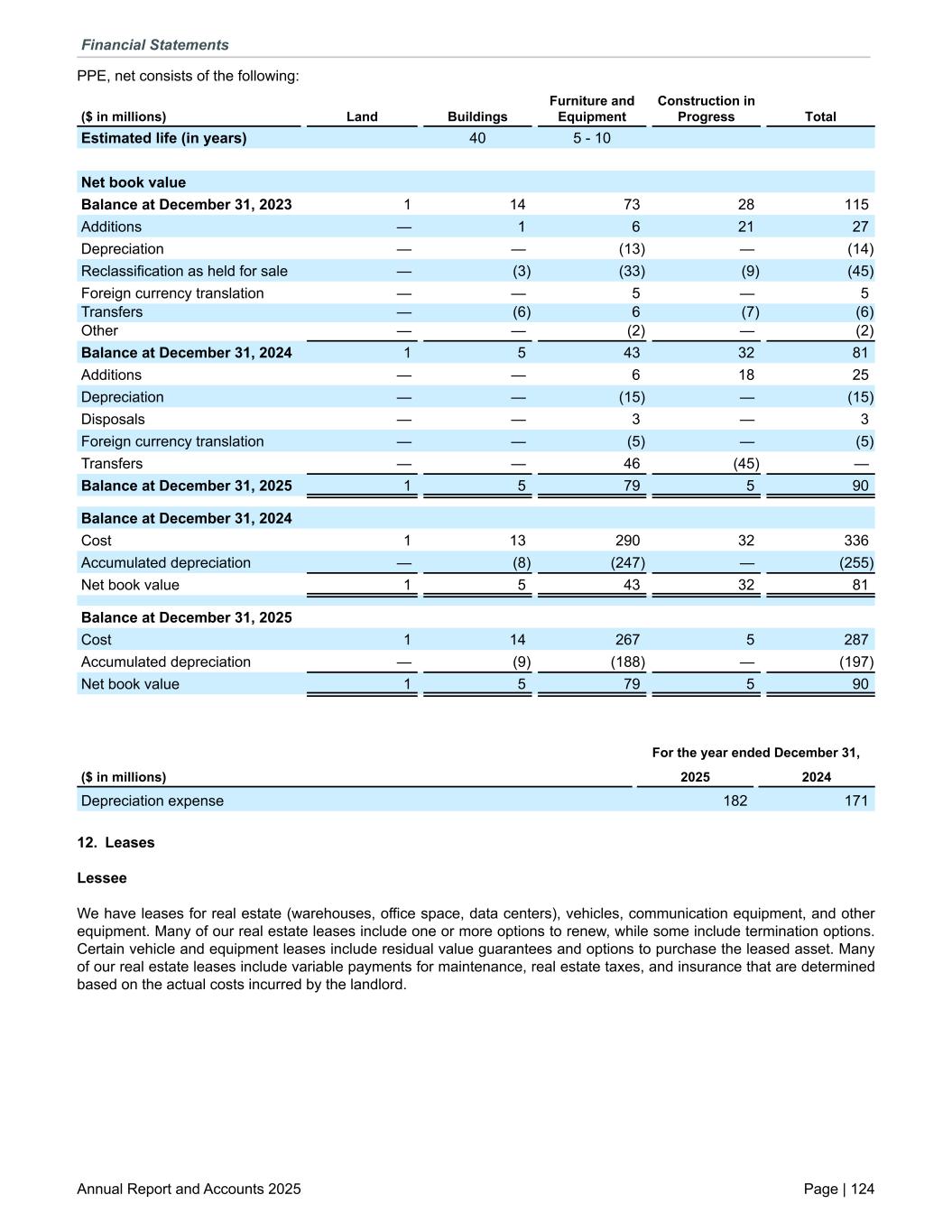 PPE, net consists of the following: ($ in millions) Land Buildings Furniture and Equipment Construction in Progress Total Estimated life (in years) 40 5 - 10 Net book value Balance at December 31, 2023 1 14 73 28 115 Additions — 1 6 21 27 Depreciation — — (13) — (14) Reclassification as held for sale — (3) (33) (9) (45) Foreign currency translation — — 5 — 5 Transfers — (6) 6 (7) (6) Other — — (2) — (2) Balance at December 31, 2024 1 5 43 32 81 Additions — — 6 18 25 Depreciation — — (15) — (15) Disposals — — 3 — 3 Foreign currency translation — — (5) — (5) Transfers — — 46 (45) — Balance at December 31, 2025 1 5 79 5 90 Balance at December 31, 2024 Cost 1 13 290 32 336 Accumulated depreciation — (8) (247) — (255) Net book value 1 5 43 32 81 Balance at December 31, 2025 Cost 1 14 267 5 287 Accumulated depreciation — (9) (188) — (197) Net book value 1 5 79 5 90 For the year ended December 31, ($ in millions) 2025 2024 Depreciation expense 182 171 12. Leases Lessee We have leases for real estate (warehouses, office space, data centers), vehicles, communication equipment, and other equipment. Many of our real estate leases include one or more options to renew, while some include termination options. Certain vehicle and equipment leases include residual value guarantees and options to purchase the leased asset. Many of our real estate leases include variable payments for maintenance, real estate taxes, and insurance that are determined based on the actual costs incurred by the landlord. Financial Statements Annual Report and Accounts 2025 Page | 124
