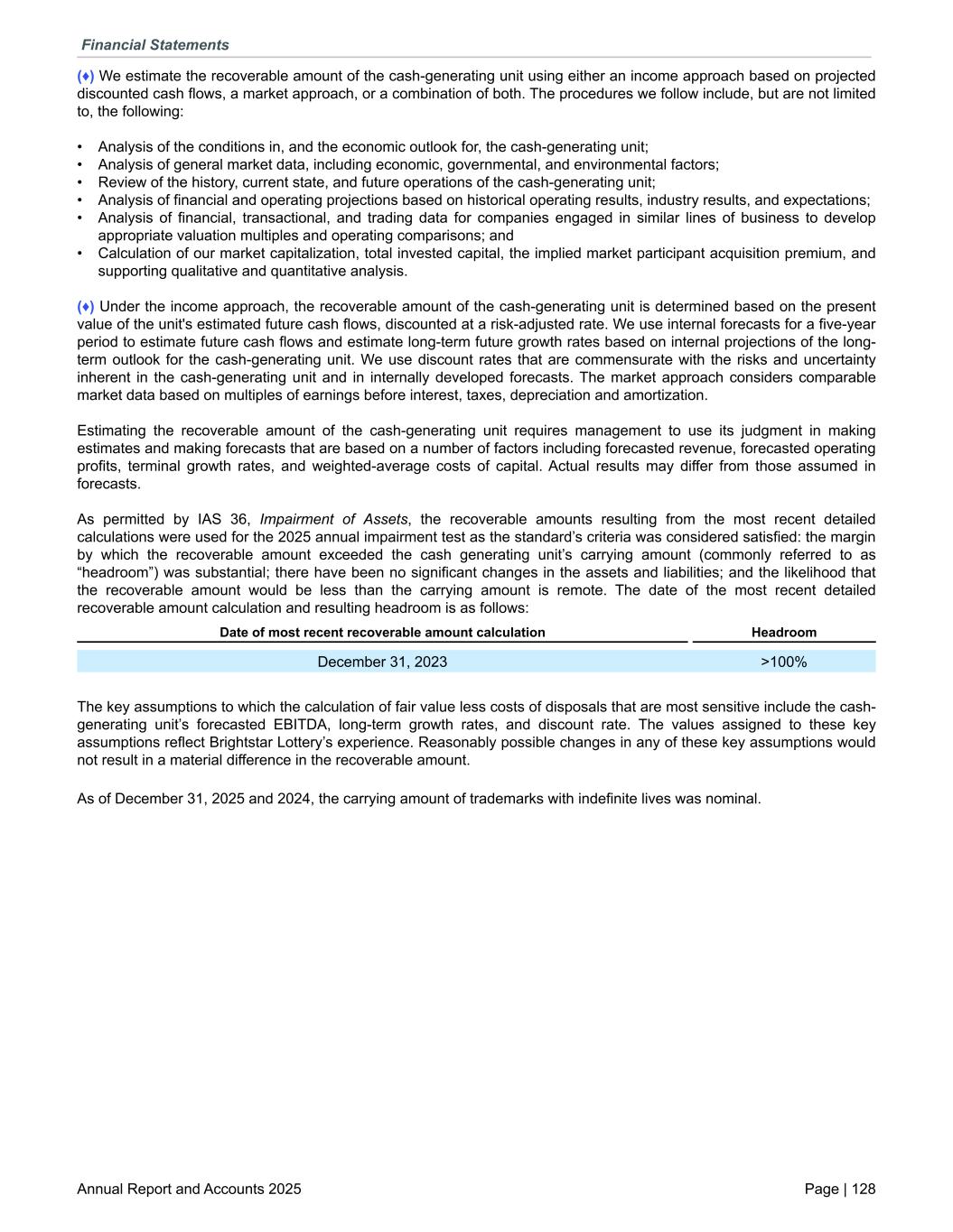 (♦) We estimate the recoverable amount of the cash-generating unit using either an income approach based on projected discounted cash flows, a market approach, or a combination of both. The procedures we follow include, but are not limited to, the following: • Analysis of the conditions in, and the economic outlook for, the cash-generating unit; • Analysis of general market data, including economic, governmental, and environmental factors; • Review of the history, current state, and future operations of the cash-generating unit; • Analysis of financial and operating projections based on historical operating results, industry results, and expectations; • Analysis of financial, transactional, and trading data for companies engaged in similar lines of business to develop appropriate valuation multiples and operating comparisons; and • Calculation of our market capitalization, total invested capital, the implied market participant acquisition premium, and supporting qualitative and quantitative analysis. (♦) Under the income approach, the recoverable amount of the cash-generating unit is determined based on the present value of the unit's estimated future cash flows, discounted at a risk-adjusted rate. We use internal forecasts for a five-year period to estimate future cash flows and estimate long-term future growth rates based on internal projections of the long- term outlook for the cash-generating unit. We use discount rates that are commensurate with the risks and uncertainty inherent in the cash-generating unit and in internally developed forecasts. The market approach considers comparable market data based on multiples of earnings before interest, taxes, depreciation and amortization. Estimating the recoverable amount of the cash-generating unit requires management to use its judgment in making estimates and making forecasts that are based on a number of factors including forecasted revenue, forecasted operating profits, terminal growth rates, and weighted-average costs of capital. Actual results may differ from those assumed in forecasts. As permitted by IAS 36, Impairment of Assets, the recoverable amounts resulting from the most recent detailed calculations were used for the 2025 annual impairment test as the standard’s criteria was considered satisfied: the margin by which the recoverable amount exceeded the cash generating unit’s carrying amount (commonly referred to as “headroom”) was substantial; there have been no significant changes in the assets and liabilities; and the likelihood that the recoverable amount would be less than the carrying amount is remote. The date of the most recent detailed recoverable amount calculation and resulting headroom is as follows: Date of most recent recoverable amount calculation Headroom December 31, 2023 >100% The key assumptions to which the calculation of fair value less costs of disposals that are most sensitive include the cash- generating unit’s forecasted EBITDA, long-term growth rates, and discount rate. The values assigned to these key assumptions reflect Brightstar Lottery’s experience. Reasonably possible changes in any of these key assumptions would not result in a material difference in the recoverable amount. As of December 31, 2025 and 2024, the carrying amount of trademarks with indefinite lives was nominal. Financial Statements Annual Report and Accounts 2025 Page | 128