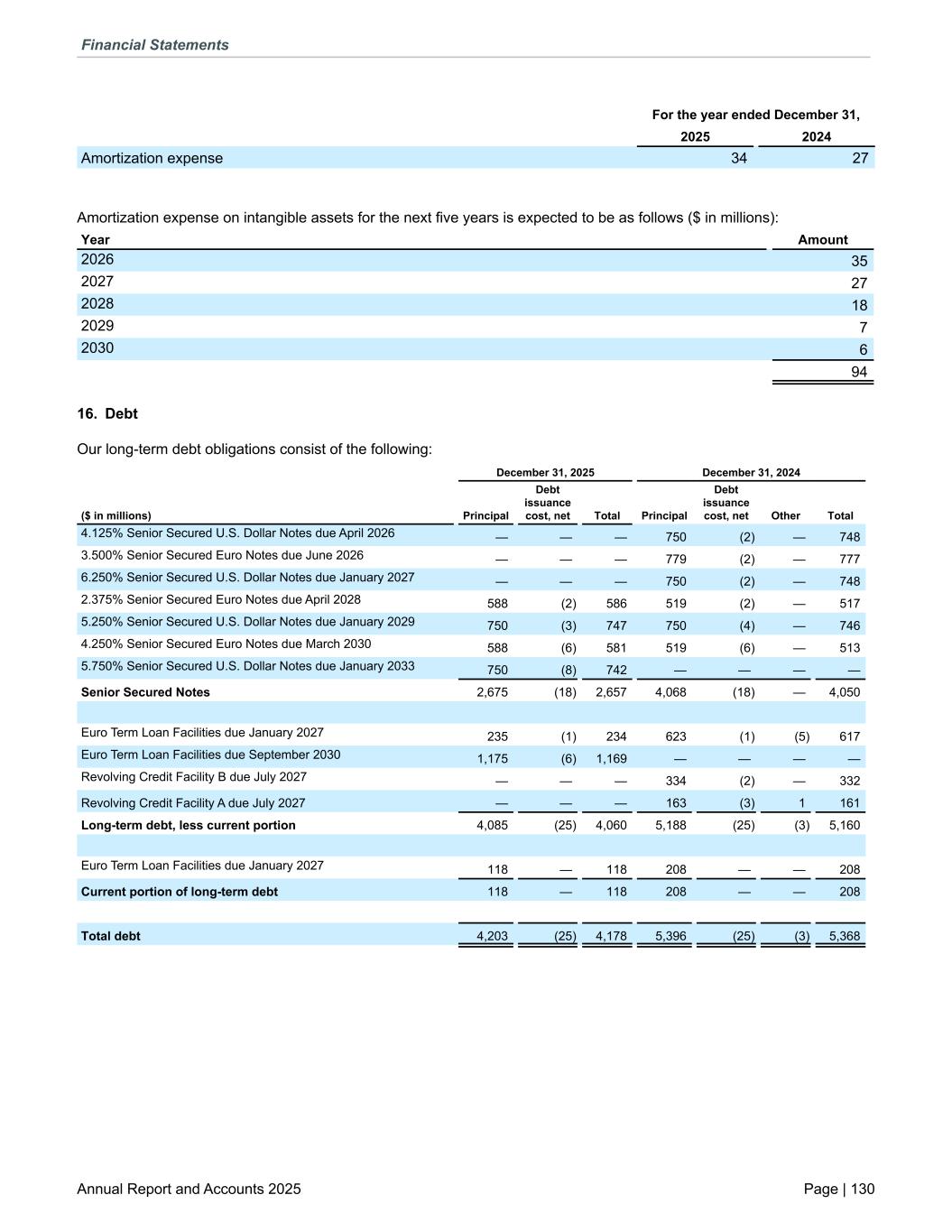 For the year ended December 31, 2025 2024 Amortization expense 34 27 Amortization expense on intangible assets for the next five years is expected to be as follows ($ in millions): Year Amount 2026 35 2027 27 2028 18 2029 7 2030 6 94 16. Debt Our long-term debt obligations consist of the following: December 31, 2025 December 31, 2024 ($ in millions) Principal Debt issuance cost, net Total Principal Debt issuance cost, net Other Total 4.125% Senior Secured U.S. Dollar Notes due April 2026 — — — 750 (2) — 748 3.500% Senior Secured Euro Notes due June 2026 — — — 779 (2) — 777 6.250% Senior Secured U.S. Dollar Notes due January 2027 — — — 750 (2) — 748 2.375% Senior Secured Euro Notes due April 2028 588 (2) 586 519 (2) — 517 5.250% Senior Secured U.S. Dollar Notes due January 2029 750 (3) 747 750 (4) — 746 4.250% Senior Secured Euro Notes due March 2030 588 (6) 581 519 (6) — 513 5.750% Senior Secured U.S. Dollar Notes due January 2033 750 (8) 742 — — — — Senior Secured Notes 2,675 (18) 2,657 4,068 (18) — 4,050 Euro Term Loan Facilities due January 2027 235 (1) 234 623 (1) (5) 617 Euro Term Loan Facilities due September 2030 1,175 (6) 1,169 — — — — Revolving Credit Facility B due July 2027 — — — 334 (2) — 332 Revolving Credit Facility A due July 2027 — — — 163 (3) 1 161 Long-term debt, less current portion 4,085 (25) 4,060 5,188 (25) (3) 5,160 Euro Term Loan Facilities due January 2027 118 — 118 208 — — 208 Current portion of long-term debt 118 — 118 208 — — 208 Total debt 4,203 (25) 4,178 5,396 (25) (3) 5,368 Financial Statements Annual Report and Accounts 2025 Page | 130