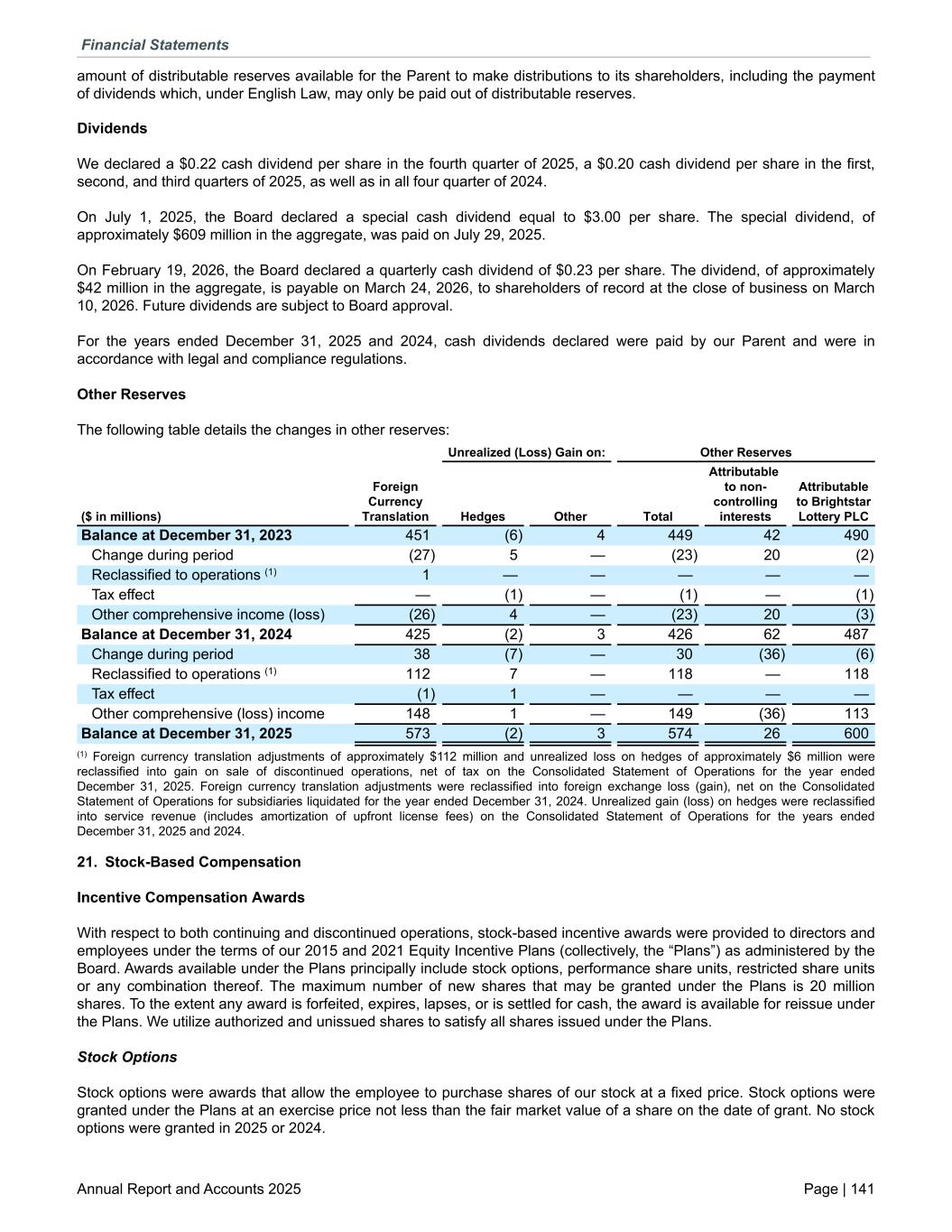 amount of distributable reserves available for the Parent to make distributions to its shareholders, including the payment of dividends which, under English Law, may only be paid out of distributable reserves. Dividends We declared a $0.22 cash dividend per share in the fourth quarter of 2025, a $0.20 cash dividend per share in the first, second, and third quarters of 2025, as well as in all four quarter of 2024. On July 1, 2025, the Board declared a special cash dividend equal to $3.00 per share. The special dividend, of approximately $609 million in the aggregate, was paid on July 29, 2025. On February 19, 2026, the Board declared a quarterly cash dividend of $0.23 per share. The dividend, of approximately $42 million in the aggregate, is payable on March 24, 2026, to shareholders of record at the close of business on March 10, 2026. Future dividends are subject to Board approval. For the years ended December 31, 2025 and 2024, cash dividends declared were paid by our Parent and were in accordance with legal and compliance regulations. Other Reserves The following table details the changes in other reserves: Unrealized (Loss) Gain on: Other Reserves ($ in millions) Foreign Currency Translation Hedges Other Total Attributable to non- controlling interests Attributable to Brightstar Lottery PLC Balance at December 31, 2023 451 (6) 4 449 42 490 Change during period (27) 5 — (23) 20 (2) Reclassified to operations (1) 1 — — — — — Tax effect — (1) — (1) — (1) Other comprehensive income (loss) (26) 4 — (23) 20 (3) Balance at December 31, 2024 425 (2) 3 426 62 487 Change during period 38 (7) — 30 (36) (6) Reclassified to operations (1) 112 7 — 118 — 118 Tax effect (1) 1 — — — — Other comprehensive (loss) income 148 1 — 149 (36) 113 Balance at December 31, 2025 573 (2) 3 574 26 600 (1) Foreign currency translation adjustments of approximately $112 million and unrealized loss on hedges of approximately $6 million were reclassified into gain on sale of discontinued operations, net of tax on the Consolidated Statement of Operations for the year ended December 31, 2025. Foreign currency translation adjustments were reclassified into foreign exchange loss (gain), net on the Consolidated Statement of Operations for subsidiaries liquidated for the year ended December 31, 2024. Unrealized gain (loss) on hedges were reclassified into service revenue (includes amortization of upfront license fees) on the Consolidated Statement of Operations for the years ended December 31, 2025 and 2024. 21. Stock-Based Compensation Incentive Compensation Awards With respect to both continuing and discontinued operations, stock-based incentive awards were provided to directors and employees under the terms of our 2015 and 2021 Equity Incentive Plans (collectively, the “Plans”) as administered by the Board. Awards available under the Plans principally include stock options, performance share units, restricted share units or any combination thereof. The maximum number of new shares that may be granted under the Plans is 20 million shares. To the extent any award is forfeited, expires, lapses, or is settled for cash, the award is available for reissue under the Plans. We utilize authorized and unissued shares to satisfy all shares issued under the Plans. Stock Options Stock options were awards that allow the employee to purchase shares of our stock at a fixed price. Stock options were granted under the Plans at an exercise price not less than the fair market value of a share on the date of grant. No stock options were granted in 2025 or 2024. Financial Statements Annual Report and Accounts 2025 Page | 141