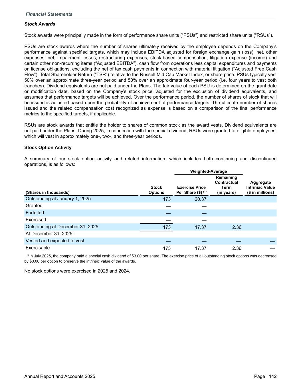 Stock Awards Stock awards were principally made in the form of performance share units (“PSUs”) and restricted share units (“RSUs”). PSUs are stock awards where the number of shares ultimately received by the employee depends on the Company’s performance against specified targets, which may include EBITDA adjusted for foreign exchange gain (loss), net, other expenses, net, impairment losses, restructuring expenses, stock-based compensation, litigation expense (income) and certain other non-recurring items (“Adjusted EBITDA”), cash flow from operations less capital expenditures and payments on license obligations, excluding the net of tax cash payments in connection with material litigation (“Adjusted Free Cash Flow”), Total Shareholder Return (“TSR”) relative to the Russell Mid Cap Market Index, or share price. PSUs typically vest 50% over an approximate three-year period and 50% over an approximate four-year period (i.e. four years to vest both tranches). Dividend equivalents are not paid under the Plans. The fair value of each PSU is determined on the grant date or modification date, based on the Company’s stock price, adjusted for the exclusion of dividend equivalents, and assumes that performance targets will be achieved. Over the performance period, the number of shares of stock that will be issued is adjusted based upon the probability of achievement of performance targets. The ultimate number of shares issued and the related compensation cost recognized as expense is based on a comparison of the final performance metrics to the specified targets, if applicable. RSUs are stock awards that entitle the holder to shares of common stock as the award vests. Dividend equivalents are not paid under the Plans. During 2025, in connection with the special dividend, RSUs were granted to eligible employees, which will vest in approximately one-, two-, and three-year periods. Stock Option Activity A summary of our stock option activity and related information, which includes both continuing and discontinued operations, is as follows: Weighted-Average (Shares in thousands) Stock Options Exercise Price Per Share ($) (1) Remaining Contractual Term (in years) Aggregate Intrinsic Value ($ in millions) Outstanding at January 1, 2025 173 20.37 Granted — — Forfeited — — Exercised — — Outstanding at December 31, 2025 173 17.37 2.36 At December 31, 2025: Vested and expected to vest — — — — Exercisable 173 17.37 2.36 — (1) In July 2025, the company paid a special cash dividend of $3.00 per share. The exercise price of all outstanding stock options was decreased by $3.00 per option to preserve the intrinsic value of the awards. No stock options were exercised in 2025 and 2024. Financial Statements Annual Report and Accounts 2025 Page | 142