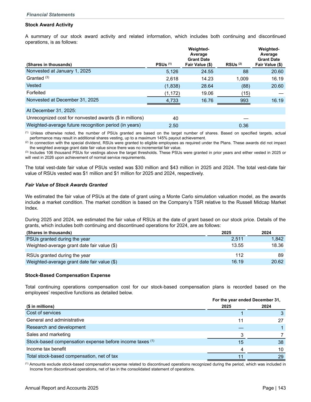 Stock Award Activity A summary of our stock award activity and related information, which includes both continuing and discontinued operations, is as follows: (Shares in thousands) PSUs (1) Weighted- Average Grant Date Fair Value ($) RSUs (2) Weighted- Average Grant Date Fair Value ($) Nonvested at January 1, 2025 5,126 24.55 88 20.60 Granted (3) 2,618 14.23 1,009 16.19 Vested (1,838) 28.64 (88) 20.60 Forfeited (1,172) 19.06 (15) — Nonvested at December 31, 2025 4,733 16.76 993 16.19 At December 31, 2025: Unrecognized cost for nonvested awards ($ in millions) 40 — Weighted-average future recognition period (in years) 2.50 0.36 (1) Unless otherwise noted, the number of PSUs granted are based on the target number of shares. Based on specified targets, actual performance may result in additional shares vesting, up to a maximum 145% payout achievement. (2) In connection with the special dividend, RSUs were granted to eligible employees as required under the Plans. These awards did not impact the weighted average grant date fair value since there was no incremental fair value. (3) Includes 106 thousand PSUs for vestings above the target thresholds. These PSUs were granted in prior years and either vested in 2025 or will vest in 2026 upon achievement of normal service requirements. The total vest-date fair value of PSUs vested was $30 million and $43 million in 2025 and 2024. The total vest-date fair value of RSUs vested was $1 million and $1 million for 2025 and 2024, respectively. Fair Value of Stock Awards Granted We estimated the fair value of PSUs at the date of grant using a Monte Carlo simulation valuation model, as the awards include a market condition. The market condition is based on the Company’s TSR relative to the Russell Midcap Market Index. During 2025 and 2024, we estimated the fair value of RSUs at the date of grant based on our stock price. Details of the grants, which includes both continuing and discontinued operations for 2024, are as follows: (Shares in thousands) 2025 2024 PSUs granted during the year 2,511 1,842 Weighted-average grant date fair value ($) 13.55 18.36 RSUs granted during the year 112 89 Weighted-average grant date fair value ($) 16.19 20.62 Stock-Based Compensation Expense Total continuing operations compensation cost for our stock-based compensation plans is recorded based on the employees’ respective functions as detailed below. For the year ended December 31, ($ in millions) 2025 2024 Cost of services 1 3 General and administrative 11 27 Research and development — 1 Sales and marketing 3 7 Stock-based compensation expense before income taxes (1) 15 38 Income tax benefit 4 10 Total stock-based compensation, net of tax 11 29 (1) Amounts exclude stock-based compensation expense related to discontinued operations recognized during the period, which was included in Income from discontinued operations, net of tax in the consolidated statement of operations. Financial Statements Annual Report and Accounts 2025 Page | 143