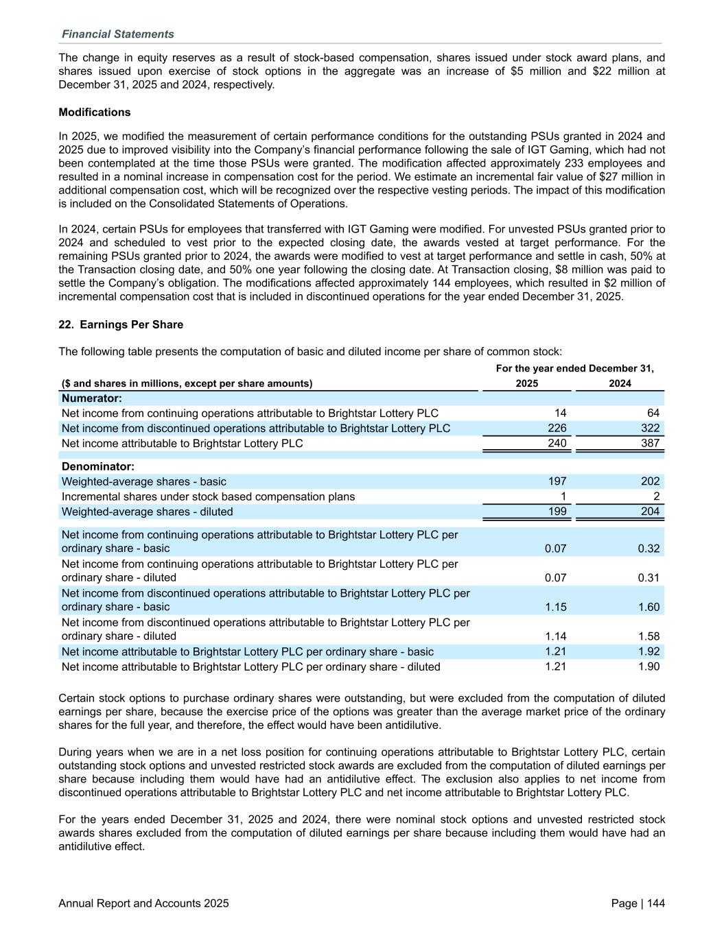 The change in equity reserves as a result of stock-based compensation, shares issued under stock award plans, and shares issued upon exercise of stock options in the aggregate was an increase of $5 million and $22 million at December 31, 2025 and 2024, respectively. Modifications In 2025, we modified the measurement of certain performance conditions for the outstanding PSUs granted in 2024 and 2025 due to improved visibility into the Company’s financial performance following the sale of IGT Gaming, which had not been contemplated at the time those PSUs were granted. The modification affected approximately 233 employees and resulted in a nominal increase in compensation cost for the period. We estimate an incremental fair value of $27 million in additional compensation cost, which will be recognized over the respective vesting periods. The impact of this modification is included on the Consolidated Statements of Operations. In 2024, certain PSUs for employees that transferred with IGT Gaming were modified. For unvested PSUs granted prior to 2024 and scheduled to vest prior to the expected closing date, the awards vested at target performance. For the remaining PSUs granted prior to 2024, the awards were modified to vest at target performance and settle in cash, 50% at the Transaction closing date, and 50% one year following the closing date. At Transaction closing, $8 million was paid to settle the Company’s obligation. The modifications affected approximately 144 employees, which resulted in $2 million of incremental compensation cost that is included in discontinued operations for the year ended December 31, 2025. 22. Earnings Per Share The following table presents the computation of basic and diluted income per share of common stock: For the year ended December 31, ($ and shares in millions, except per share amounts) 2025 2024 Numerator: Net income from continuing operations attributable to Brightstar Lottery PLC 14 64 Net income from discontinued operations attributable to Brightstar Lottery PLC 226 322 Net income attributable to Brightstar Lottery PLC 240 387 Denominator: Weighted-average shares - basic 197 202 Incremental shares under stock based compensation plans 1 2 Weighted-average shares - diluted 199 204 Net income from continuing operations attributable to Brightstar Lottery PLC per ordinary share - basic 0.07 0.32 Net income from continuing operations attributable to Brightstar Lottery PLC per ordinary share - diluted 0.07 0.31 Net income from discontinued operations attributable to Brightstar Lottery PLC per ordinary share - basic 1.15 1.60 Net income from discontinued operations attributable to Brightstar Lottery PLC per ordinary share - diluted 1.14 1.58 Net income attributable to Brightstar Lottery PLC per ordinary share - basic 1.21 1.92 Net income attributable to Brightstar Lottery PLC per ordinary share - diluted 1.21 1.90 Certain stock options to purchase ordinary shares were outstanding, but were excluded from the computation of diluted earnings per share, because the exercise price of the options was greater than the average market price of the ordinary shares for the full year, and therefore, the effect would have been antidilutive. During years when we are in a net loss position for continuing operations attributable to Brightstar Lottery PLC, certain outstanding stock options and unvested restricted stock awards are excluded from the computation of diluted earnings per share because including them would have had an antidilutive effect. The exclusion also applies to net income from discontinued operations attributable to Brightstar Lottery PLC and net income attributable to Brightstar Lottery PLC. For the years ended December 31, 2025 and 2024, there were nominal stock options and unvested restricted stock awards shares excluded from the computation of diluted earnings per share because including them would have had an antidilutive effect. Financial Statements Annual Report and Accounts 2025 Page | 144