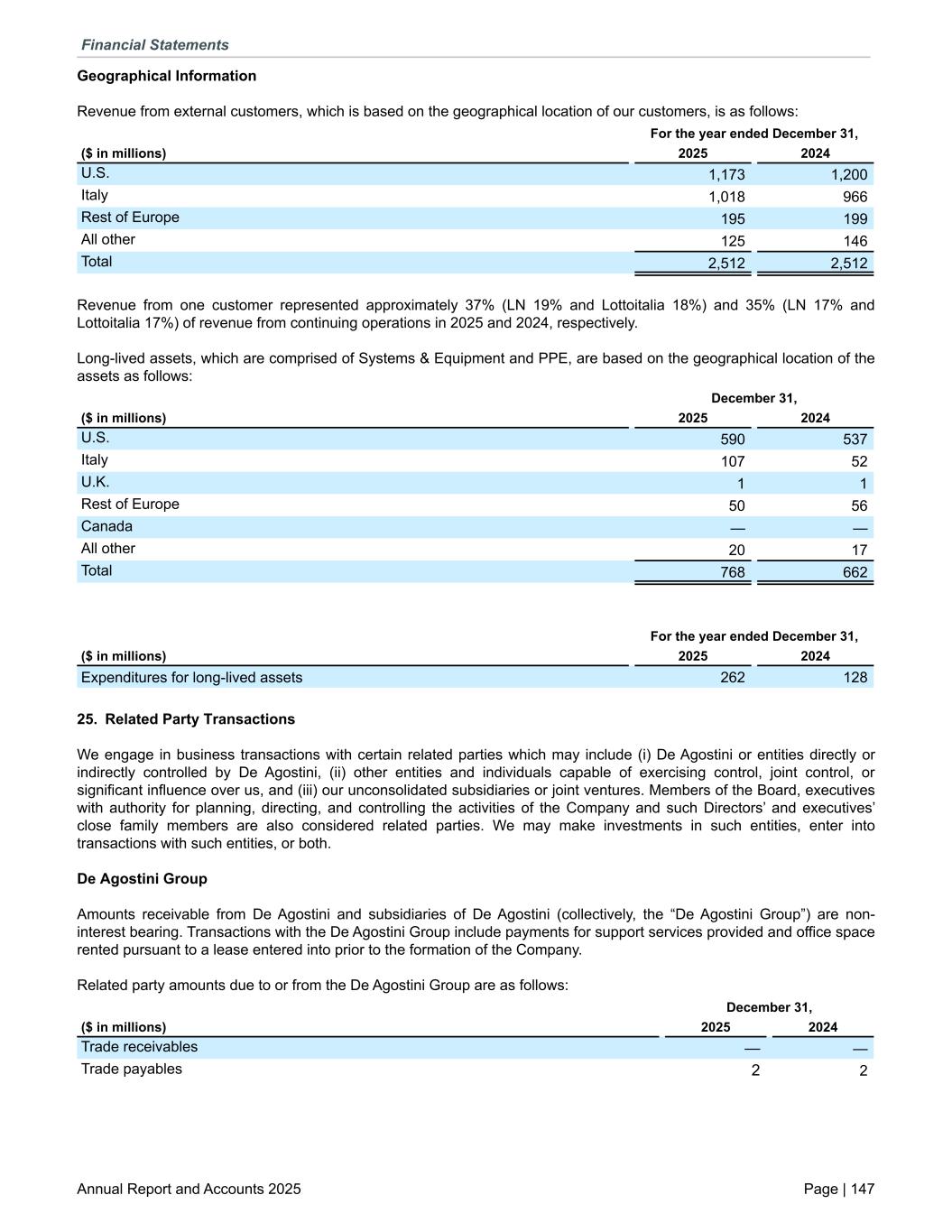 Geographical Information Revenue from external customers, which is based on the geographical location of our customers, is as follows: For the year ended December 31, ($ in millions) 2025 2024 U.S. 1,173 1,200 Italy 1,018 966 Rest of Europe 195 199 All other 125 146 Total 2,512 2,512 Revenue from one customer represented approximately 37% (LN 19% and Lottoitalia 18%) and 35% (LN 17% and Lottoitalia 17%) of revenue from continuing operations in 2025 and 2024, respectively. Long-lived assets, which are comprised of Systems & Equipment and PPE, are based on the geographical location of the assets as follows: December 31, ($ in millions) 2025 2024 U.S. 590 537 Italy 107 52 U.K. 1 1 Rest of Europe 50 56 Canada — — All other 20 17 Total 768 662 For the year ended December 31, ($ in millions) 2025 2024 Expenditures for long-lived assets 262 128 25. Related Party Transactions We engage in business transactions with certain related parties which may include (i) De Agostini or entities directly or indirectly controlled by De Agostini, (ii) other entities and individuals capable of exercising control, joint control, or significant influence over us, and (iii) our unconsolidated subsidiaries or joint ventures. Members of the Board, executives with authority for planning, directing, and controlling the activities of the Company and such Directors’ and executives’ close family members are also considered related parties. We may make investments in such entities, enter into transactions with such entities, or both. De Agostini Group Amounts receivable from De Agostini and subsidiaries of De Agostini (collectively, the “De Agostini Group”) are non- interest bearing. Transactions with the De Agostini Group include payments for support services provided and office space rented pursuant to a lease entered into prior to the formation of the Company. Related party amounts due to or from the De Agostini Group are as follows: December 31, ($ in millions) 2025 2024 Trade receivables — — Trade payables 2 2 Financial Statements Annual Report and Accounts 2025 Page | 147