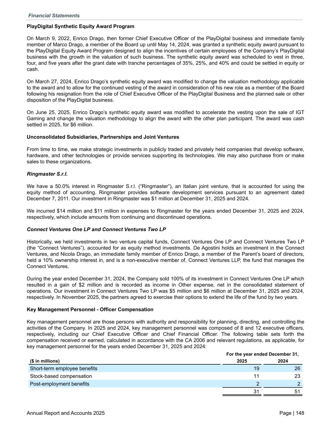 PlayDigital Synthetic Equity Award Program On March 9, 2022, Enrico Drago, then former Chief Executive Officer of the PlayDigital business and immediate family member of Marco Drago, a member of the Board up until May 14, 2024, was granted a synthetic equity award pursuant to the PlayDigital Equity Award Program designed to align the incentives of certain employees of the Company’s PlayDigital business with the growth in the valuation of such business. The synthetic equity award was scheduled to vest in three, four, and five years after the grant date with tranche percentages of 35%, 25%, and 40% and could be settled in equity or cash. On March 27, 2024, Enrico Drago’s synthetic equity award was modified to change the valuation methodology applicable to the award and to allow for the continued vesting of the award in consideration of his new role as a member of the Board following his resignation from the role of Chief Executive Officer of the PlayDigital Business and the planned sale or other disposition of the PlayDigital business. On June 25, 2025, Enrico Drago’s synthetic equity award was modified to accelerate the vesting upon the sale of IGT Gaming and change the valuation methodology to align the award with the other plan participant. The award was cash settled in 2025, for $6 million. Unconsolidated Subsidiaries, Partnerships and Joint Ventures From time to time, we make strategic investments in publicly traded and privately held companies that develop software, hardware, and other technologies or provide services supporting its technologies. We may also purchase from or make sales to these organizations. Ringmaster S.r.l. We have a 50.0% interest in Ringmaster S.r.l. (“Ringmaster”), an Italian joint venture, that is accounted for using the equity method of accounting. Ringmaster provides software development services pursuant to an agreement dated December 7, 2011. Our investment in Ringmaster was $1 million at December 31, 2025 and 2024. We incurred $14 million and $11 million in expenses to Ringmaster for the years ended December 31, 2025 and 2024, respectively, which include amounts from continuing and discontinued operations. Connect Ventures One LP and Connect Ventures Two LP Historically, we held investments in two venture capital funds, Connect Ventures One LP and Connect Ventures Two LP (the “Connect Ventures”), accounted for as equity method investments. De Agostini holds an investment in the Connect Ventures, and Nicola Drago, an immediate family member of Enrico Drago, a member of the Parent’s board of directors, held a 10% ownership interest in, and is a non-executive member of, Connect Ventures LLP, the fund that manages the Connect Ventures. During the year ended December 31, 2024, the Company sold 100% of its investment in Connect Ventures One LP which resulted in a gain of $2 million and is recorded as income in Other expense, net in the consolidated statement of operations. Our investment in Connect Ventures Two LP was $5 million and $6 million at December 31, 2025 and 2024, respectively. In November 2025, the partners agreed to exercise their options to extend the life of the fund by two years. Key Management Personnel - Officer Compensation Key management personnel are those persons with authority and responsibility for planning, directing, and controlling the activities of the Company. In 2025 and 2024, key management personnel was composed of 8 and 12 executive officers, respectively, including our Chief Executive Officer and Chief Financial Officer. The following table sets forth the compensation received or earned, calculated in accordance with the CA 2006 and relevant regulations, as applicable, for key management personnel for the years ended December 31, 2025 and 2024: For the year ended December 31, ($ in millions) 2025 2024 Short-term employee benefits 19 26 Stock-based compensation 11 23 Post-employment benefits 2 2 31 51 Financial Statements Annual Report and Accounts 2025 Page | 148