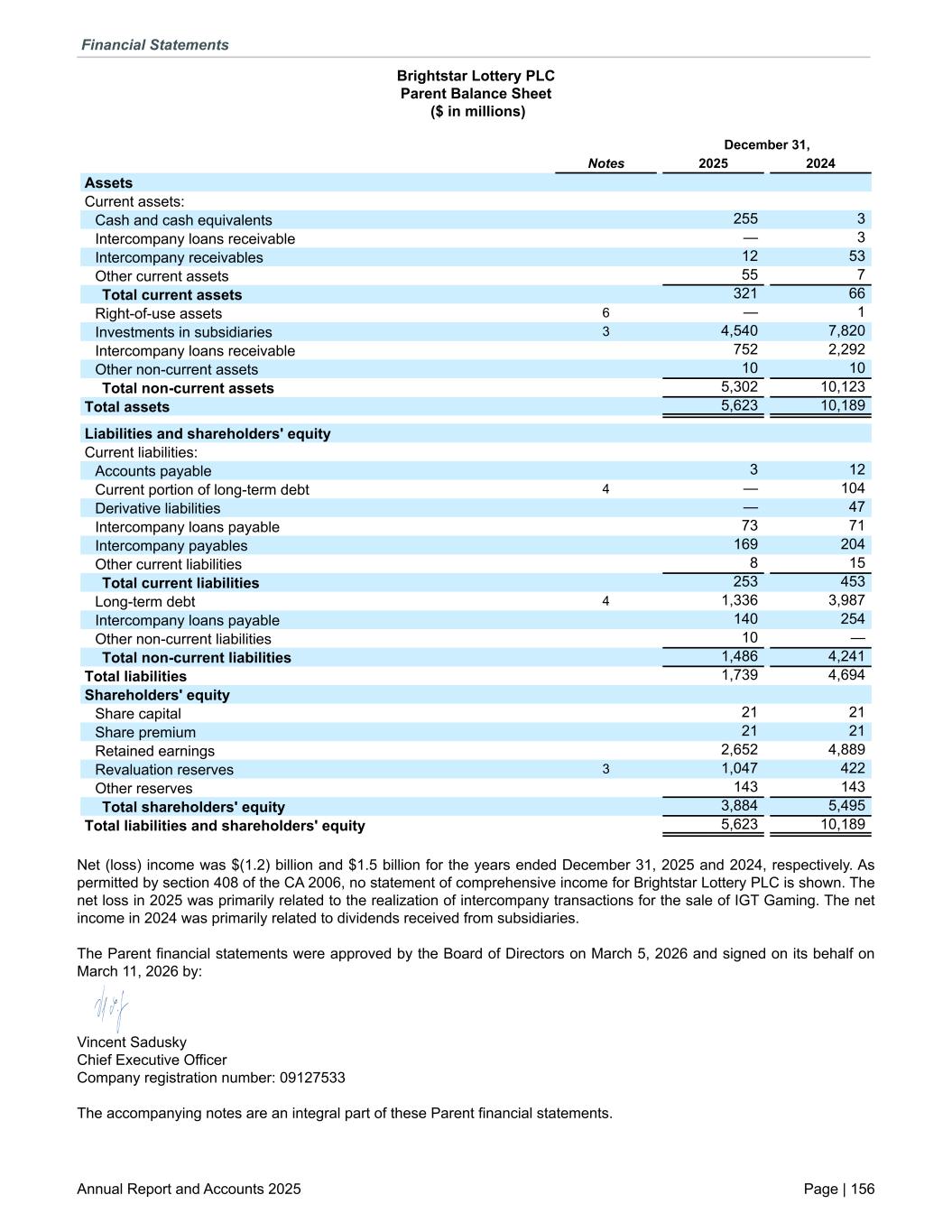 Brightstar Lottery PLC Parent Balance Sheet ($ in millions) December 31, Notes 2025 2024 Assets Current assets: Cash and cash equivalents 255 3 Intercompany loans receivable — 3 Intercompany receivables 12 53 Other current assets 55 7 Total current assets 321 66 Right-of-use assets 6 — 1 Investments in subsidiaries 3 4,540 7,820 Intercompany loans receivable 752 2,292 Other non-current assets 10 10 Total non-current assets 5,302 10,123 Total assets 5,623 10,189 Liabilities and shareholders' equity Current liabilities: Accounts payable 3 12 Current portion of long-term debt 4 — 104 Derivative liabilities — 47 Intercompany loans payable 73 71 Intercompany payables 169 204 Other current liabilities 8 15 Total current liabilities 253 453 Long-term debt 4 1,336 3,987 Intercompany loans payable 140 254 Other non-current liabilities 10 — Total non-current liabilities 1,486 4,241 Total liabilities 1,739 4,694 Shareholders' equity Share capital 21 21 Share premium 21 21 Retained earnings 2,652 4,889 Revaluation reserves 3 1,047 422 Other reserves 143 143 Total shareholders' equity 3,884 5,495 Total liabilities and shareholders' equity 5,623 10,189 Net (loss) income was $(1.2) billion and $1.5 billion for the years ended December 31, 2025 and 2024, respectively. As permitted by section 408 of the CA 2006, no statement of comprehensive income for Brightstar Lottery PLC is shown. The net loss in 2025 was primarily related to the realization of intercompany transactions for the sale of IGT Gaming. The net income in 2024 was primarily related to dividends received from subsidiaries. The Parent financial statements were approved by the Board of Directors on March 5, 2026 and signed on its behalf on March 11, 2026 by: Vincent Sadusky Chief Executive Officer Company registration number: 09127533 The accompanying notes are an integral part of these Parent financial statements. Financial Statements Annual Report and Accounts 2025 Page | 156